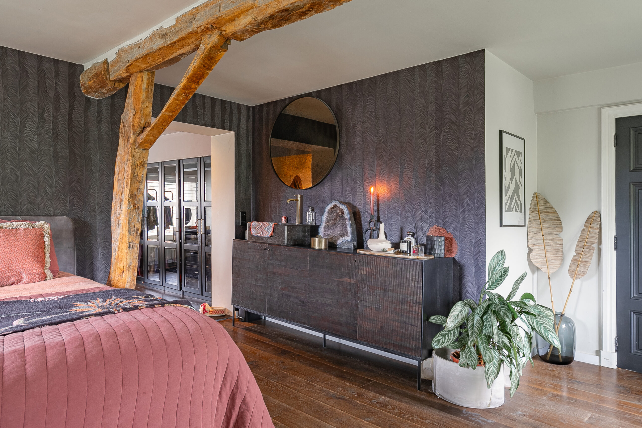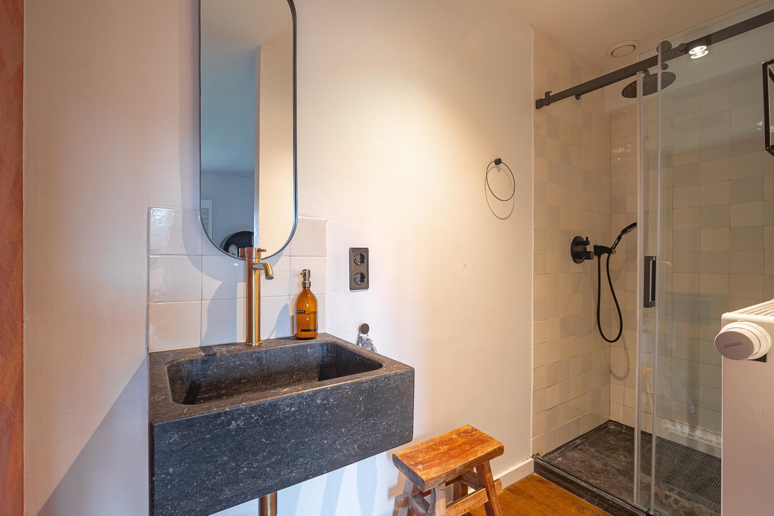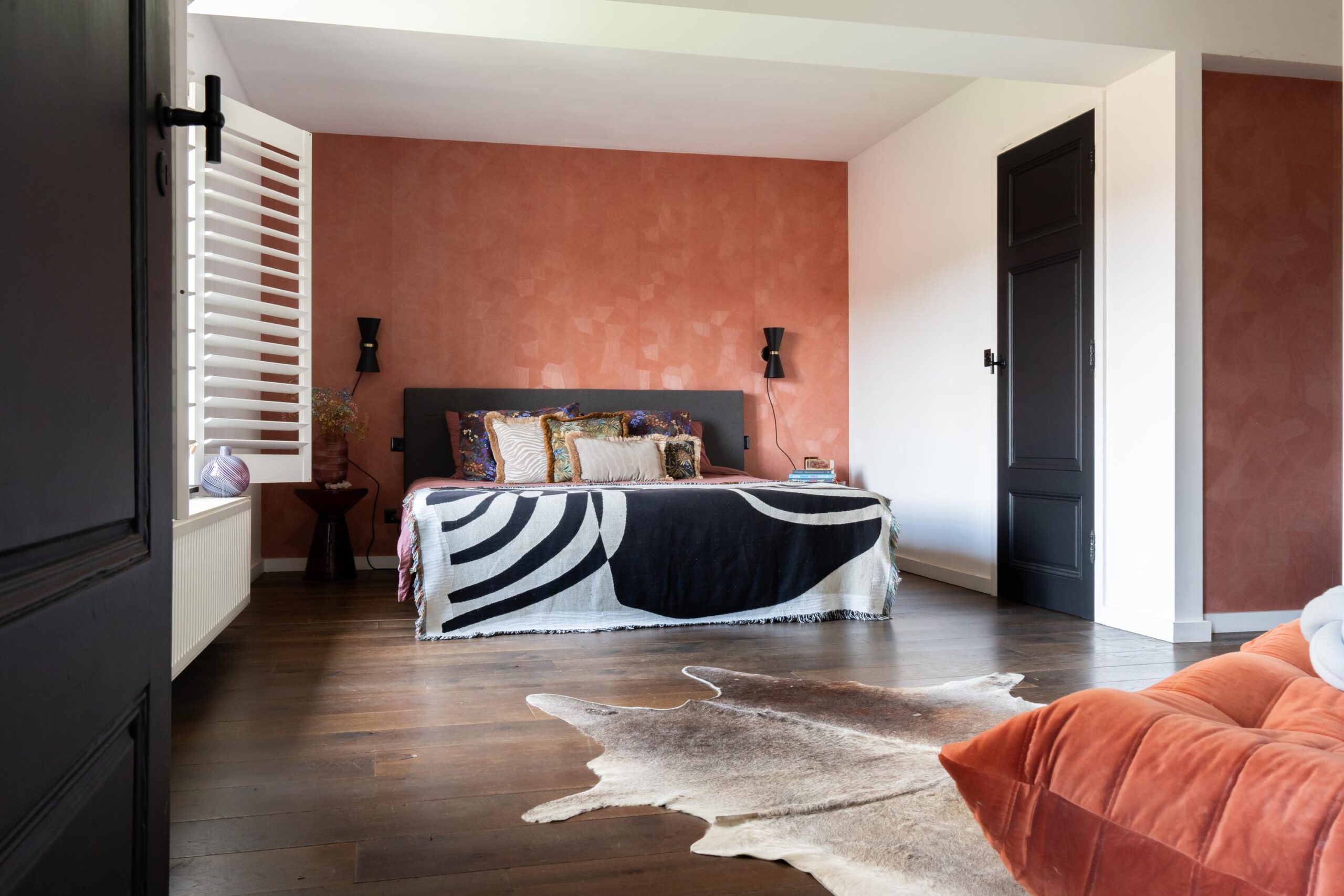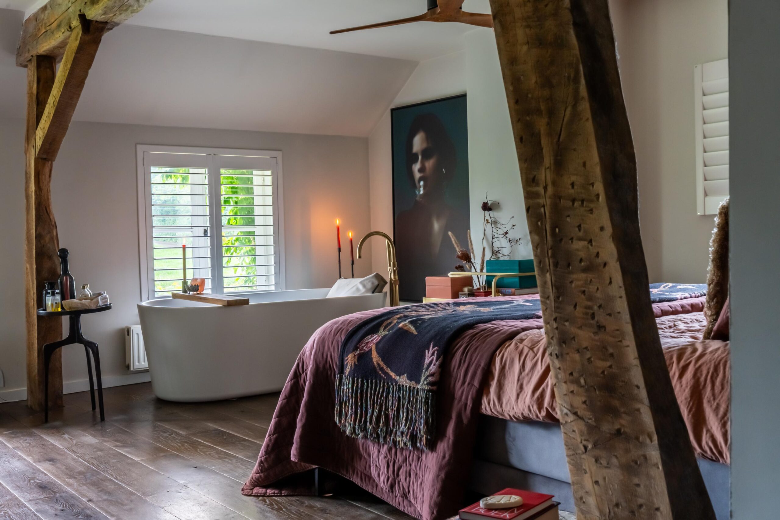 Tweede sfeervolle slaapkamer 26 m2 (gastenkamer) eveneens met een antieke planken vloer en gepende balken en uitgevoerd met een luxe badkamer voorzien van een douche, wastafel en toilet groot ca. 26 m²