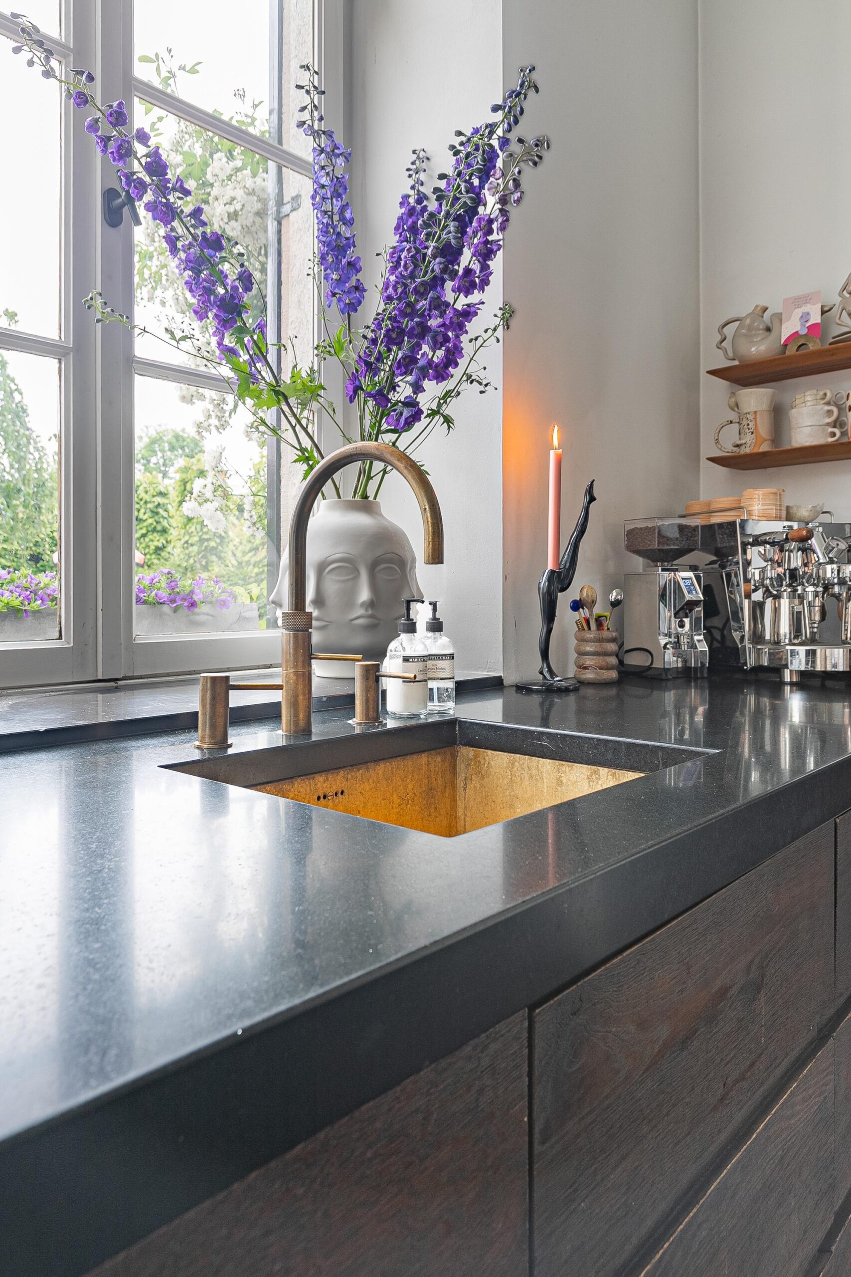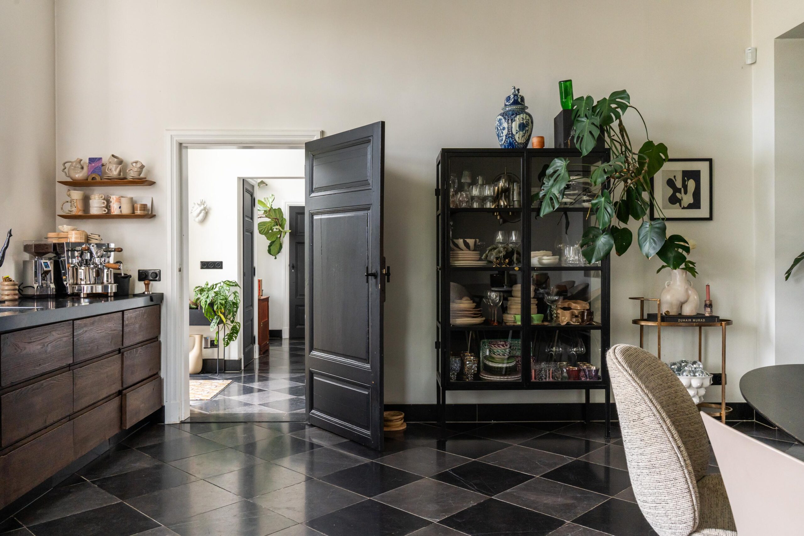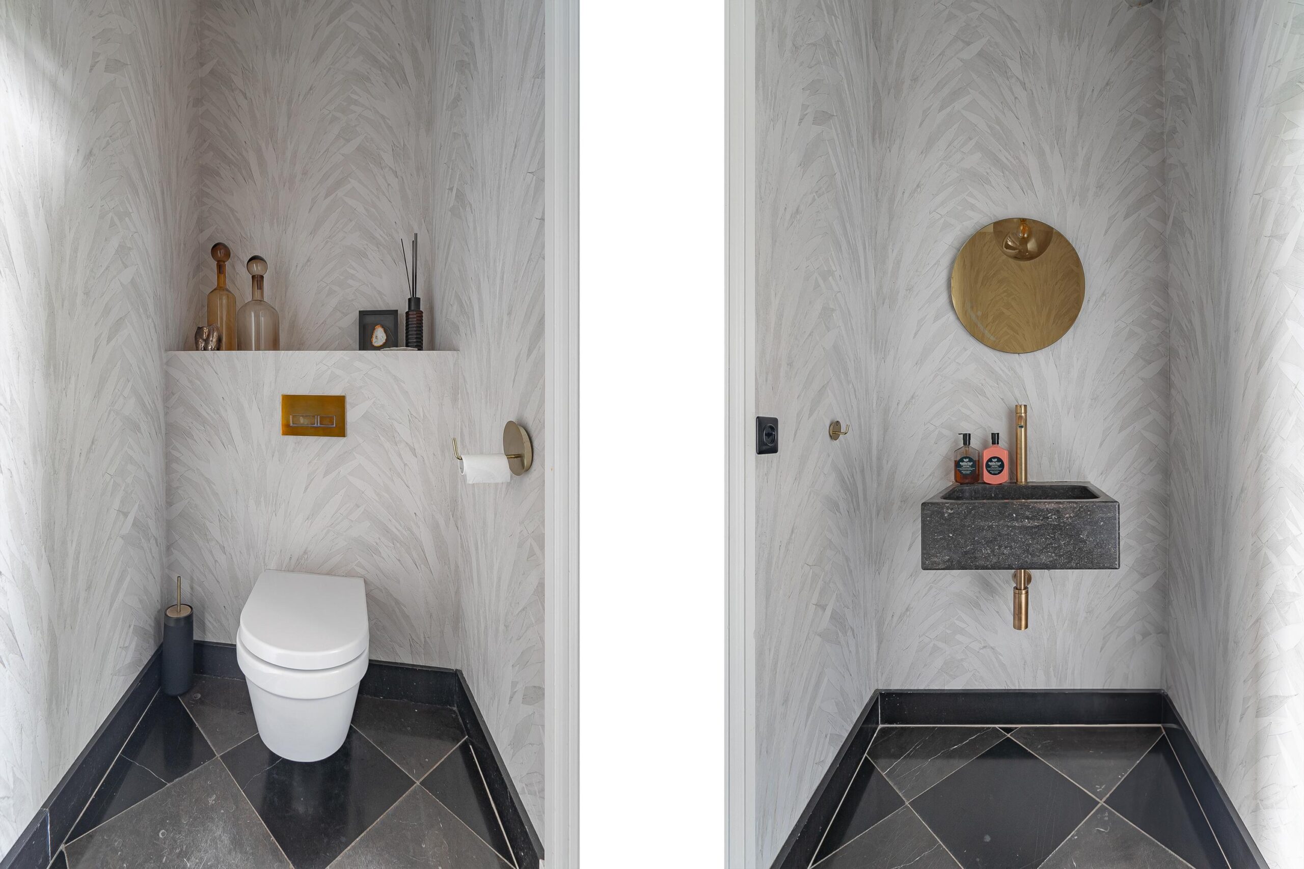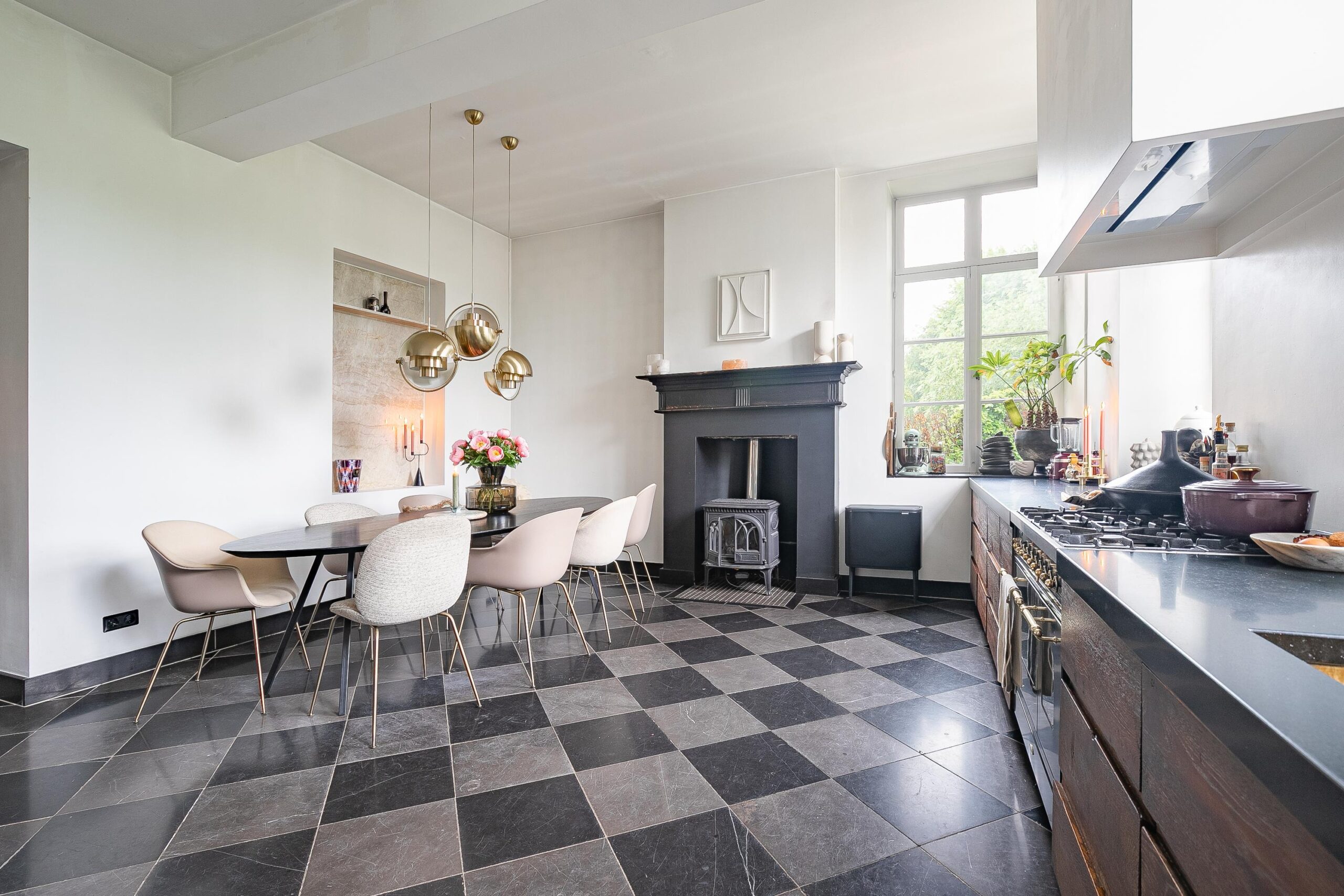Statige entree met toegang tot een centrale hal 10.30 x 2.00 m. voorzien van een natuurstenen vloer uit hardsteen (kerkenvloer). De hal is voorzien van een garderobe en een luxe afgewerkt toiletruimte voorzien van een zwevend toilet en hardstenen vaste wastafel. Vanuit de hal bereikbare royale leef-eetkeuken met een open verbinding naar een sfeervolle woonkamer. De keuken en woonkamer (55m2) zijn eveneens voorzien van hardstenen vloeren. De keukeninstallatie mag bijzonder praktisch en efficiënt genoemd worden en is voorzien van hoogwaardige keuken apparatuur waaronder een 6-pits fornuis/oven (Boretti), geïntegreerde afzuigkap, twee koelkasten en een vaatwasser. De sfeer van deze leef-eetkeuken wordt gestimuleerd door een prachtige openhaard partij voorzien van een allesbrander.