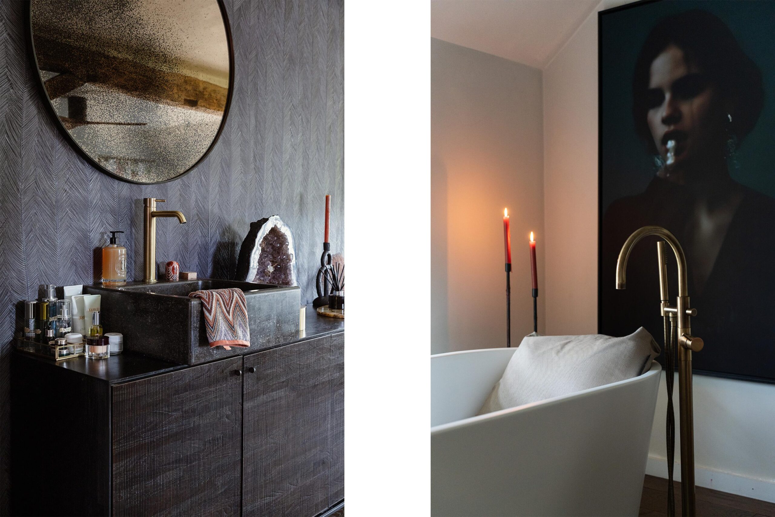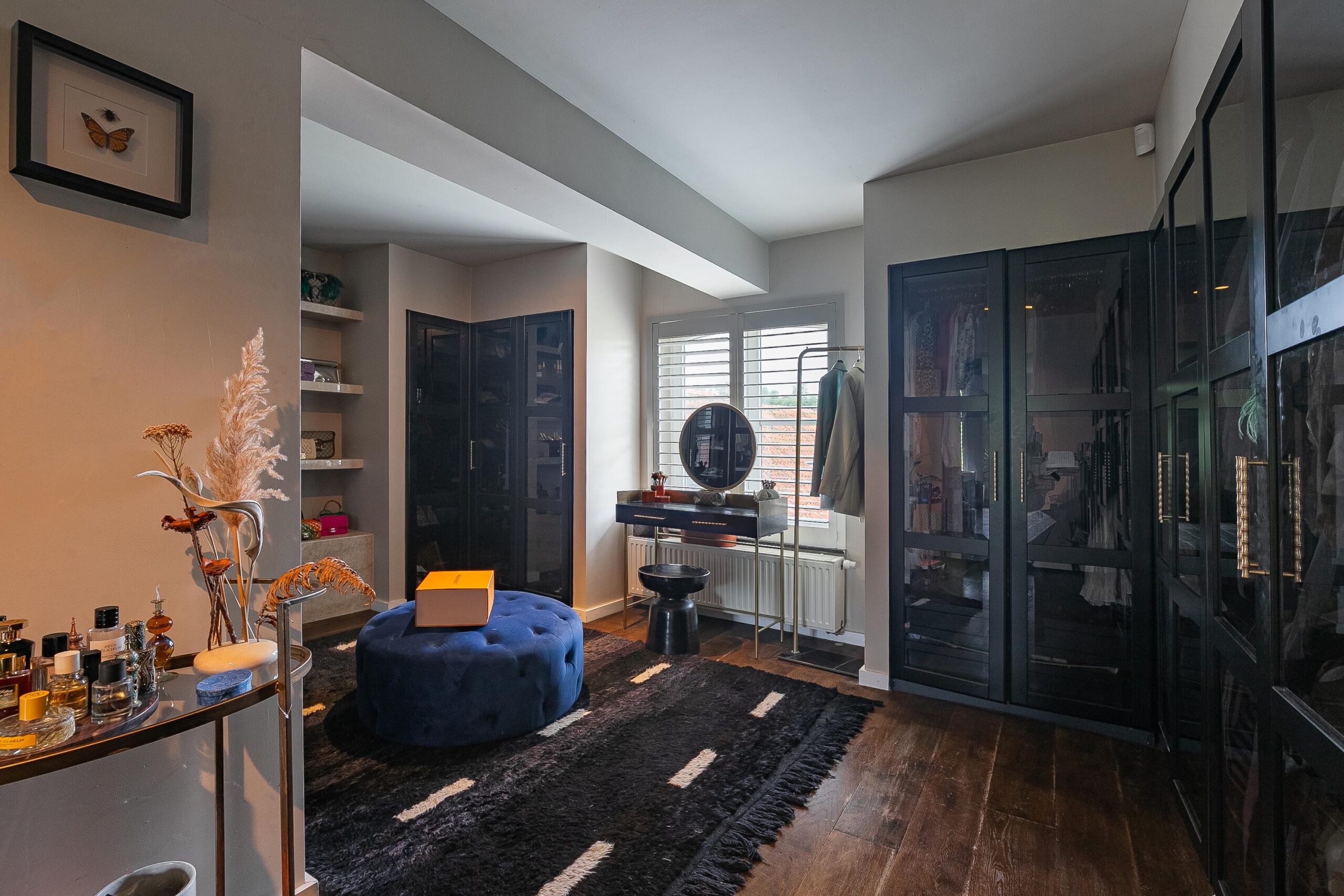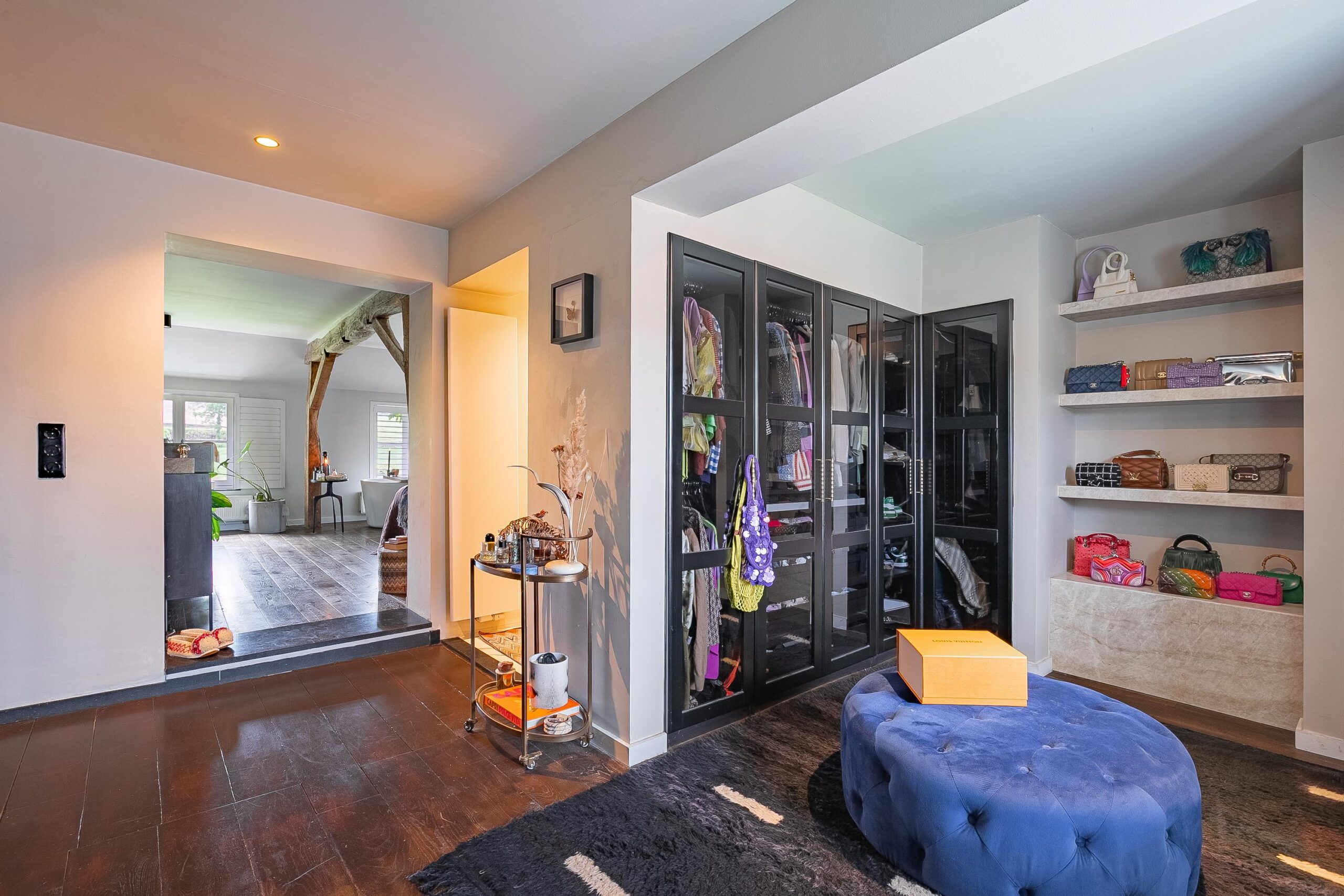 Ouderslaapkamer (26m2) met garderoberuimte (walk-in closet). Deze bijzonder ruime slaapkamer is voorzien van een vrijstaand design bad, douche en wastafel groot. ca 53 m². De prachtige traditionele balkenplafond en de brede houten planken vloeren completeren het geheel.