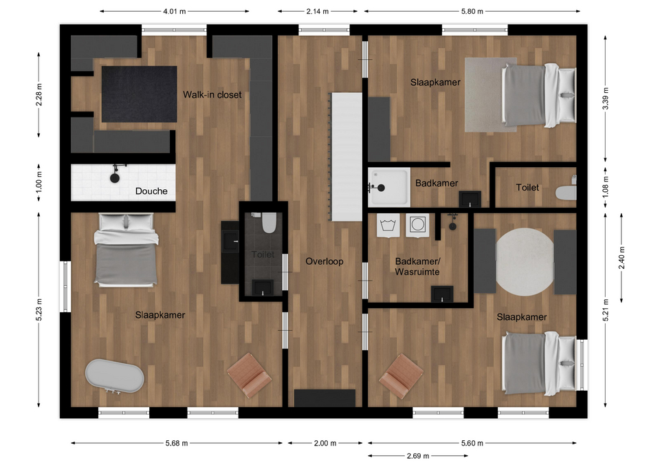 Derde ruime slaapkamer groot ca. 22 m². Met een kleine aanpassing kan de douche van de separate ruimte bij deze slaapkamer worden getrokken.