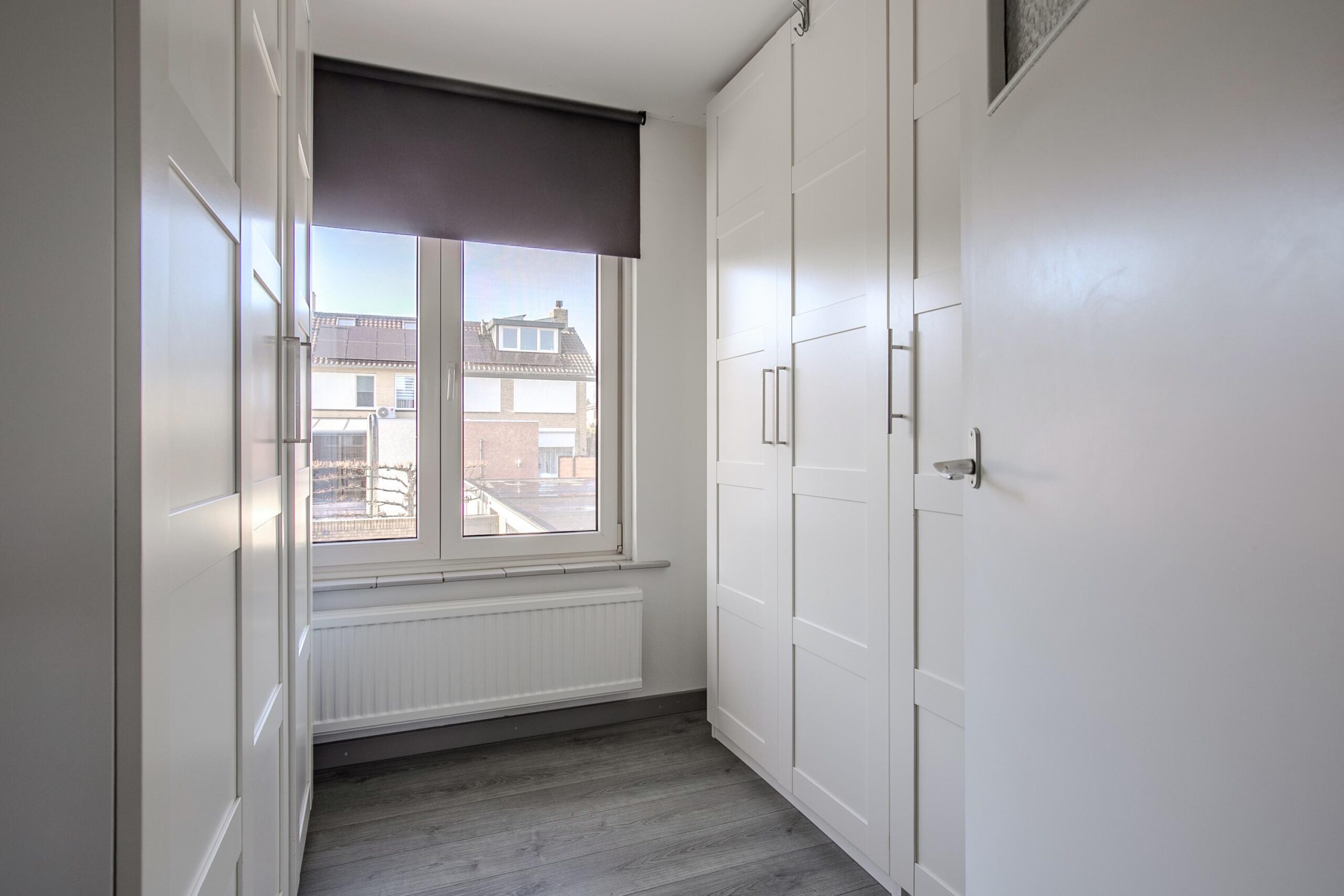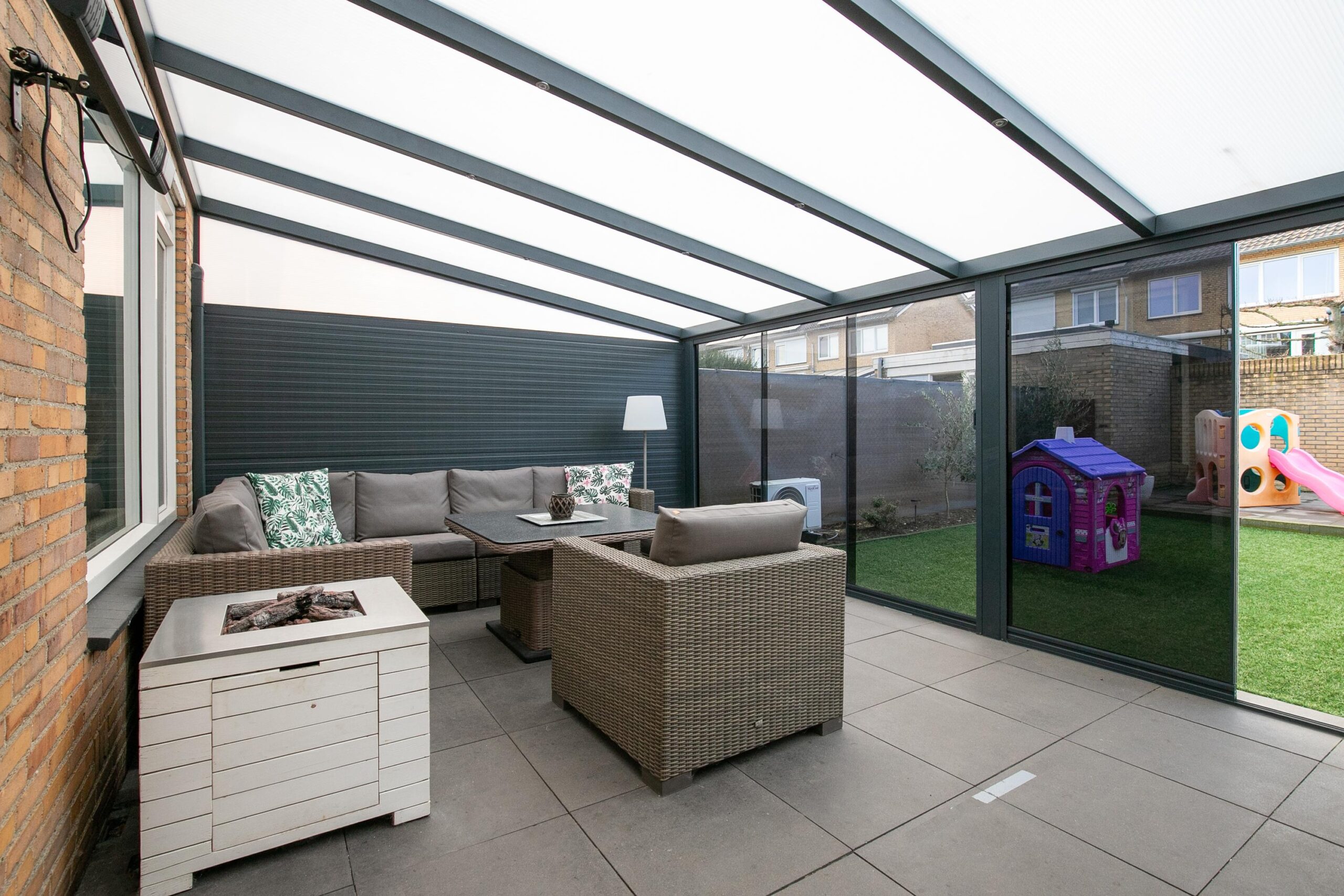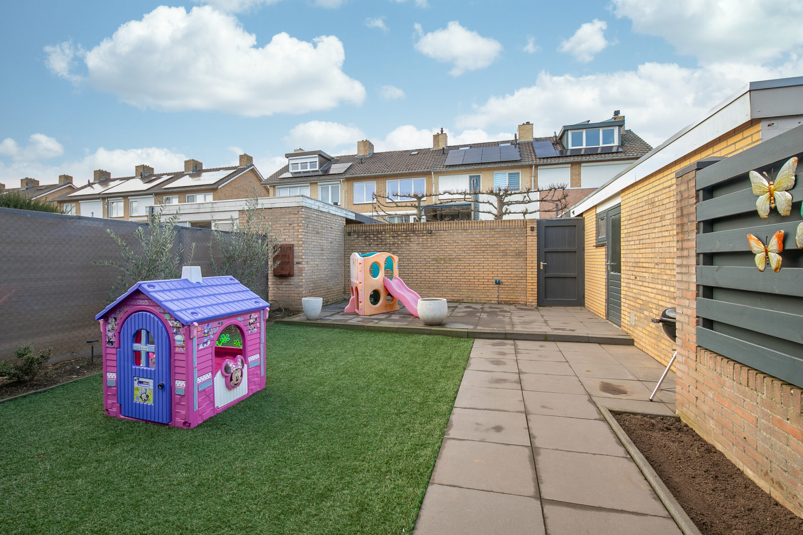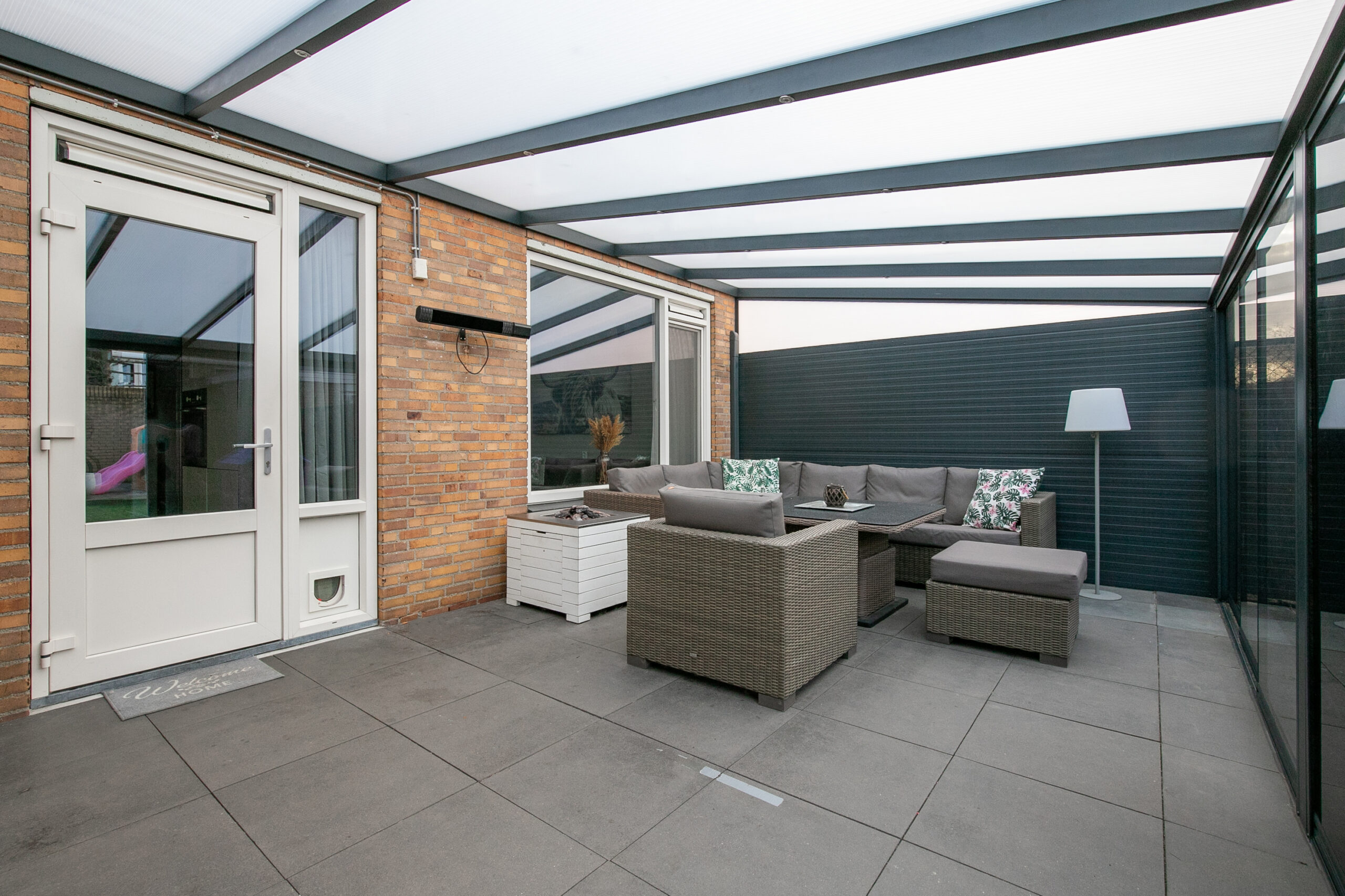 Vanuit de keuken is de luxe overkapping bereikbaar. Deze is royaal 6.40 x 3.95 en is voorzien van glazen schuifpanelen, zo kun je lekker veel buiten zitten. De tuin is onderhoudsvriendelijk en ongeveer 12 meter diep en ligt op het noordwesten, hier is de hele dag een plek in de zon. Vanuit de achtertuin is er een poortje die als achteringang naar het achtergelegen pad gebruikt kan worden en is de garage bereikbaar. Deze garage is 5.82 x 3.04 en heeft een sectionaal poort, deze garage is met de auto bereikbaar vanaf de Admiraal Helfrichstraat.