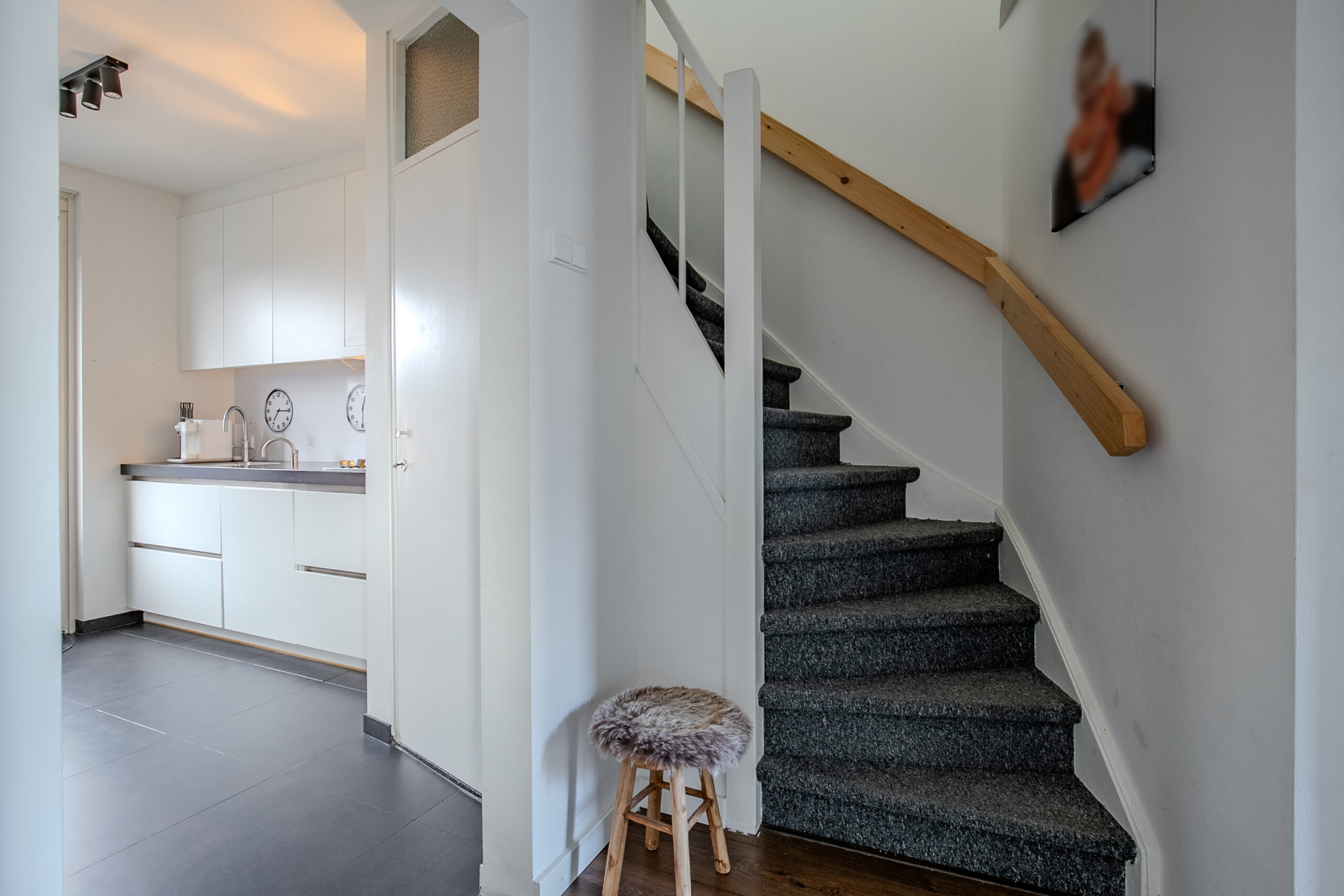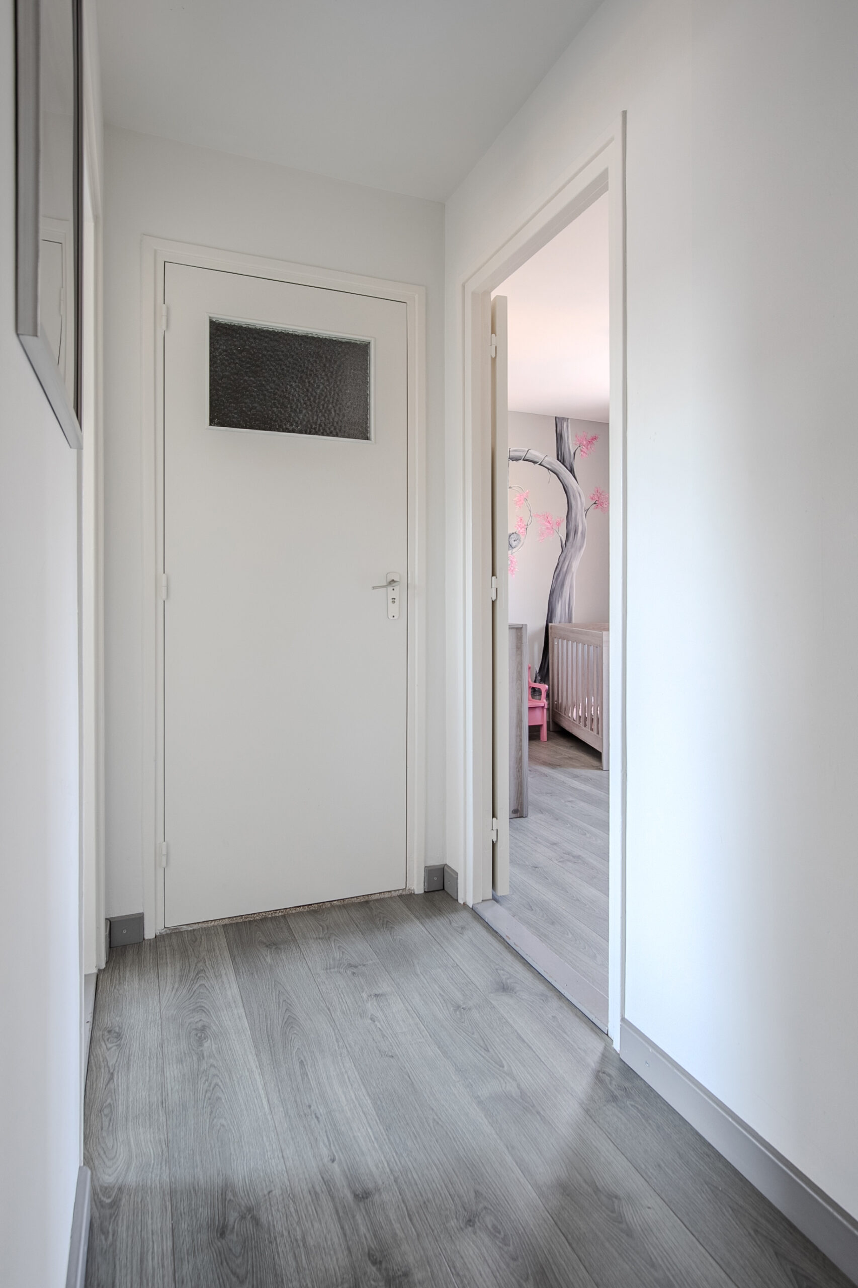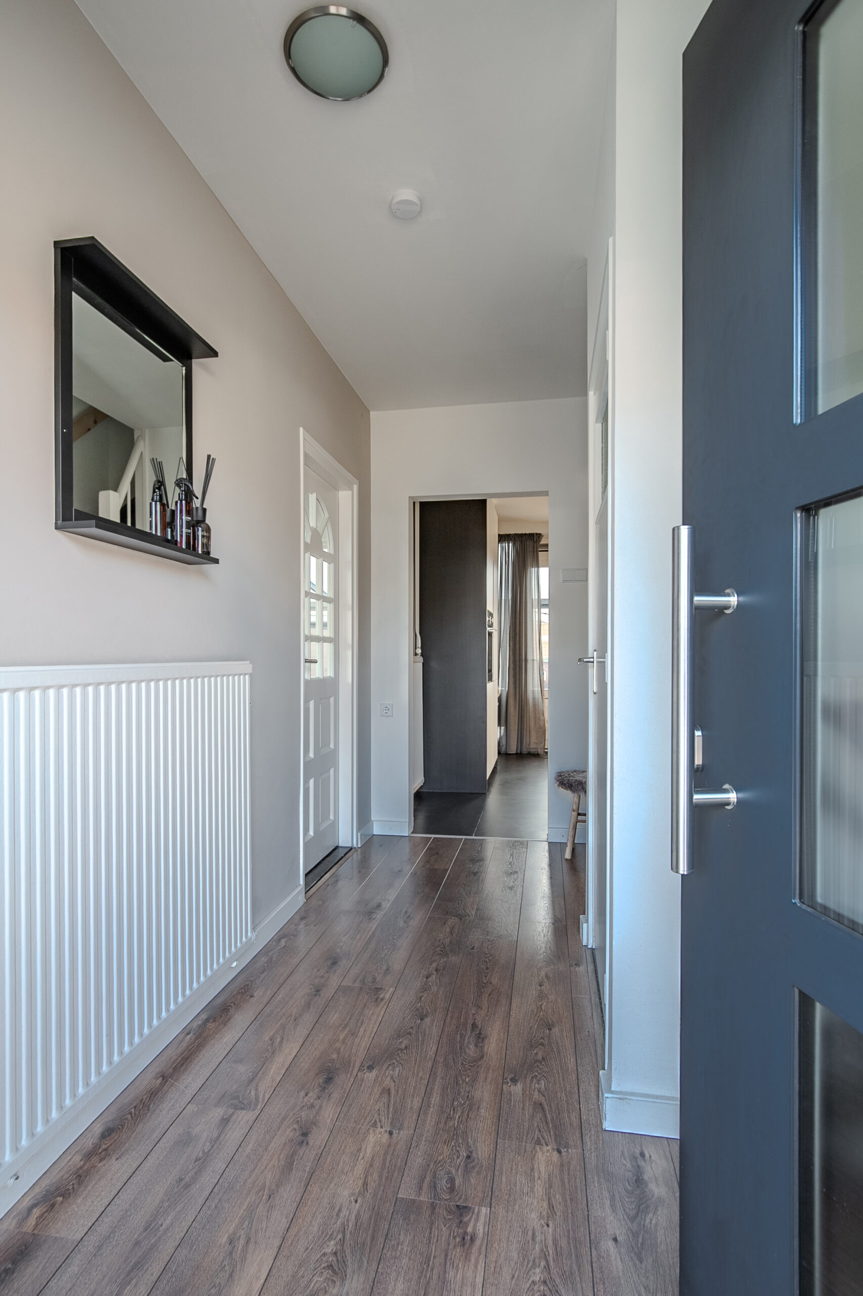 De ruime voortuin is onderhoudsvriendelijk aangelegd. De moderne kunststof voordeur geeft een welkome en frisse uitstraling aan dit huis. De hal is voorzien van een laminaatvloer, de meterkast en de geheel betegelde toiletruimte met zwevend toilet en fonteintje. Er is een lichte woonkamer 7.32 x 3.58 eveneens met laminaatvloer en stucwerkwanden. De gesloten keuken heeft een frisse en neutrale uitstraling door de witte, greeploze keukeninstallatie met donker werkblad. De keuken is voorzien van de volgende inbouwapparatuur: gaskookplaat, afzuigkap, oven, koelkast, vrieskast, vaatwasser en Quookerkraan. Er is extra veel bergruimte door de handige kelderkast in de keuken.