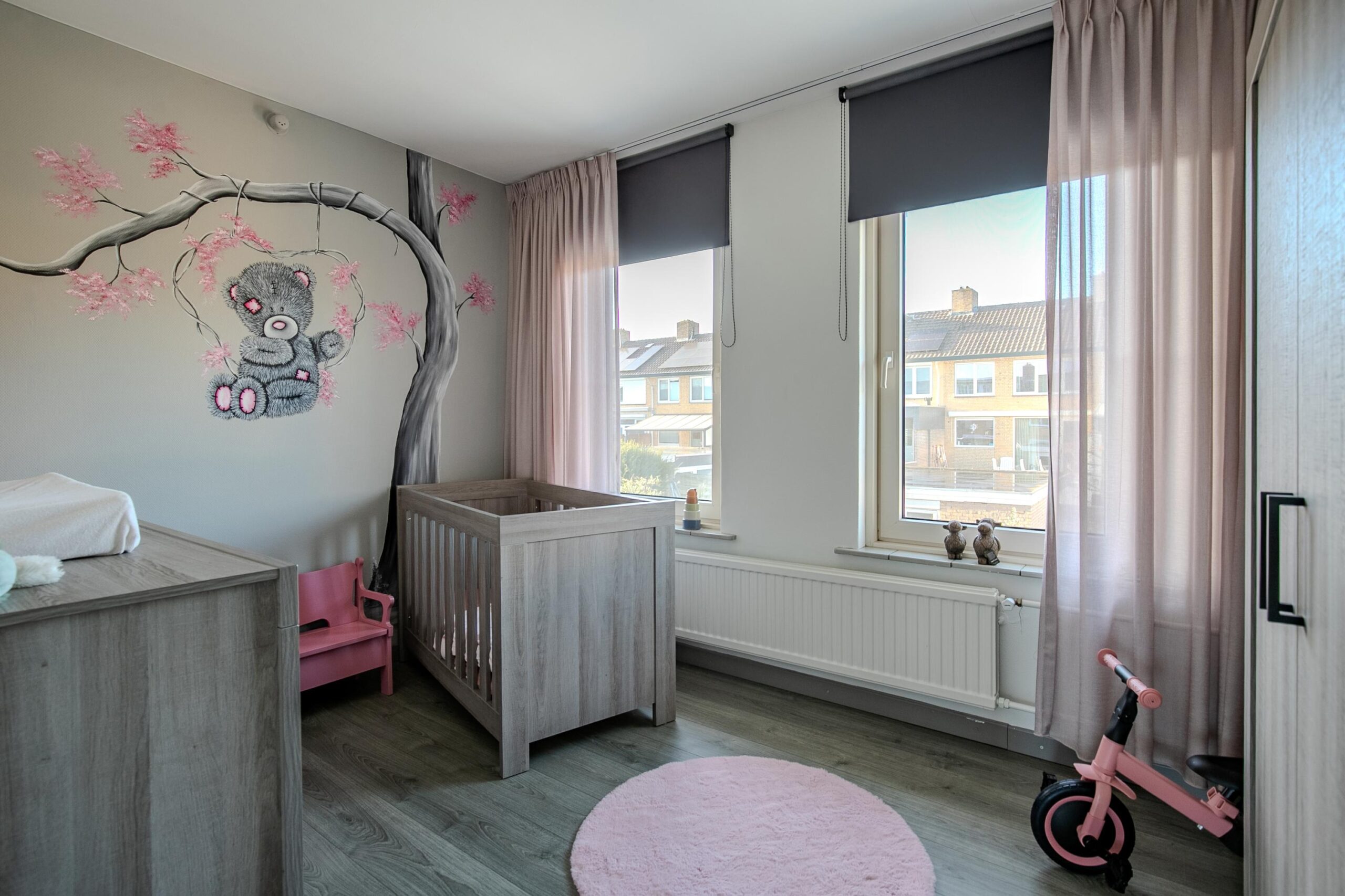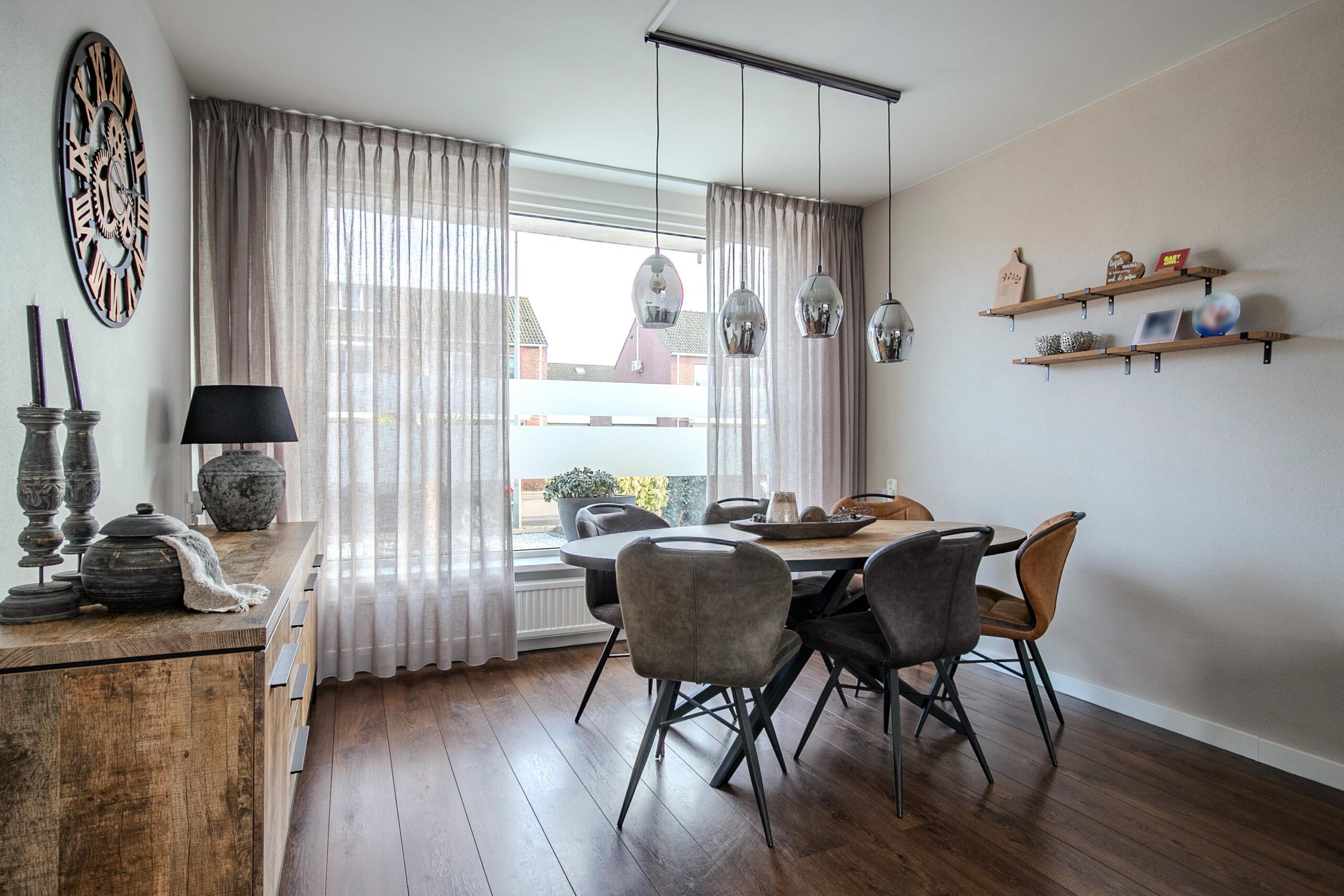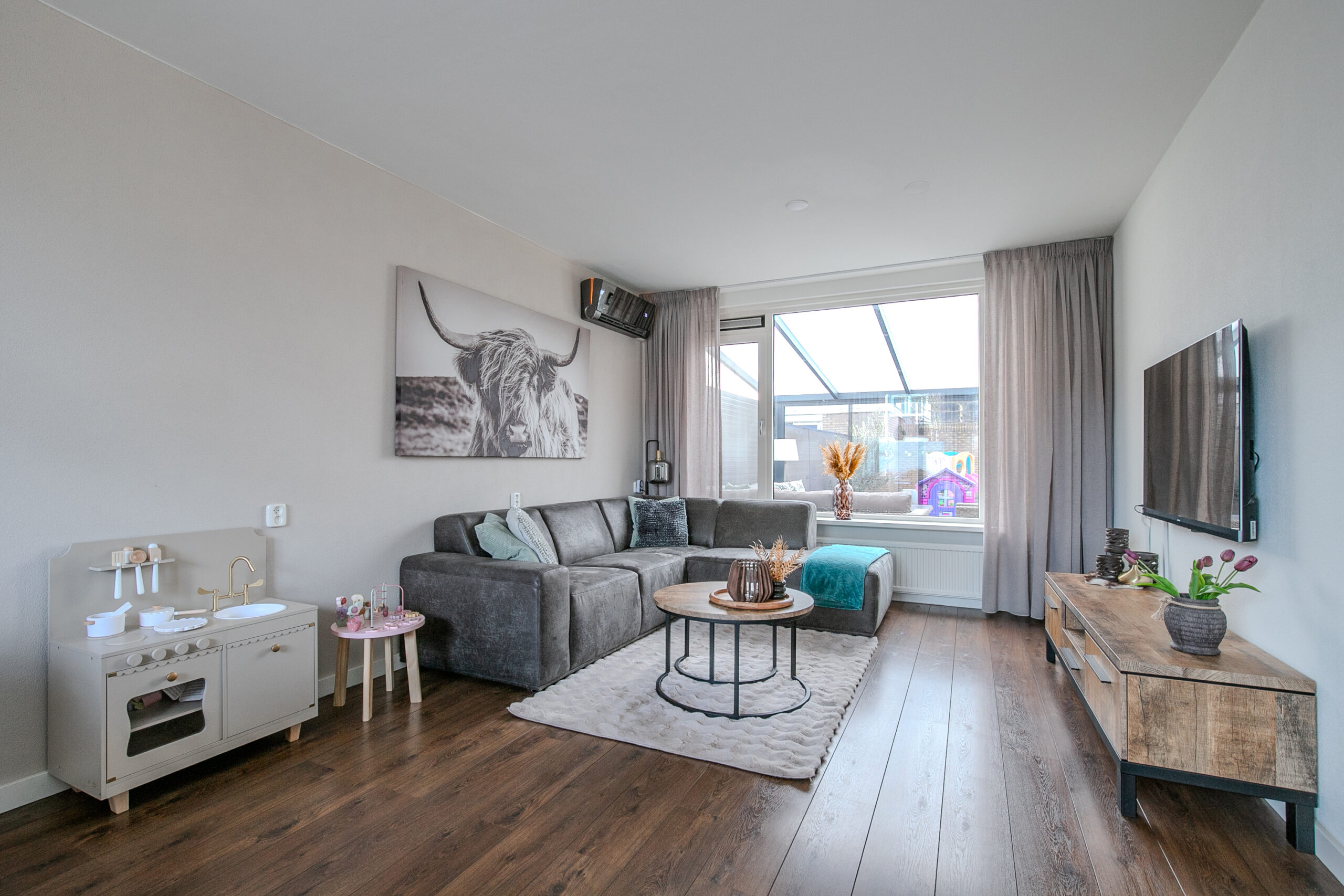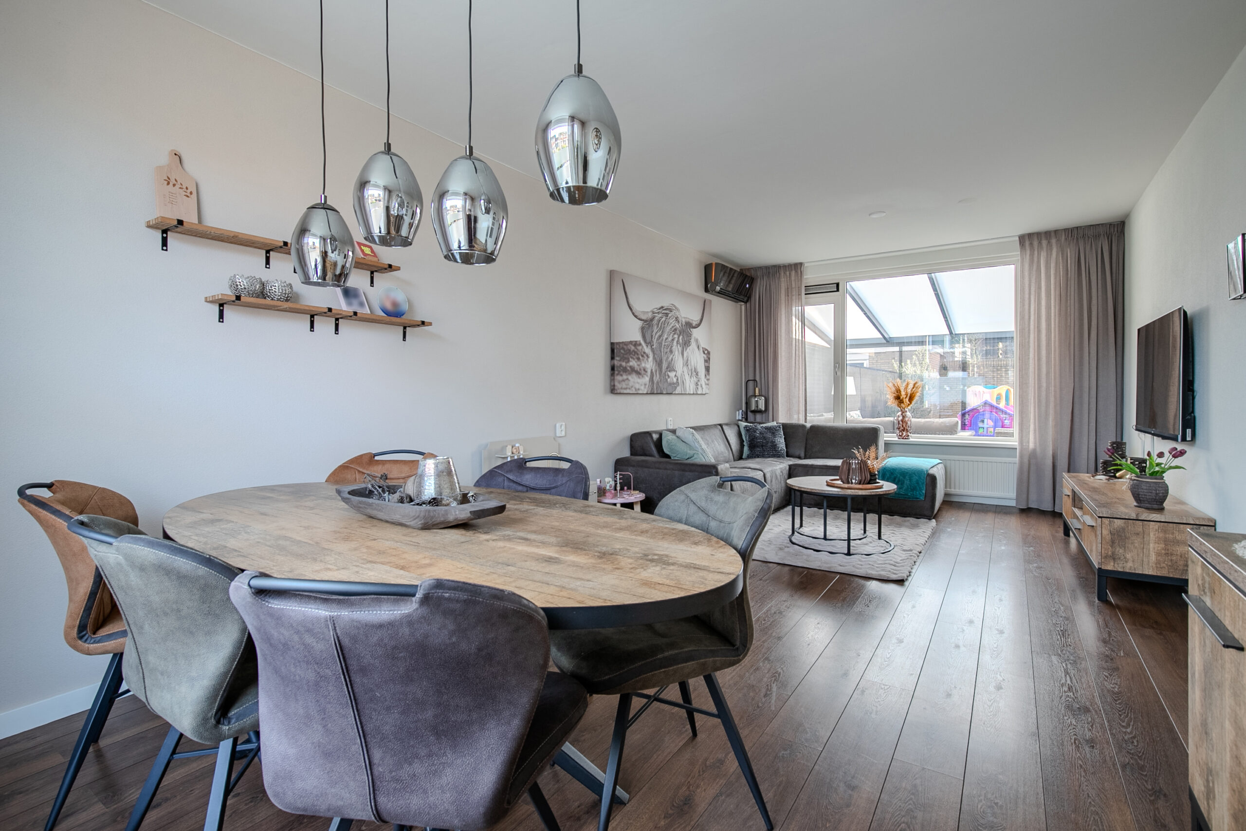 De ruime voortuin is onderhoudsvriendelijk aangelegd. De moderne kunststof voordeur geeft een welkome en frisse uitstraling aan dit huis. De hal is voorzien van een laminaatvloer, de meterkast en de geheel betegelde toiletruimte met zwevend toilet en fonteintje. Er is een lichte woonkamer 7.32 x 3.58 eveneens met laminaatvloer en stucwerkwanden. De gesloten keuken heeft een frisse en neutrale uitstraling door de witte, greeploze keukeninstallatie met donker werkblad. De keuken is voorzien van de volgende inbouwapparatuur: gaskookplaat, afzuigkap, oven, koelkast, vrieskast, vaatwasser en Quookerkraan. Er is extra veel bergruimte door de handige kelderkast in de keuken.