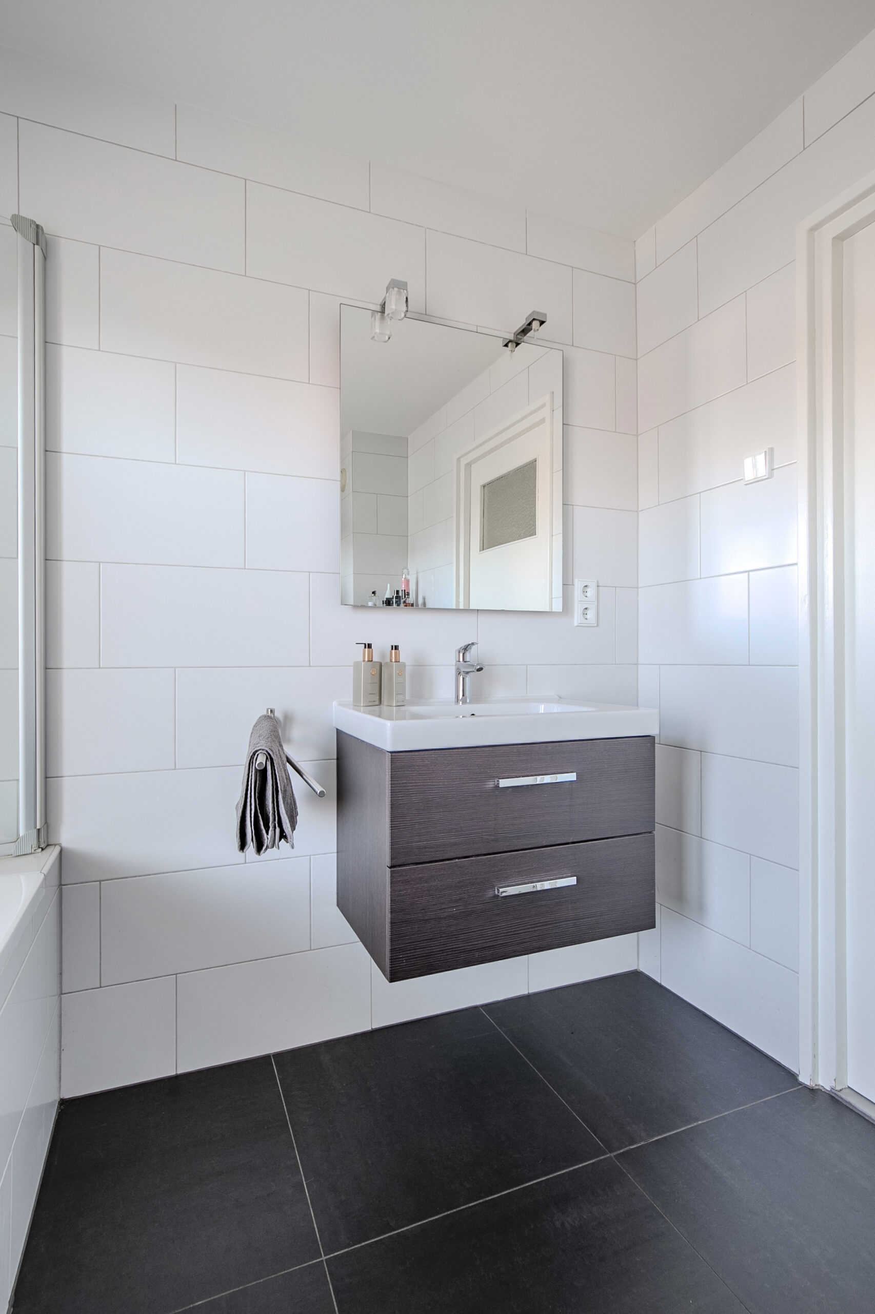 De overloop biedt toegang tot 3 slaapkamers, respectievelijk 3.61 x 3.45 met balkon, 3.58 x 2.57 en 2.57 x 2.57. De voormalige badkamer is nu in gebruik als fijne wasruimte. De huidige badkamer is licht en ruim, geheel betegeld en voorzien van een ligbad met spatwand, wastafelmeubel, zwevend toilet en een bijpassende badkamerkast.