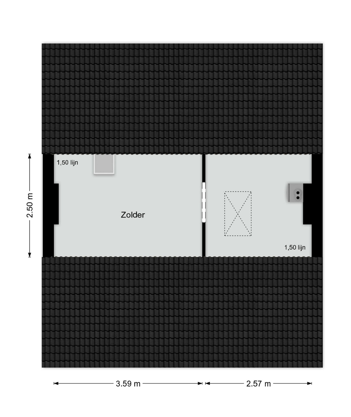 Deze is met een vlizotrap bereikbaar en gesplitst in twee ruimtes. Aan een zijde is de combi c.v.-installatie (Remeha 2020 gehuurd) en aan de andere zijde is een kamer 3.62 x 2.32 met een dakraam.