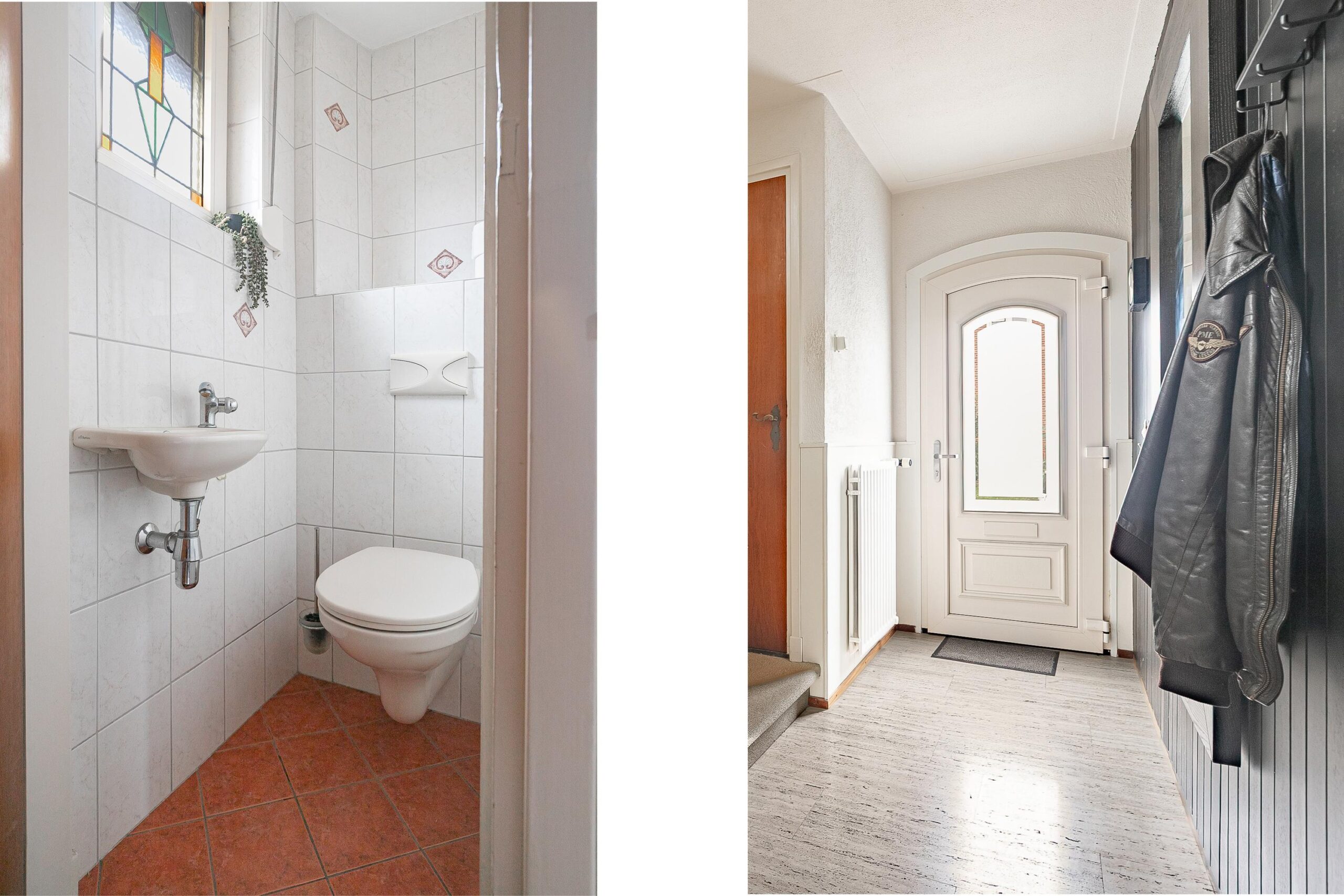 Bij aankomst valt direct de verzorgde voortuin en de royale oprit op — genoeg plek voor meerdere auto’s. De entree leidt naar een uitnodigende hal met een stijlvolle travertinvloer, trapopgang, meterkast en een modern gastentoilet met zwevend closet en fonteintje.