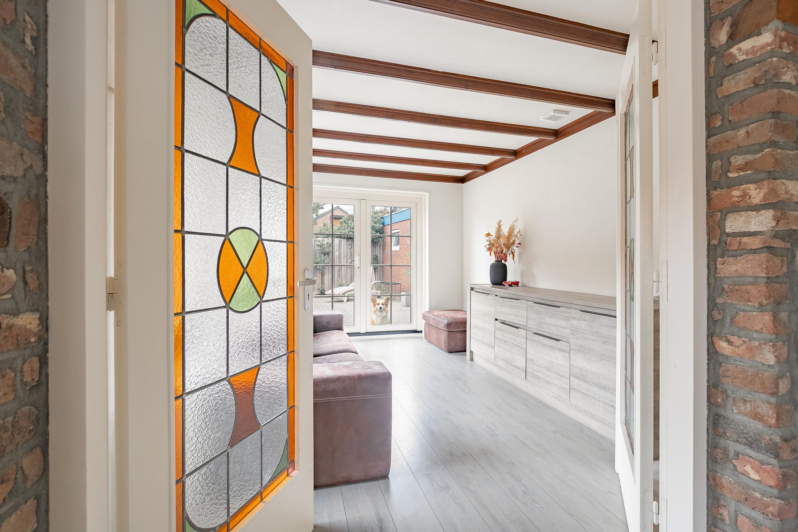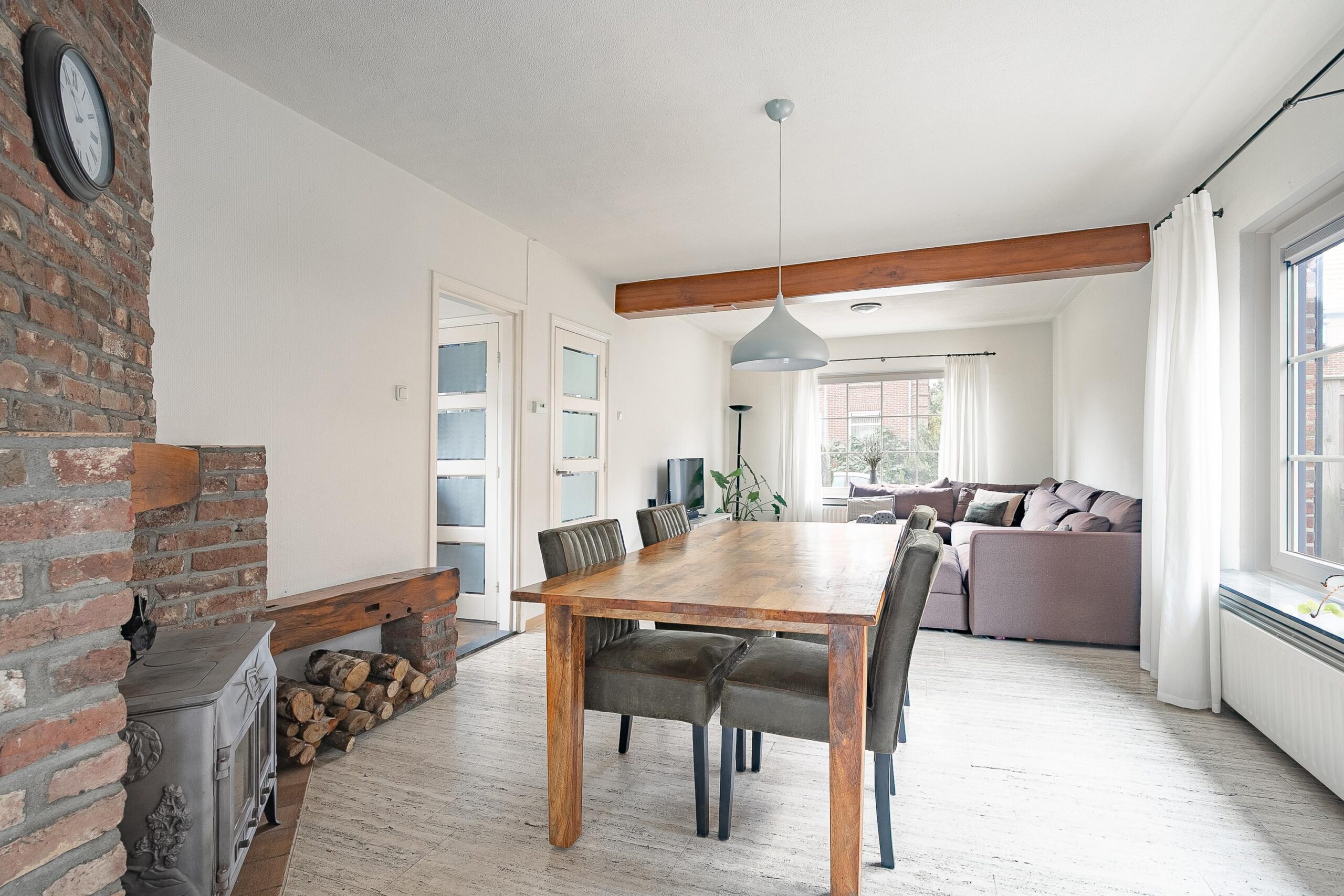 De lichte woonkamer (ca. 31 m²) ademt sfeer dankzij de mooie travertinvloer, een gezellige houtkachel en dubbele openslaande glas-in-looddeuren naar de tuinkamer/aanbouw.
