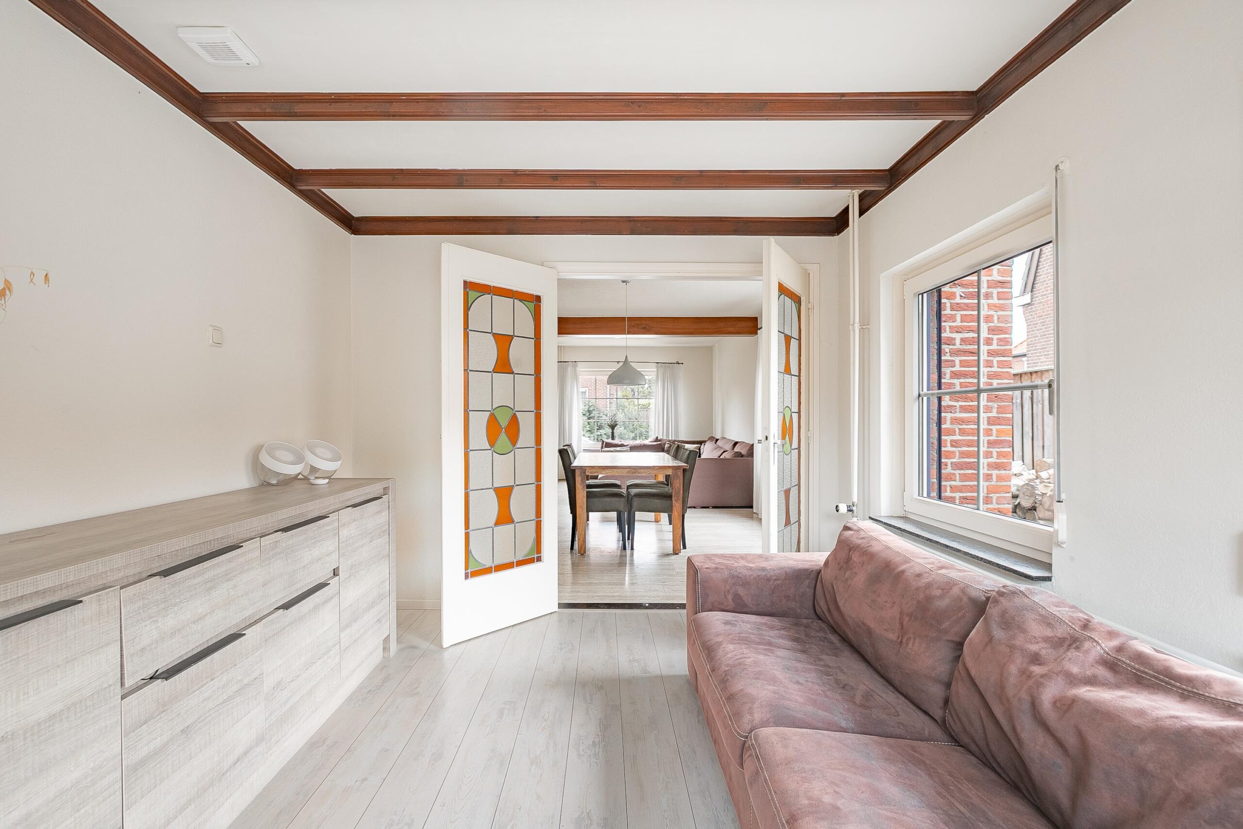 In deze tuinkamer/eetkamer (ca. 12 m²) schijnt het daglicht rijkelijk naar binnen. Openslaande deuren brengen je rechtstreeks in de tuin — perfect voor lange zomeravonden en gezellige diners.
