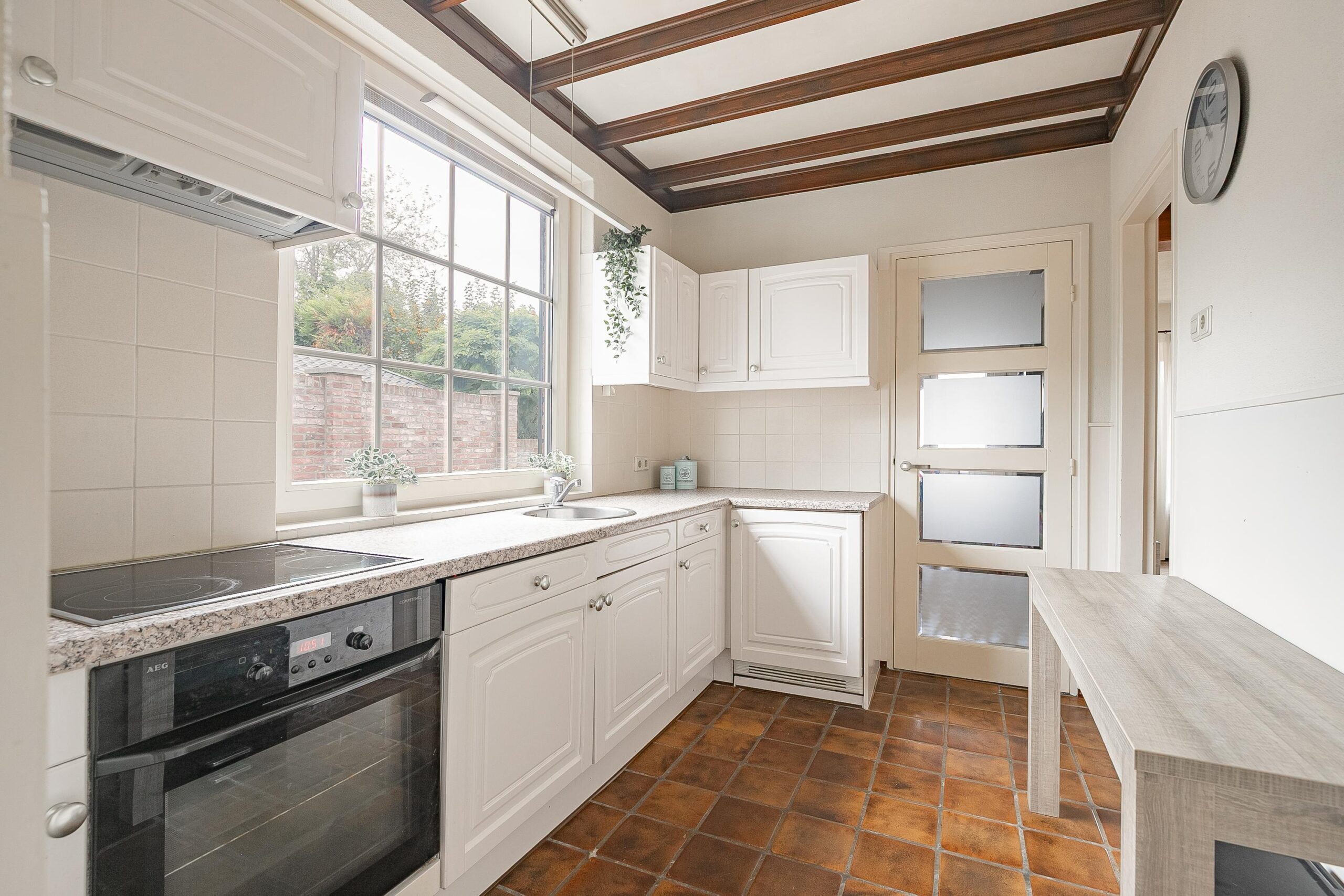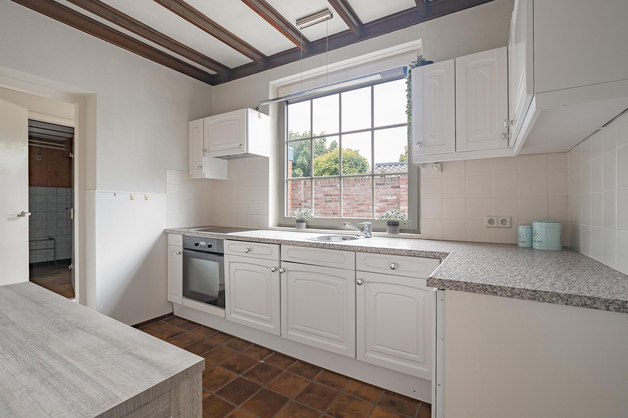 De gesloten keuken is netjes verzorgd en compleet uitgerust met een keramische kookplaat, oven, koelkast, afzuigkap en volop kastruimte. De praktische bijkeuken biedt plaats aan je wasmachine en droger.