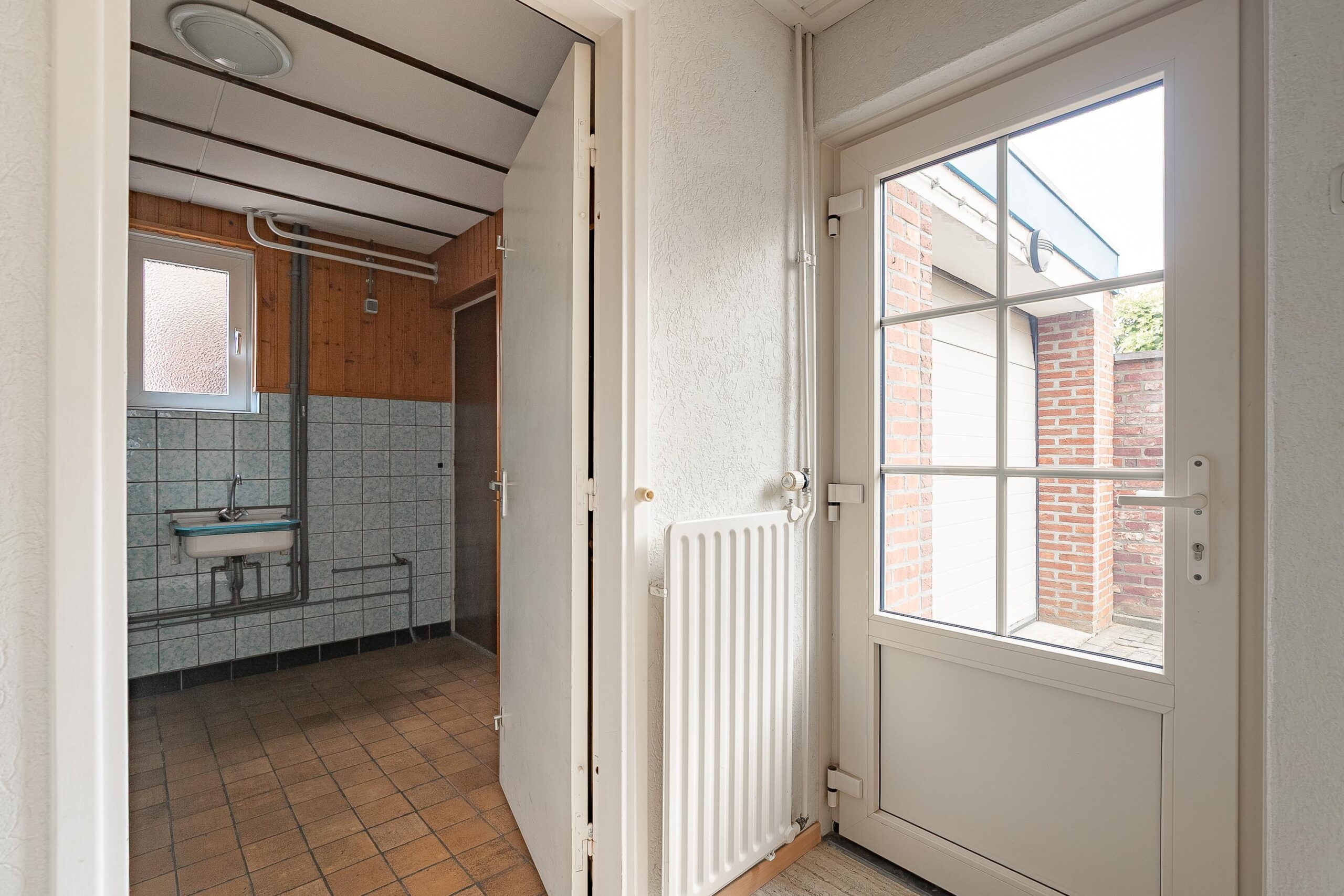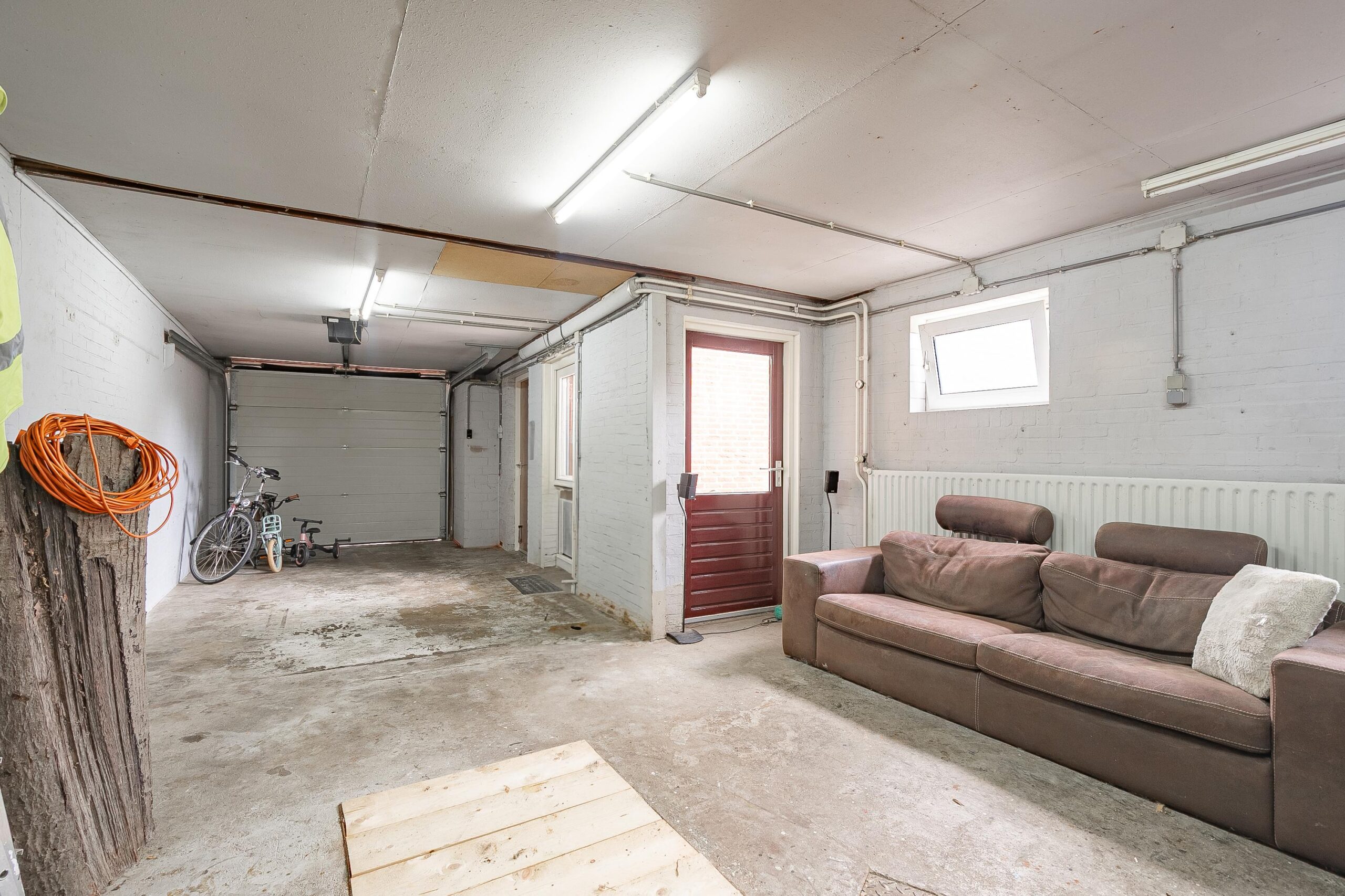 Een absolute plus is de zeer royale, inpandige garage (ca. 40 m²). Voorzien van een elektrische sectionaalpoort, smeerput, water- en elektra-aansluitingen en zelfs toegang tot de achtertuin. Een droom voor klussers, hobbyisten of wie een extra werk-/opslagruimte zoekt.