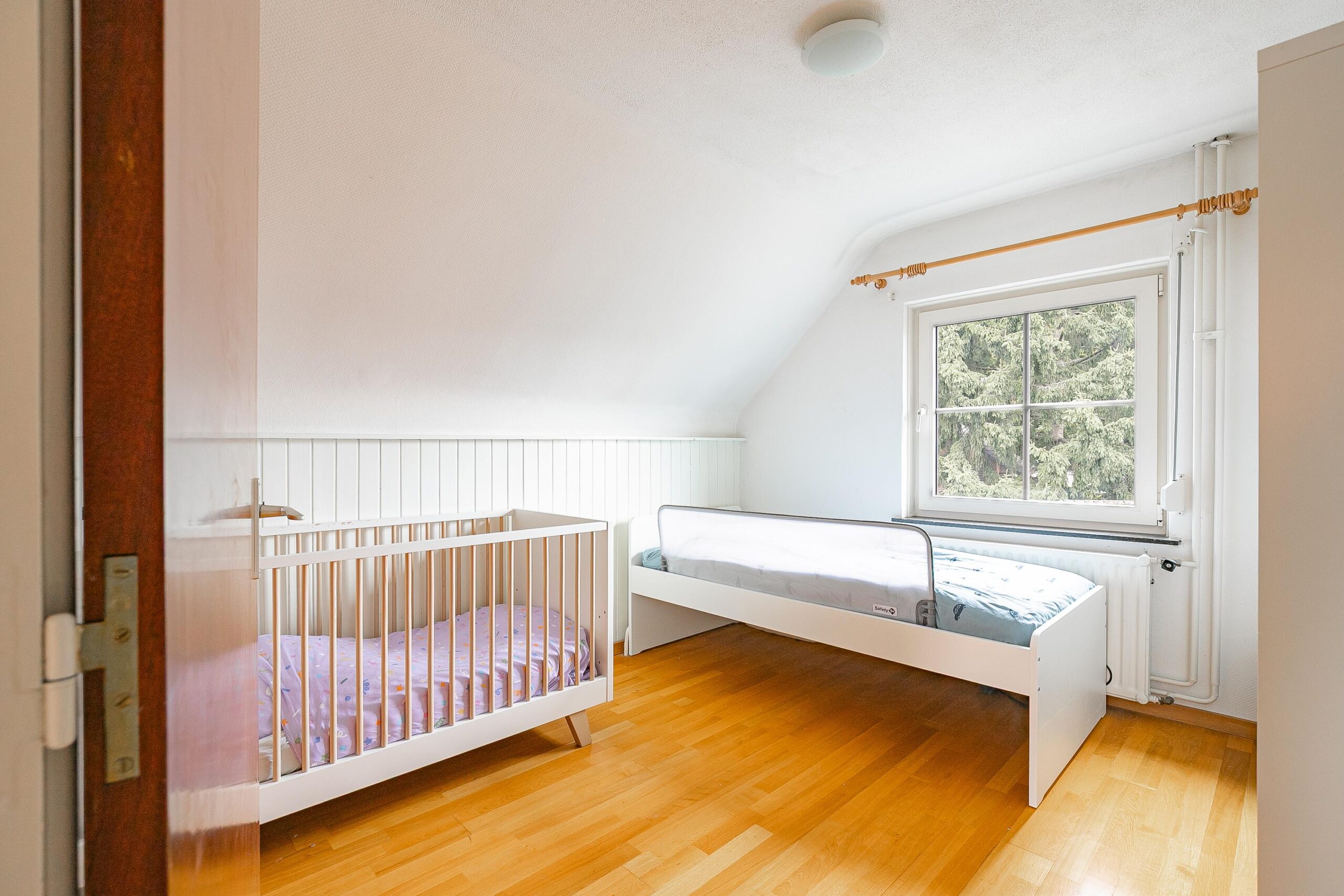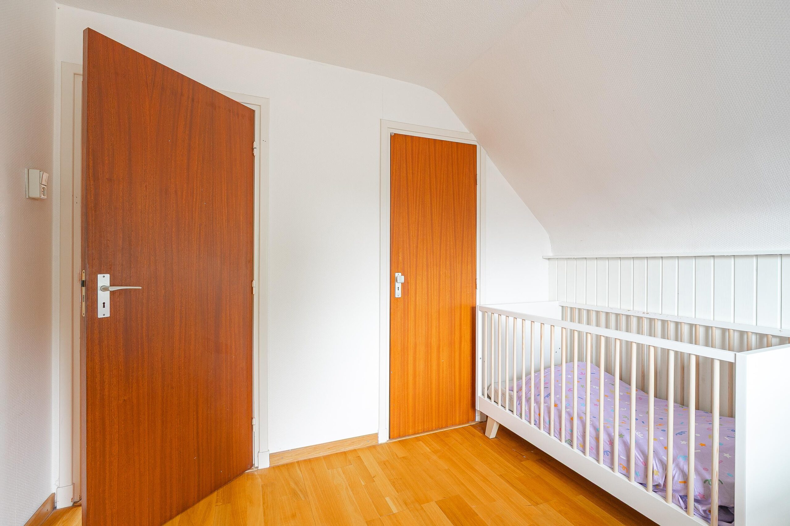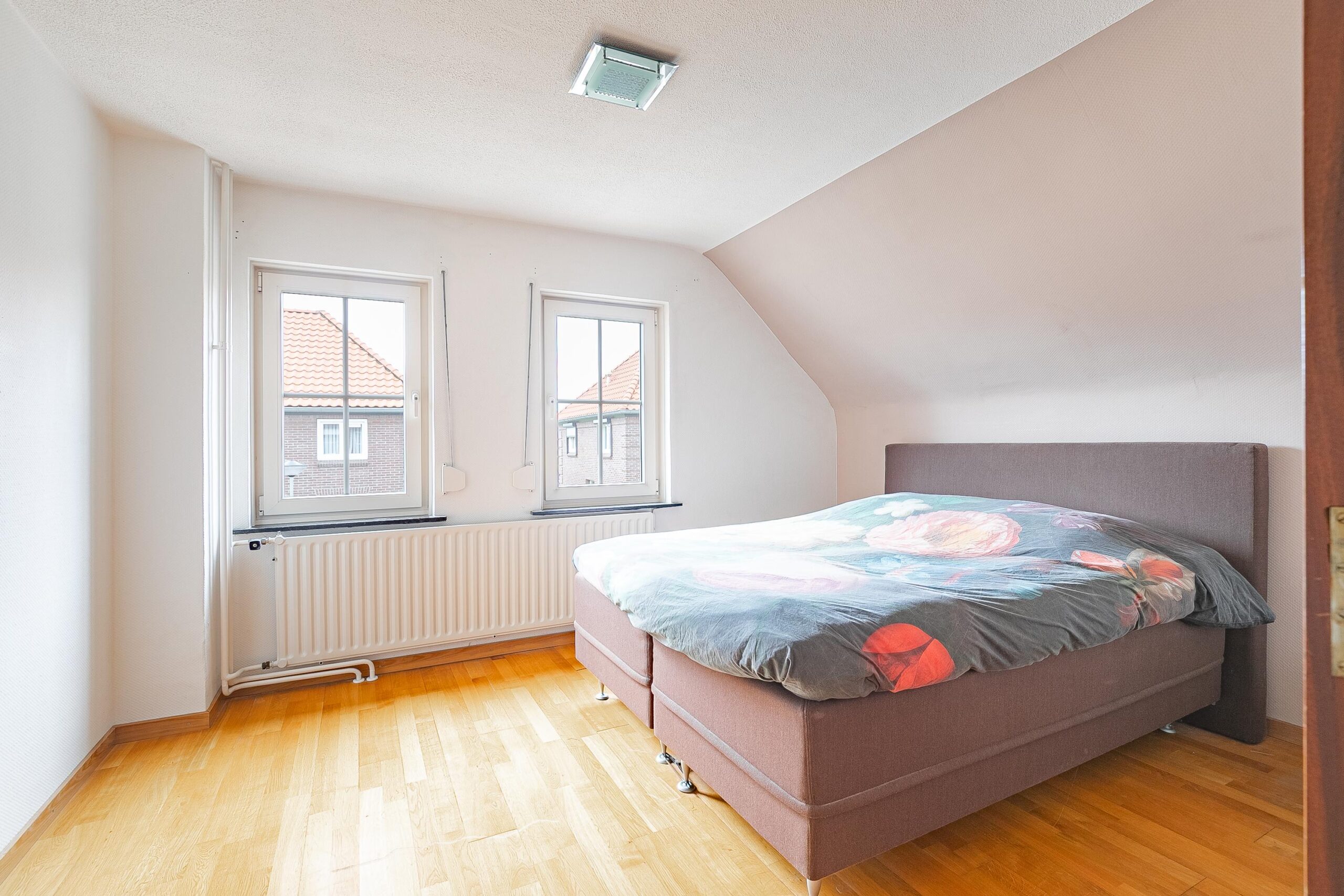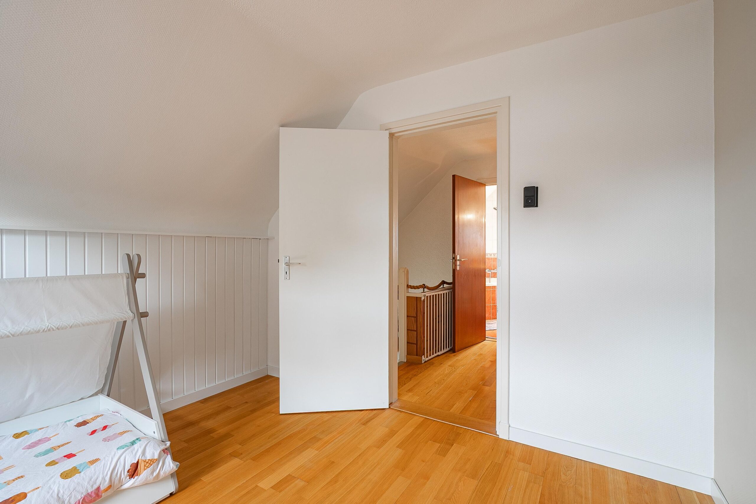 Op de eerste verdieping ligt een nette parketvloer over de hele etage. De overloop geeft toegang tot drie comfortabele slaapkamers: