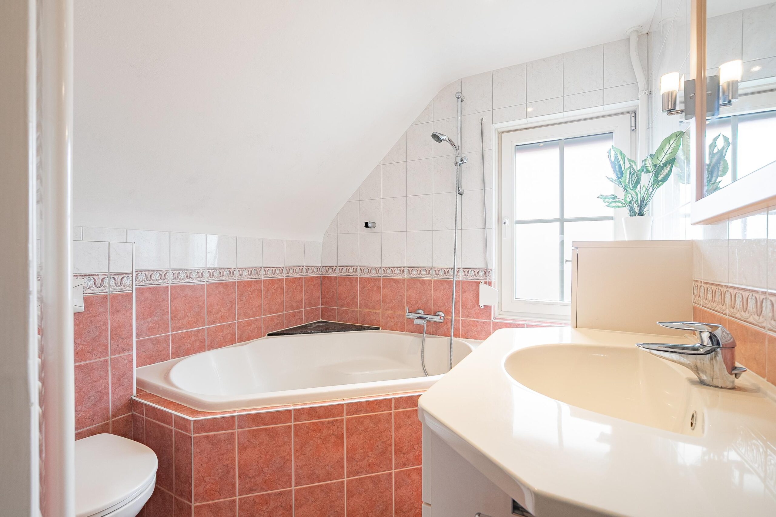 De vernieuwde badkamer is modern en stijlvol: met een ligbad, zwevend toilet, badkamermeubel met wastafel en spiegel, designradiator en inbouwspots. Alles strak afgewerkt en klaar voor dagelijks comfort.