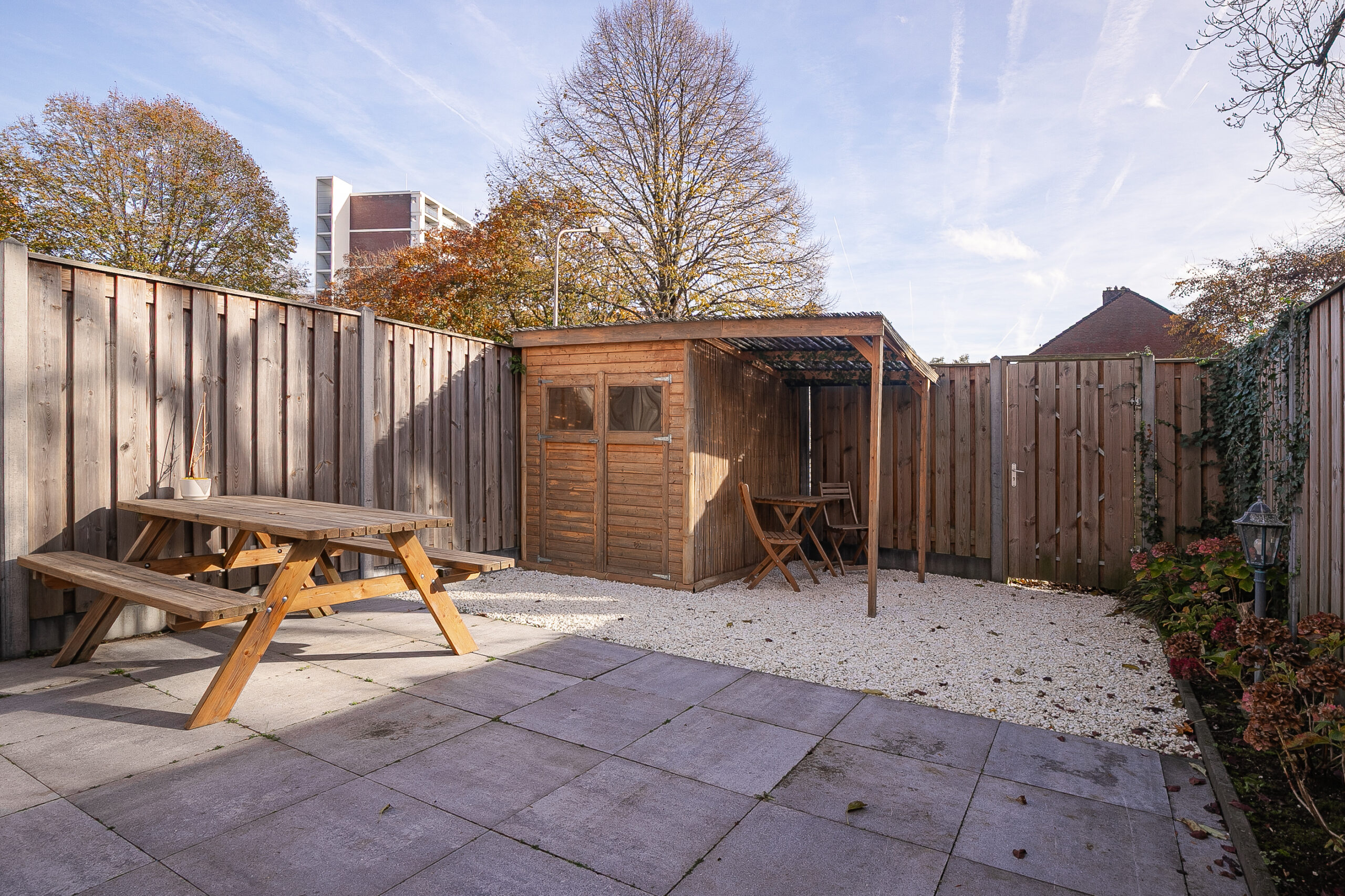 Vanuit de keuken is het terras (ca. 12 m²) bereikbaar. Dit zonnige terras is voorzien van een zonnescherm en heeft via een vaste trap toegang tot de lager gelegen tuin. Het dakterras is recent in 2025 opnieuw betegeld. Met een trap of via de deur in de slaapkamer is de tuin te bereiken. De tuin is verzorgd en grotendeels betegeld. Aan de zijkant van de tuin is er een border gemaakt voor beplanting. De tuin beschikt verder over een zitgedeelte en een houten tuinhuisje met elektra en een overkapping. De tuin beschikt ook over een praktische achterom.