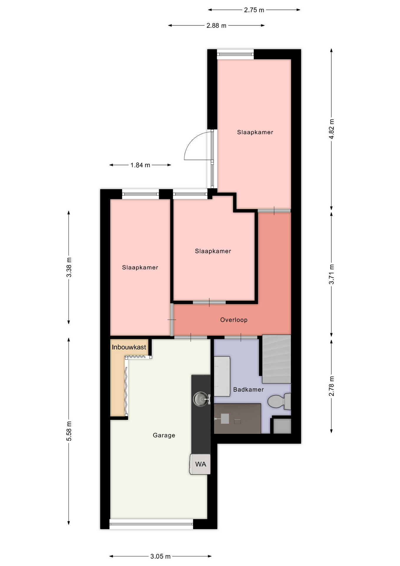 Een trap in de hal leidt naar de ondergelegen verdieping. De overloop geeft toegang tot alle vertrekken. De slaapkamers zijn voorzien van rolluiken. Slaapkamer 1 (ca. 13 m²) beschikt over een deur naar de ruime achtertuin. Slaapkamer 2 (ca. 9 m²) en slaapkamer 3 (ca. 8 m²) liggen eveneens aan de tuinzijde. De badkamer (ca. 5 m²) is vernieuwd in 2023 en compleet ingericht met een inloopdouche, wastafelmeubel, tweede toilet en designradiator. In de badkamer is er ook sprake van een mechanische afzuiging die samenwerkt met de verlichting. Vanuit de overloop is er toegang tot de inpandige garage (ca. 20m²) welke is voorzien van inbouwkasten en aansluitingen voor wasapparatuur. De benedenverdieping is eveneens voorzien van een laminaatvloer.