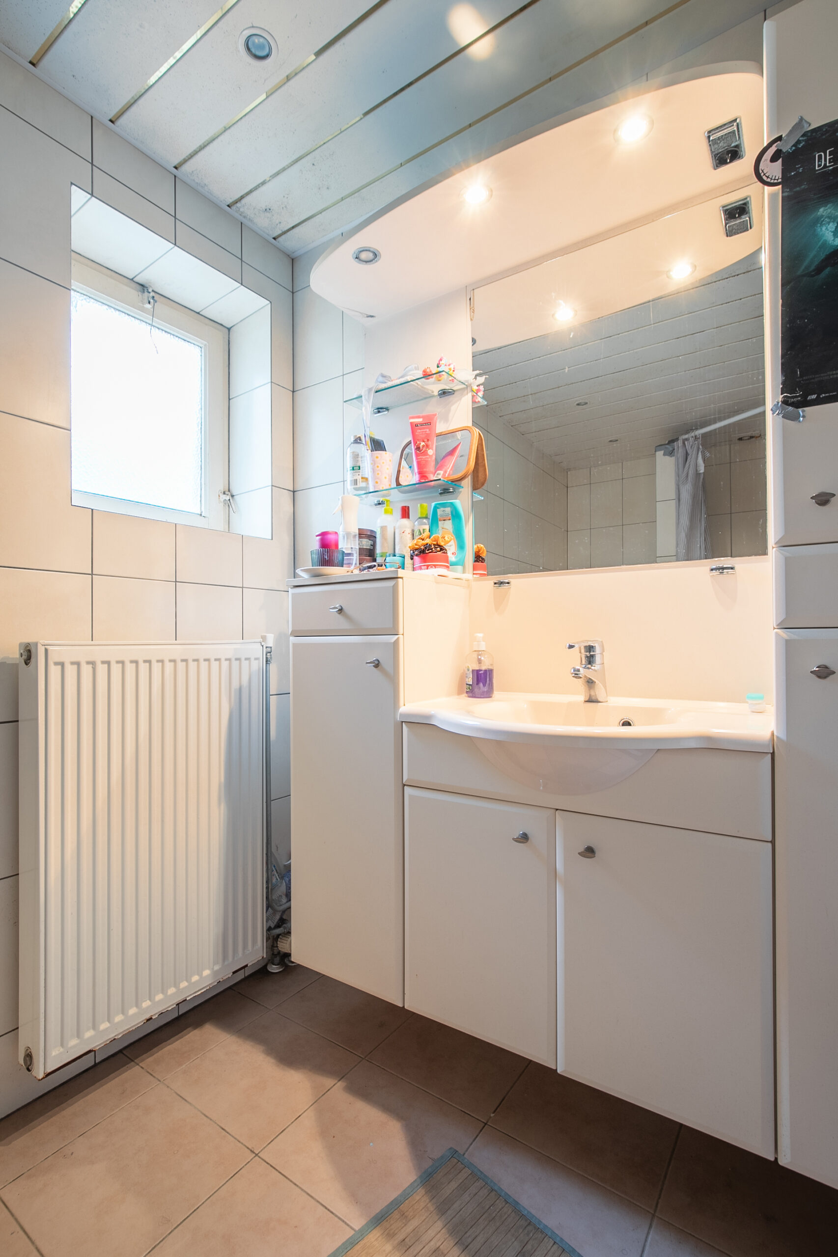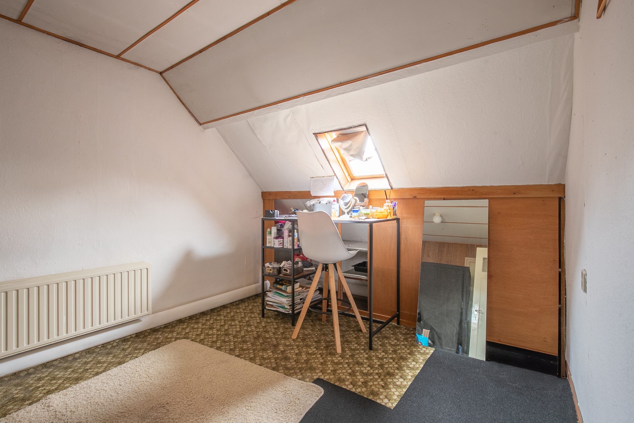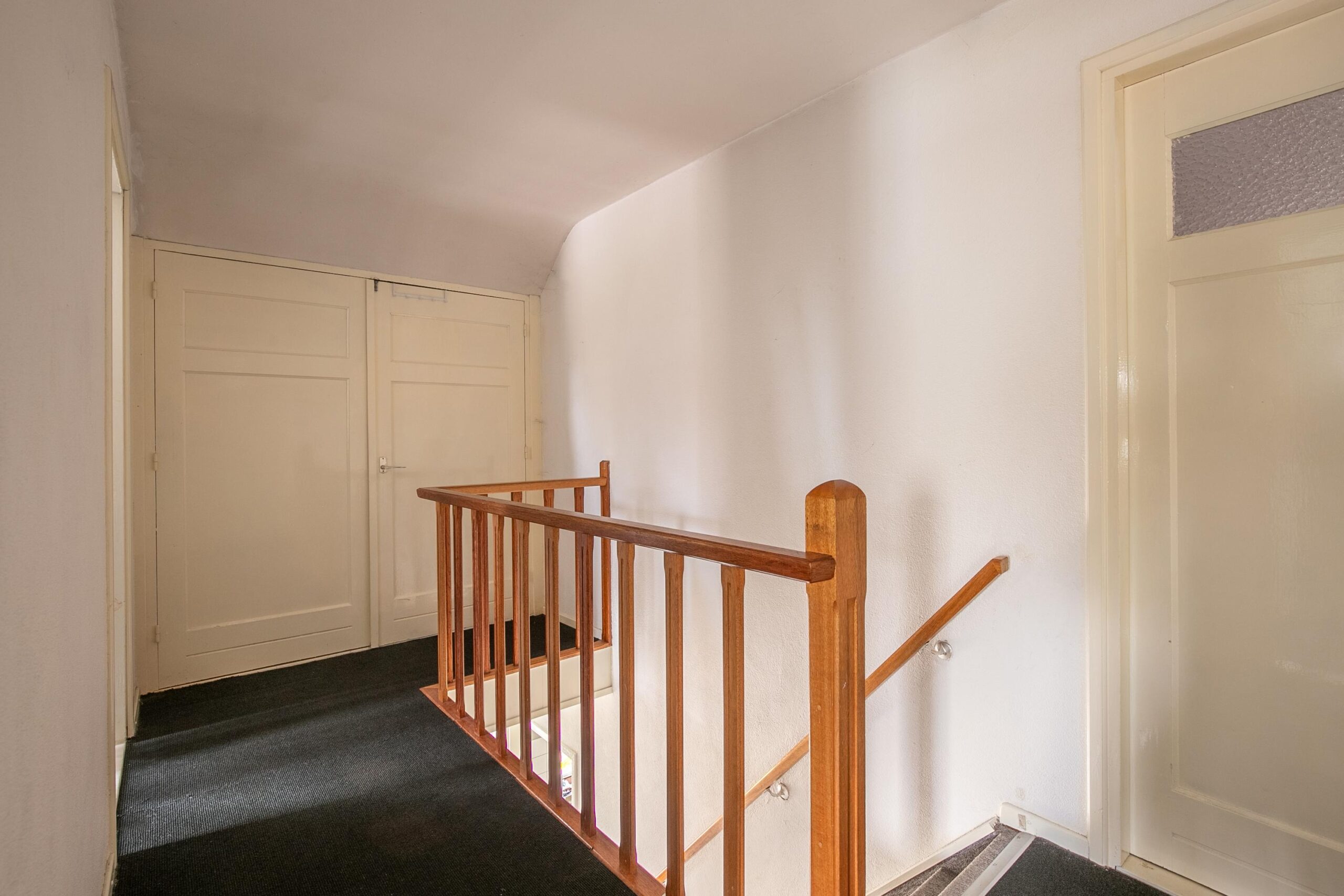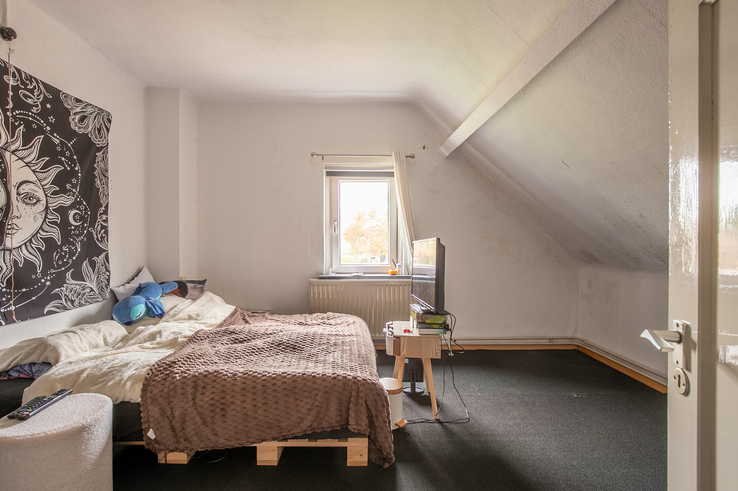 Op de eerste verdieping bevinden zich 3 slaapkamers, een kleine kamer en een zolderruimte. De slaapkamers beschikken over een vloerbedekking, gestucte wanden en plafonds. De slaapkamers meten resp. ca. 13 m² en ca. 15 m² en 11 m². De zolderkamer is circa 11 m² groot, hier is ook de cv-ketel opgesteld. Verder bevindt zich op de overloop een ruime bergkast.