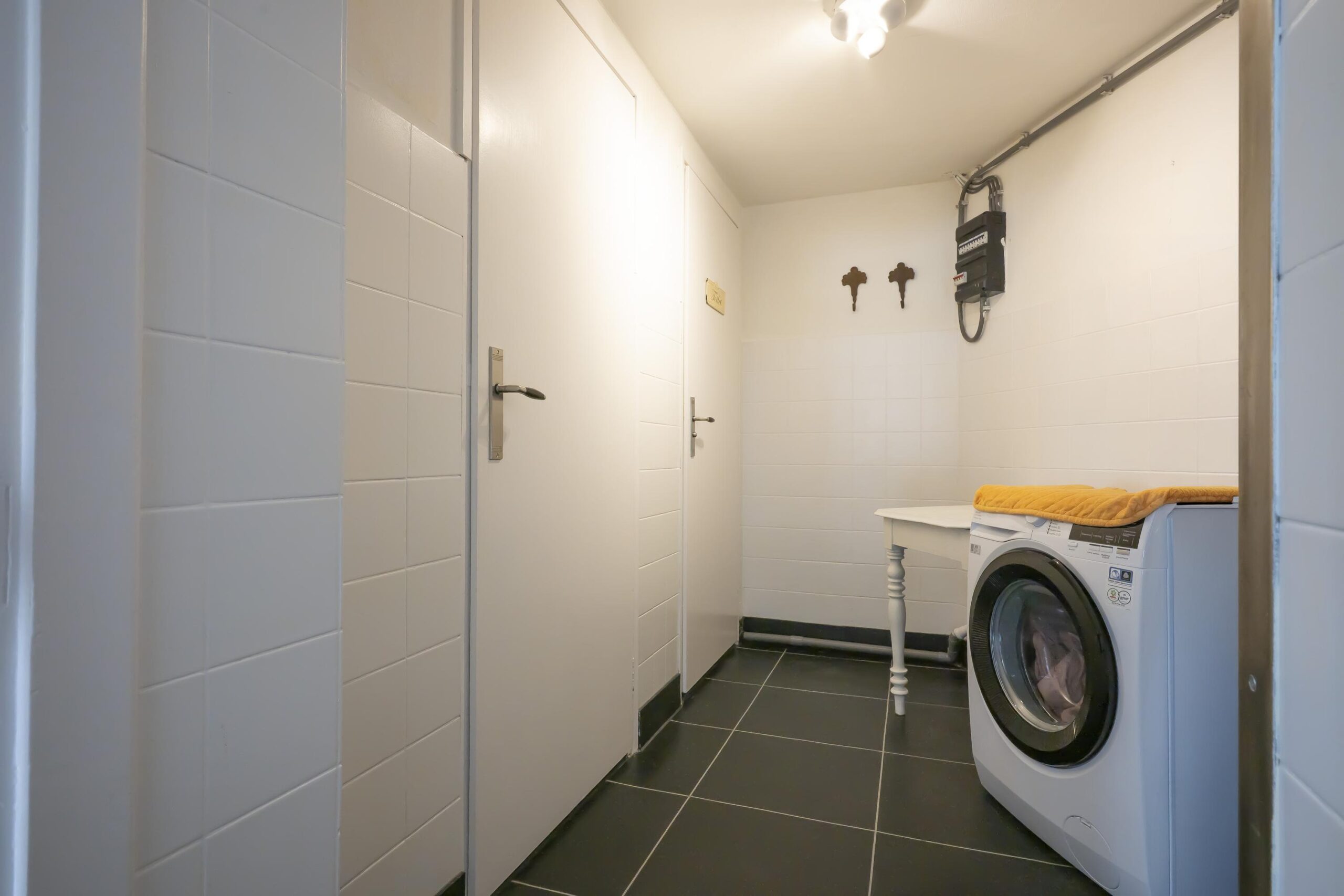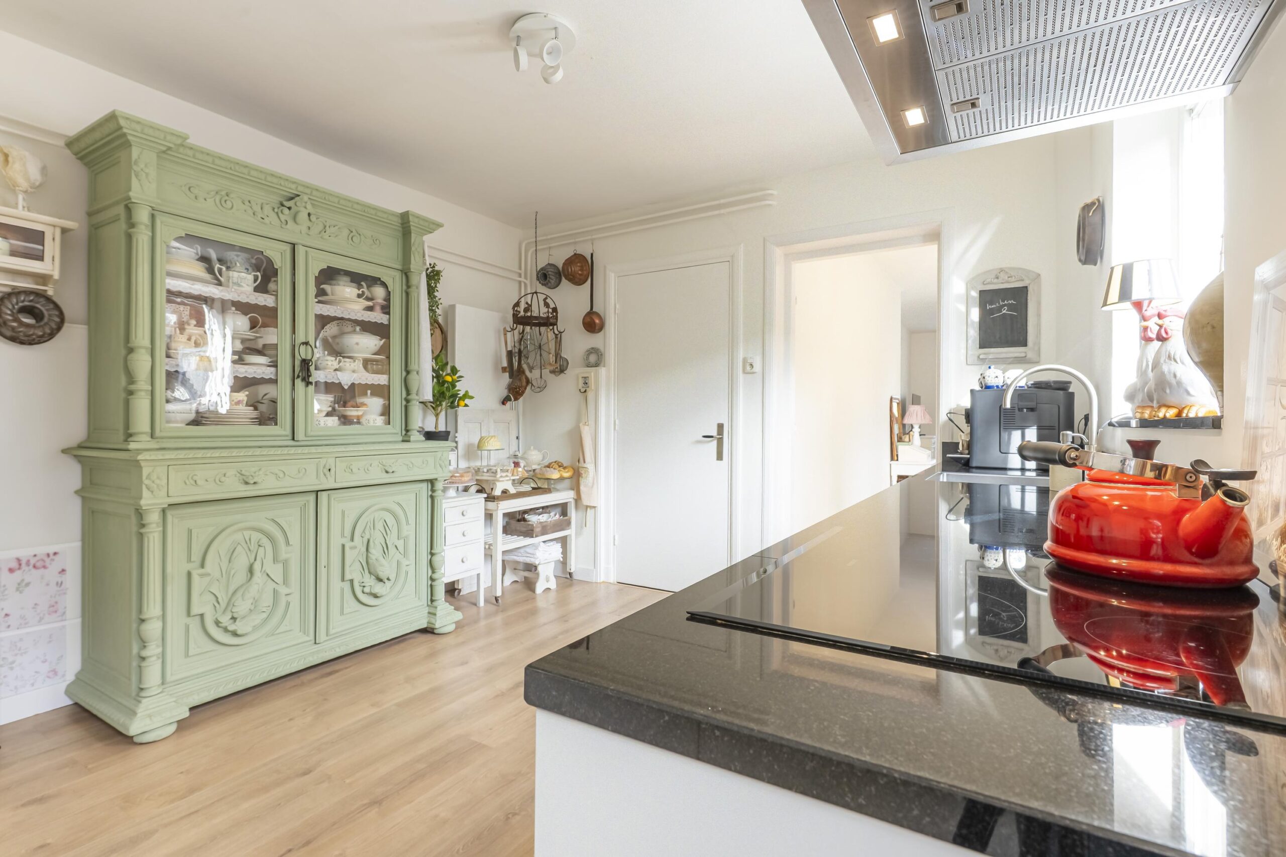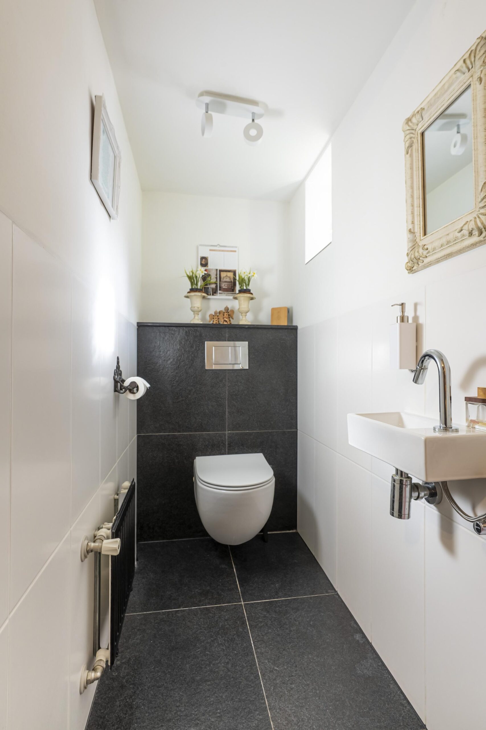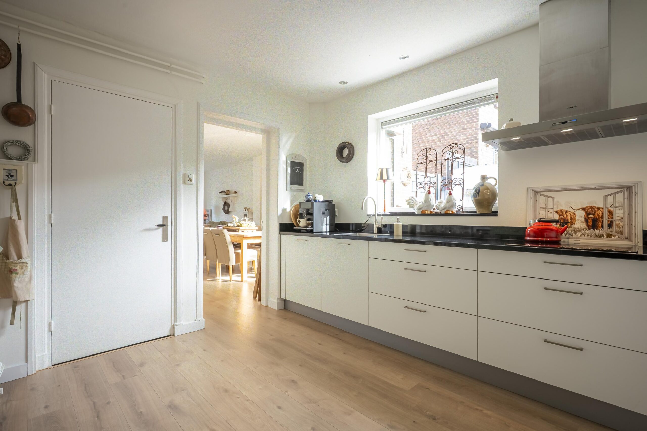 Separate gelegen een moderne leefkeuken (2020) inclusief de navolgende apparatuur: inductie kookplaat, afzuigkap, hetelucht oven, vaatwasser, koelkast, granieten aanrechtblad en diverse boven- en onderkasten. Bijkeuken met plavuizenvloer en aansluiting wasmachine, berging met aansluiting droger en toiletruimte grotendeels betegeld met zwevend toilet en fontein.