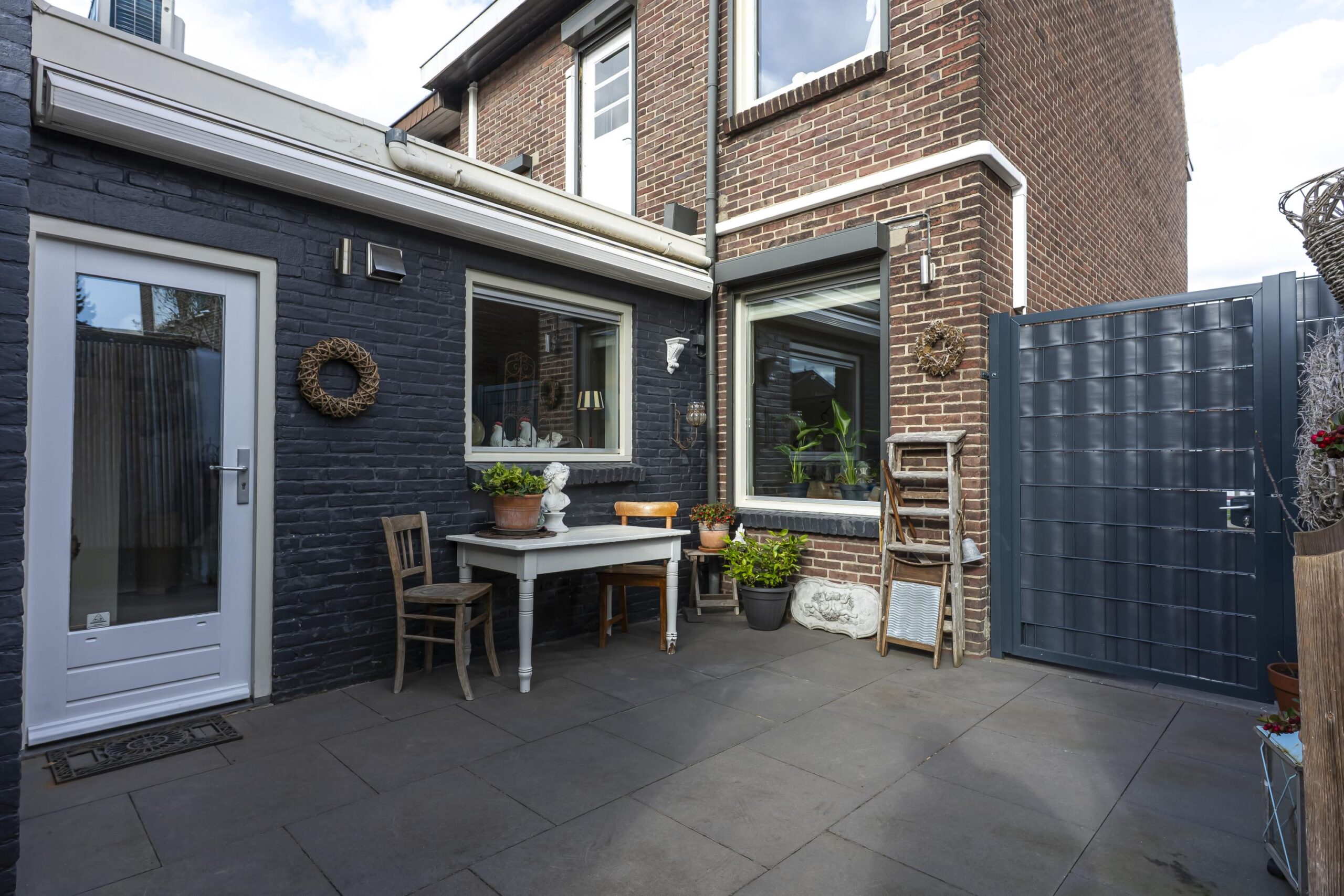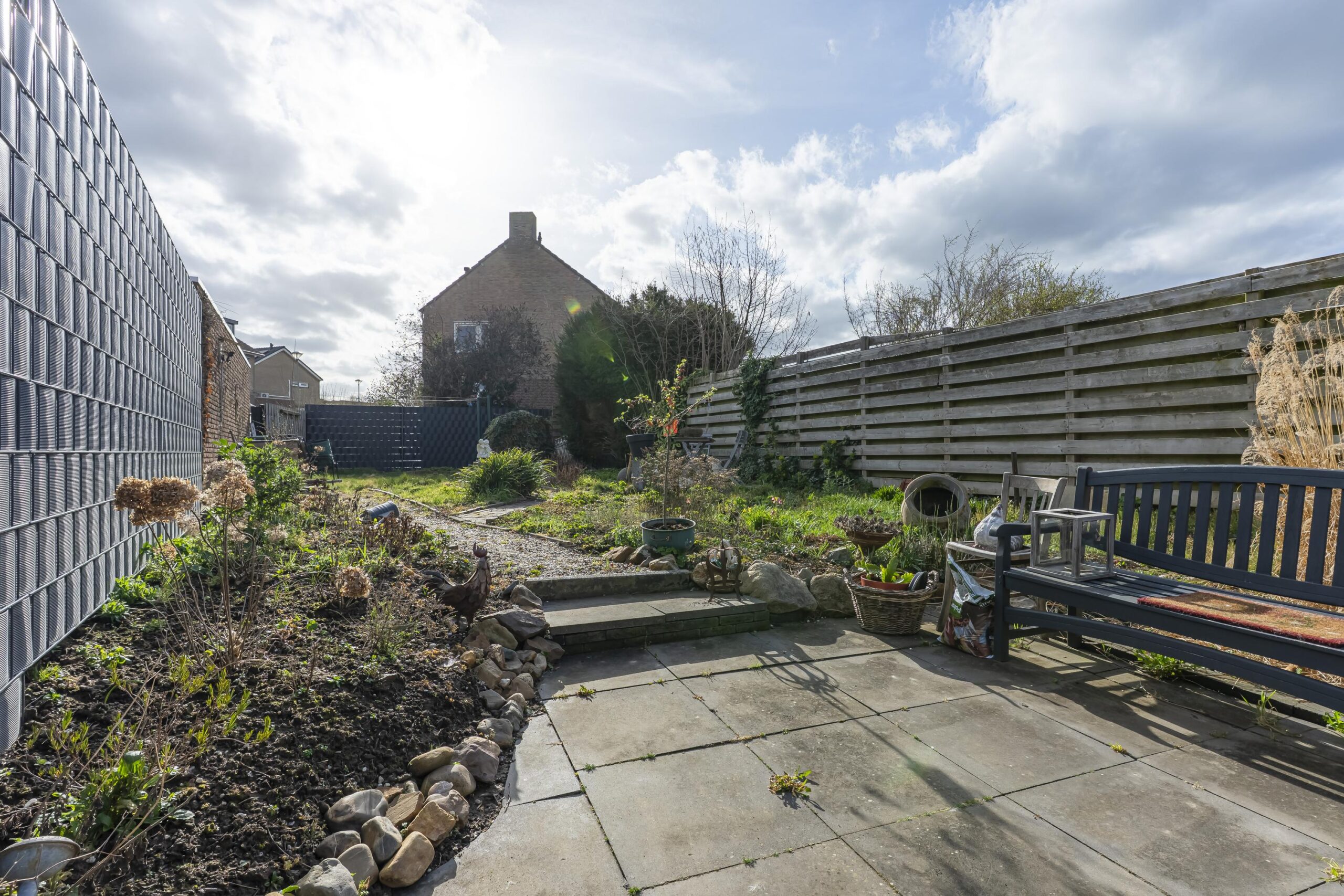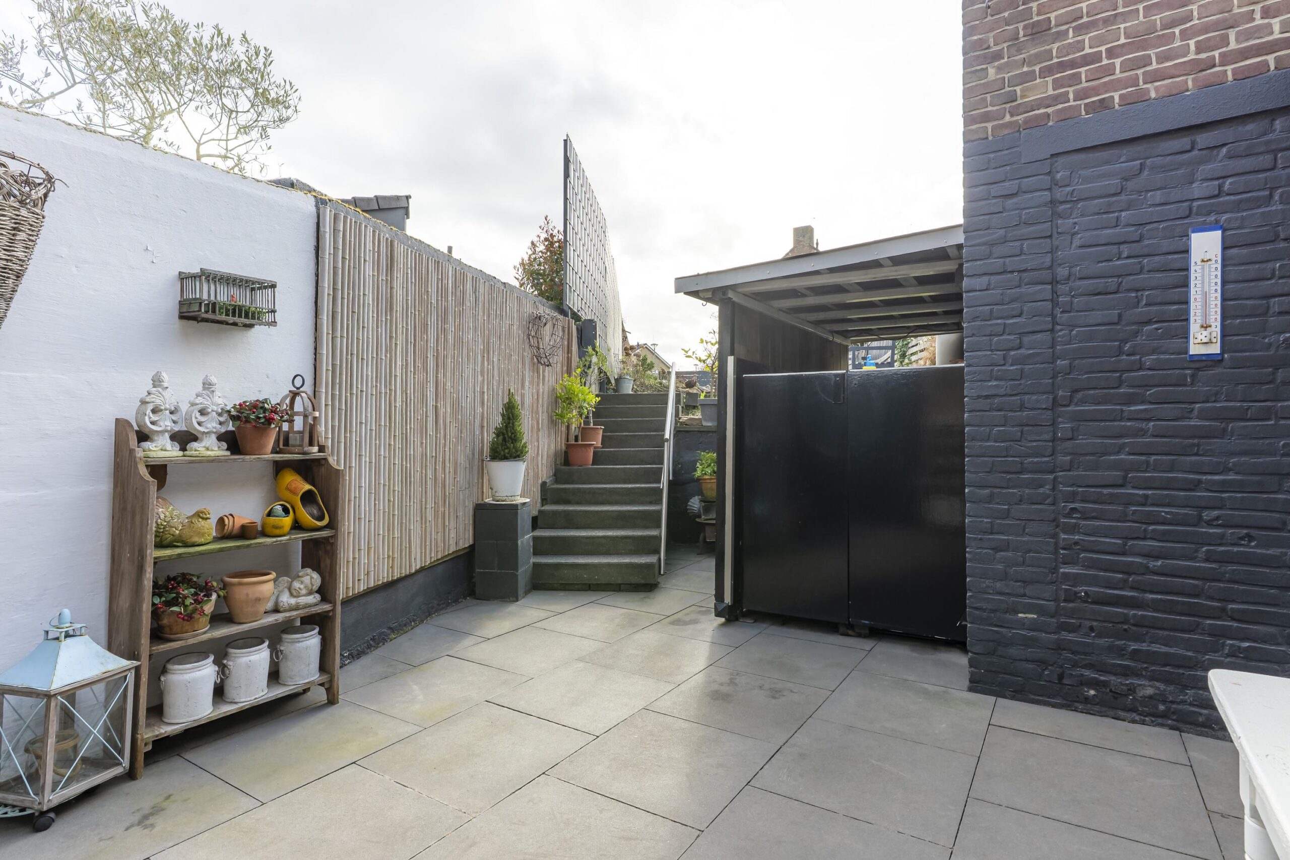 Groot betegeld terras met afsluitbare zijingang en bergruimte/fietsenstalling met waterreservoir.