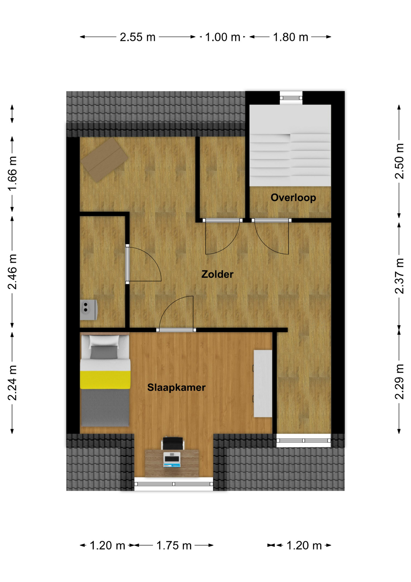 Zeer ruime zolderverdieping met airco installatie, omvormer en mogelijkheid voor het realiseren van 2 slaapkamers.