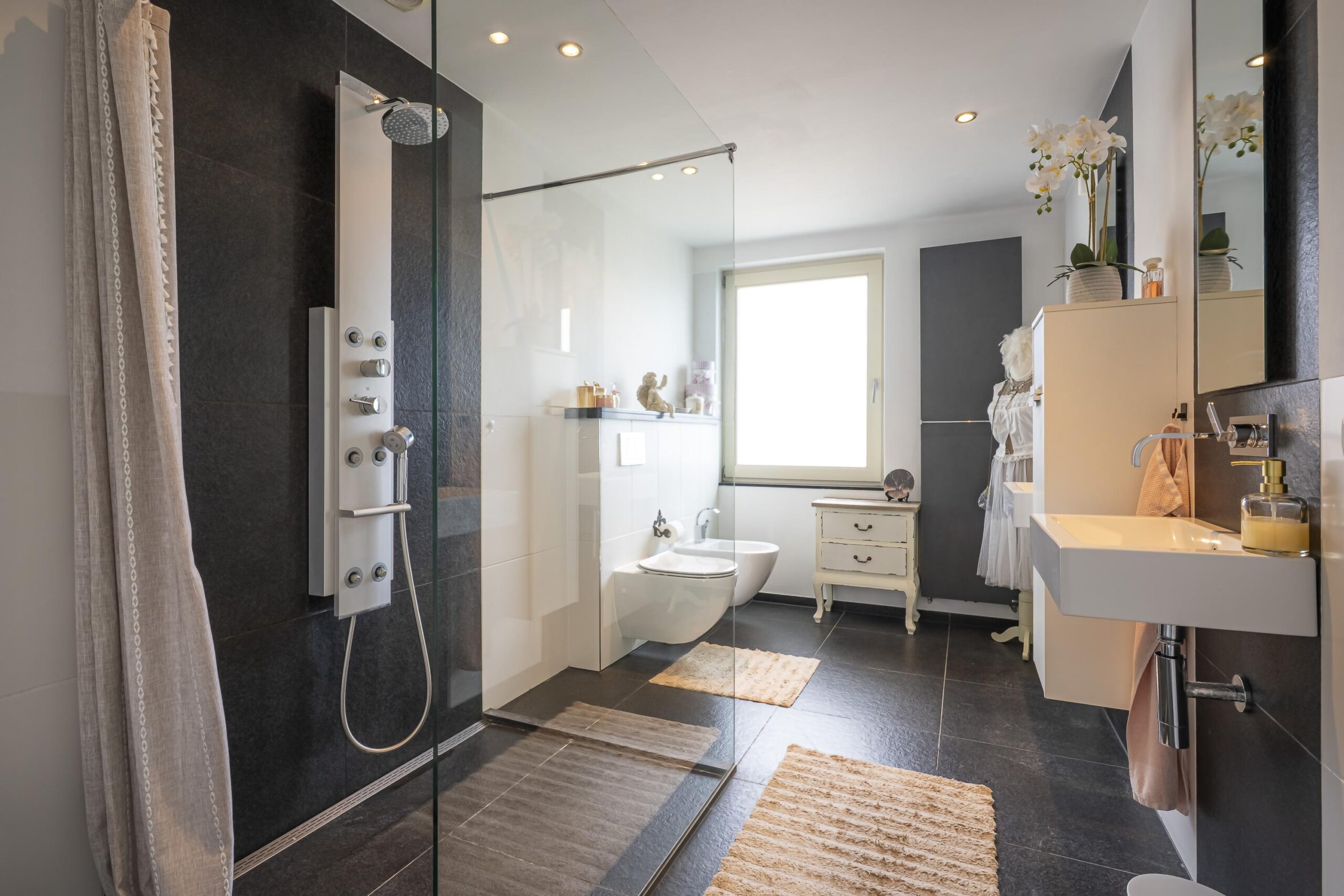 - Badkamervoorzieningen Toilet, bidet, dubbele wastafel, inloopdouche