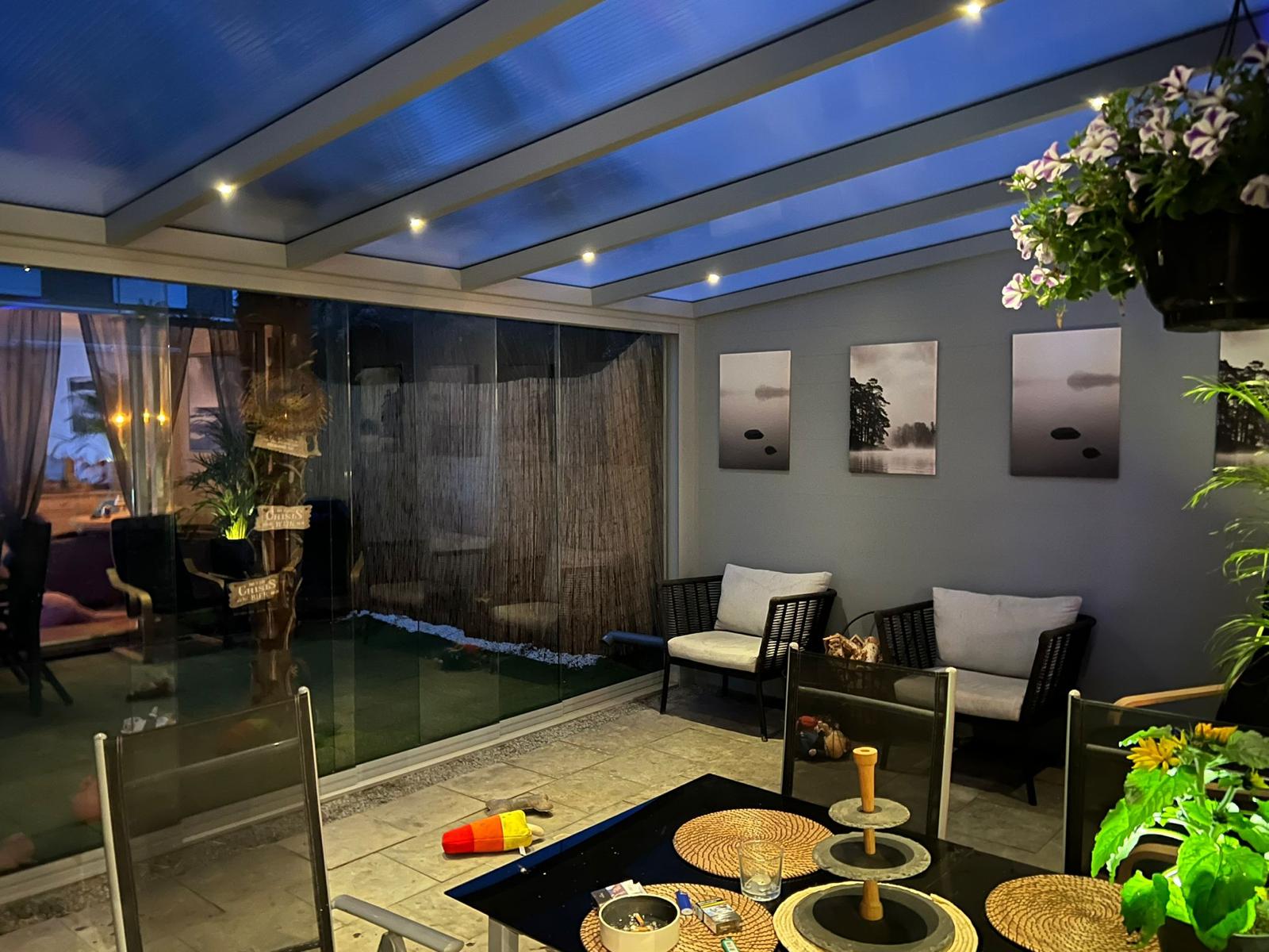 Aangrenzend bevindt zich de recent gerealiseerde wintertuin met airconditioning en verwarming. Vanuit hier is er toegang tot de garage, voorzien van wasaansluitingen, sectionaalpoort en veel bergruimte. Achterin de garage is een extra slaapkamer gecreëerd (ca. 2,75 x 4,70 m).
