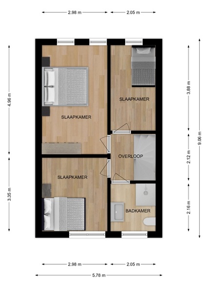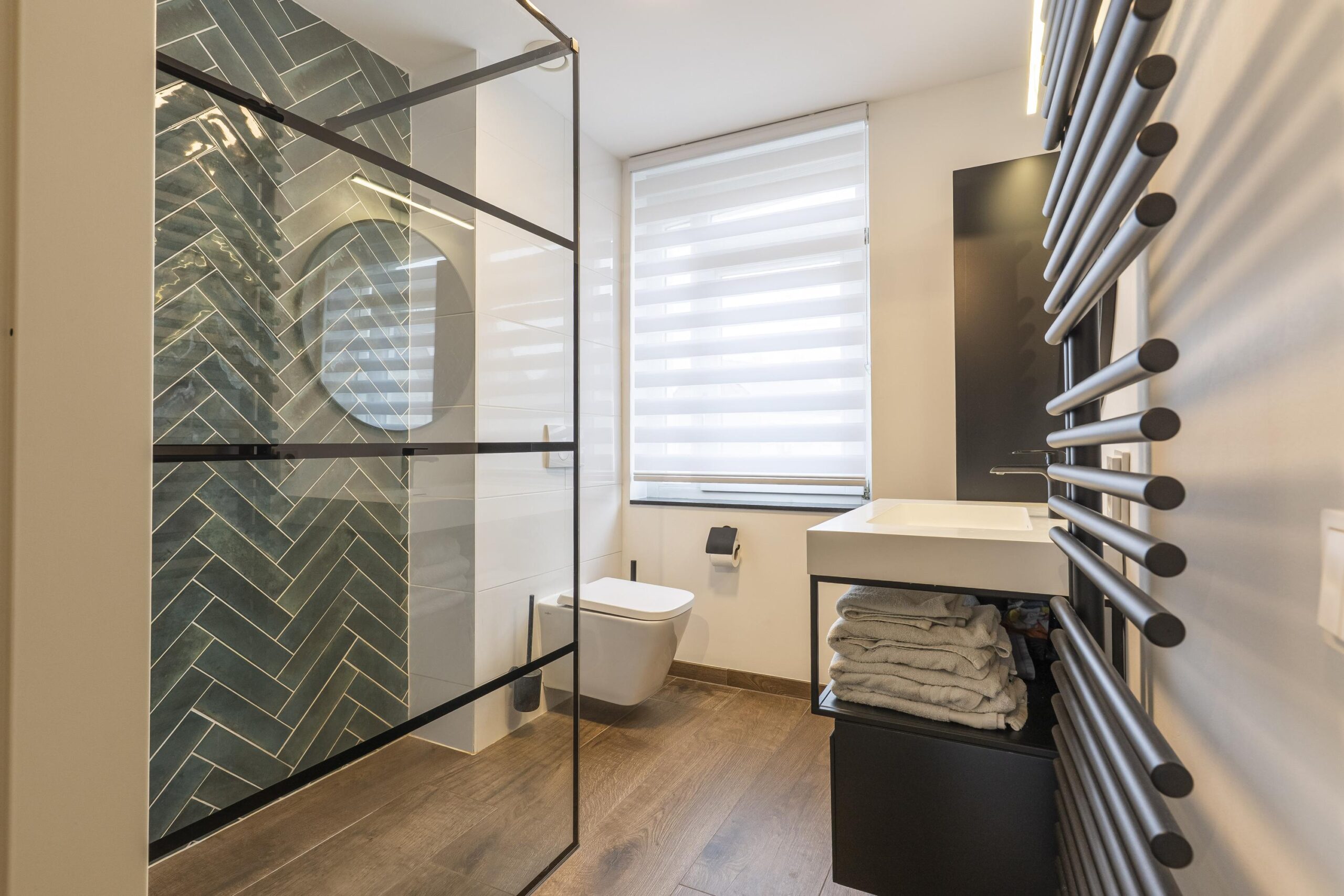 Eerste verdieping: overloop, drie slaapkamers met laminaatvloer en de moderne – ook in 2022 – vernieuwde badkamer met inloopdoiuche, badmeubel en 2e toilet.