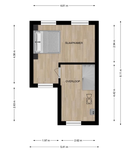 Tweede verdieping: via vaste trap is de verdieping bereikbaar met ruime overloop waar ook de wasmachine- en drogeraansluiting zich bevinden en de C.V.-combi HR-installatie hangt en voorziet in bergruimte. Een ruime vierde slaapkamer is hier gelegen door een dakuitbouw en doet nu dienst als werkkamer. Tevens airco-installatie aanwezig.