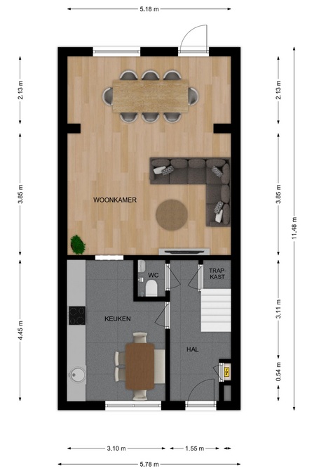 Begane grond: keurige voortuin, entree, hal met plavuizenvloer, moderne meterkast en een verruimd en gemoderniseerd toilet (bj. 2022); zwevend met fonteintje. Trap is voorzien van een trapkast, ideaal voor opbergen van spullen. Toegang tot de leefkeuken met moderne keuken-installatie (bj. 2022) voorzien van een koel-, vriescombinatie, oven, inductie-kookplaat, afzuigkap en vaatwasser. De keuken is één open geheel met de woonkamer die door de aanbouw vel extra leefruimte biedt. Hier ligt een mooie parketvloer en is er ruimschoots plaats voor een zit- en eetgedeelte.
