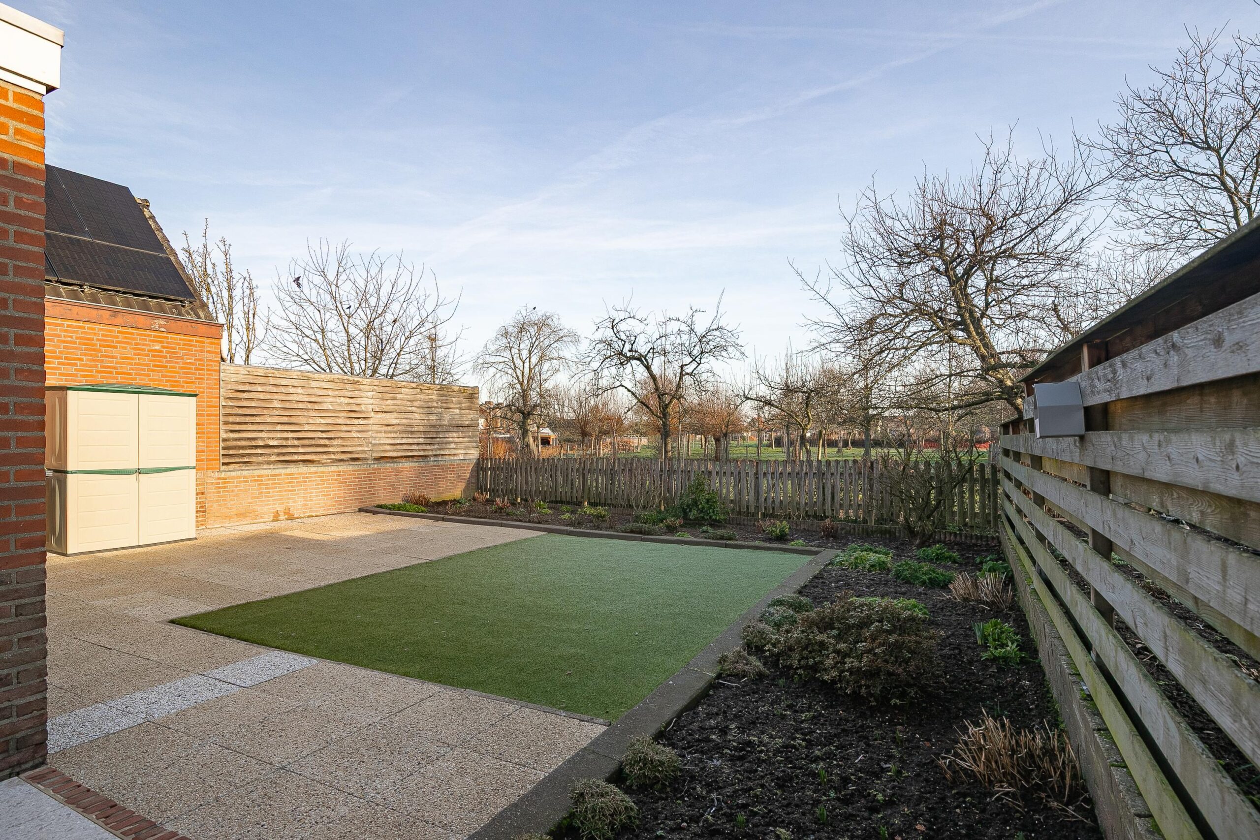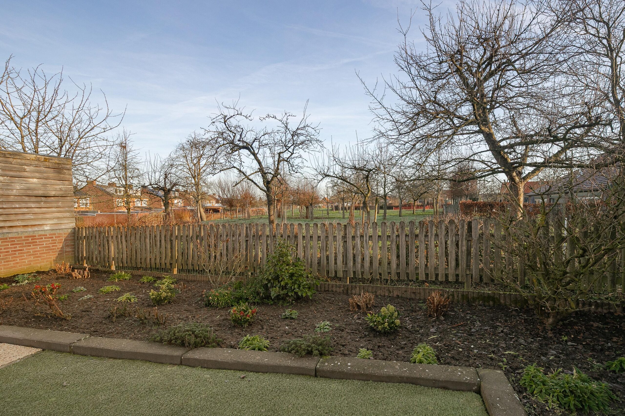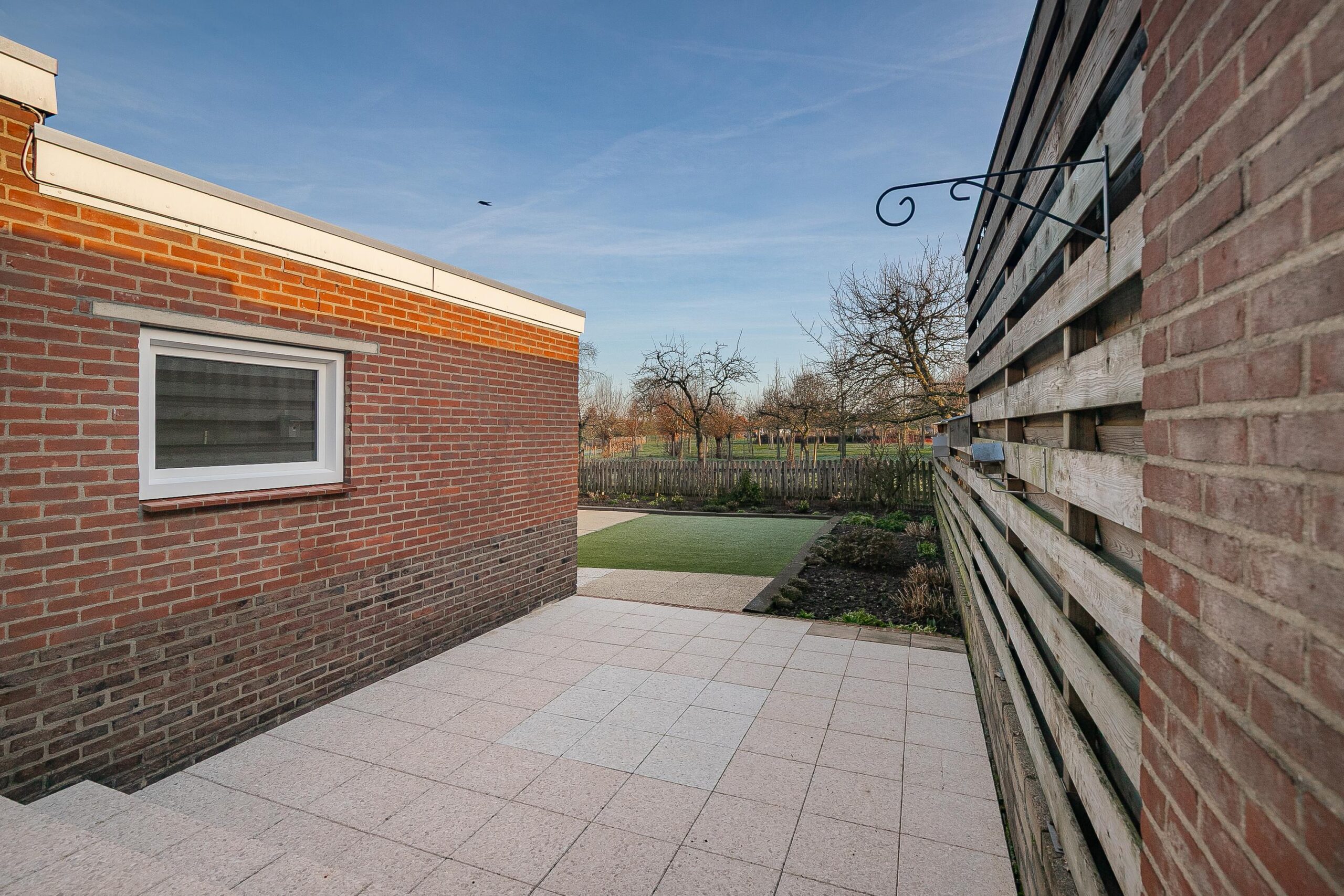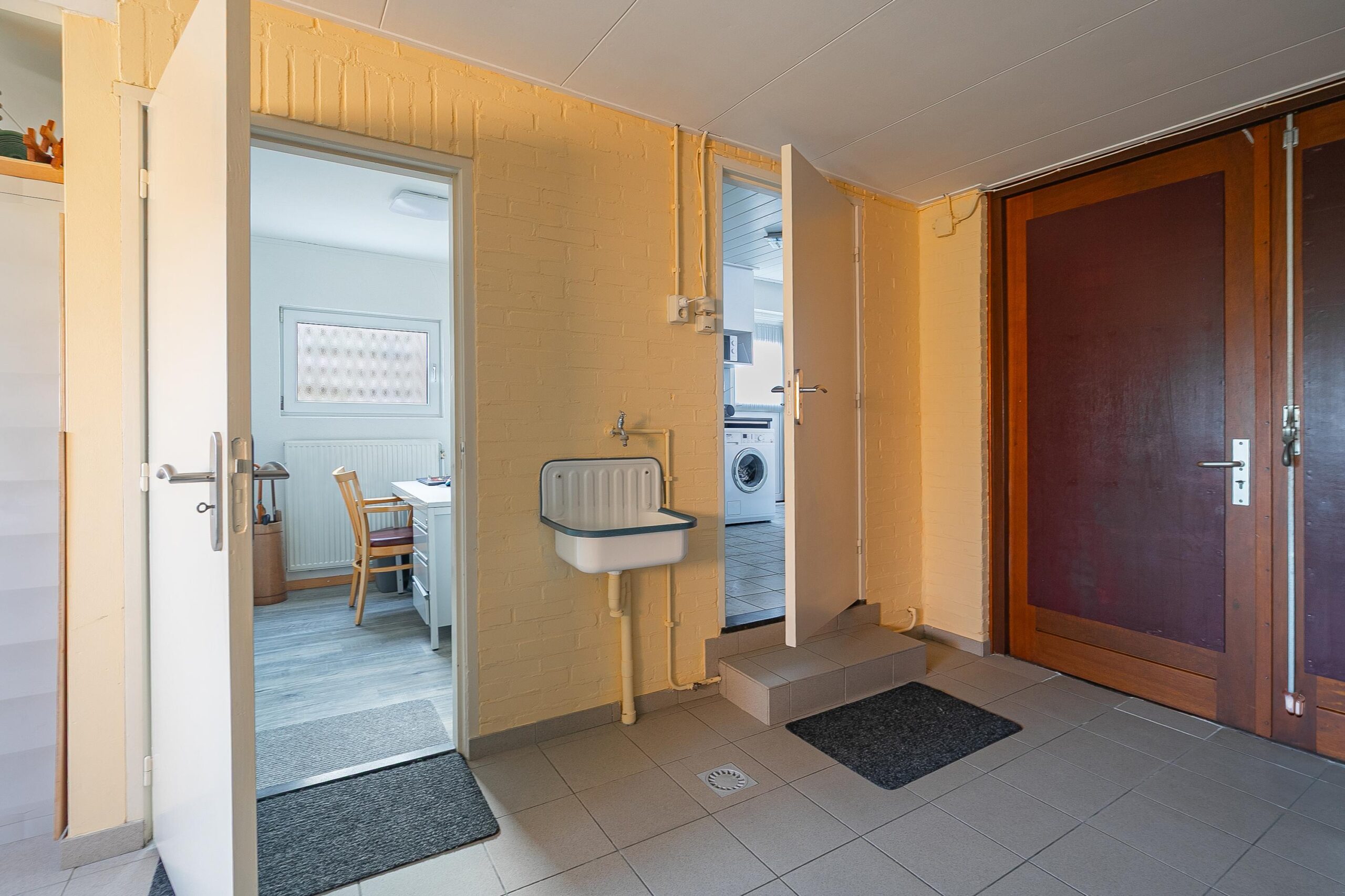 Vanuit de bijkeuken is er toegang tot de ruime inpandige garage (ca. 24 m²). De garage biedt daarnaast toegang tot een kantoorruimte van ca. 5 m² en tot de tuin.