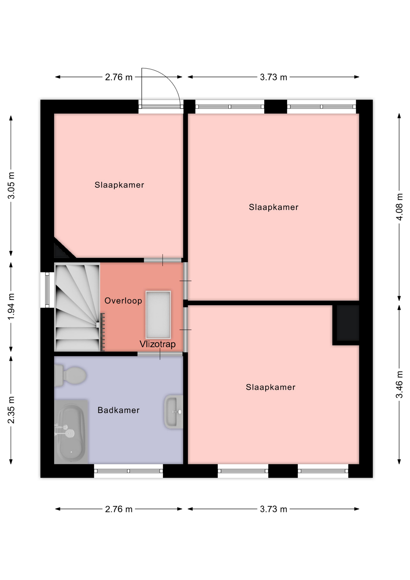 Vanaf de overloop is er toegang tot drie slaapkamers van ca. 15 m², 12 m² en 9 m². De slaapkamer aan de voorzijde is voorzien van rolluiken. De badkamer (ca. 7 m²) is uitgerust met een bad-/douchecombinatie, toilet en wastafel. Daarnaast is er vanaf de overloop toegang tot de zolder middels een vlizotrap.