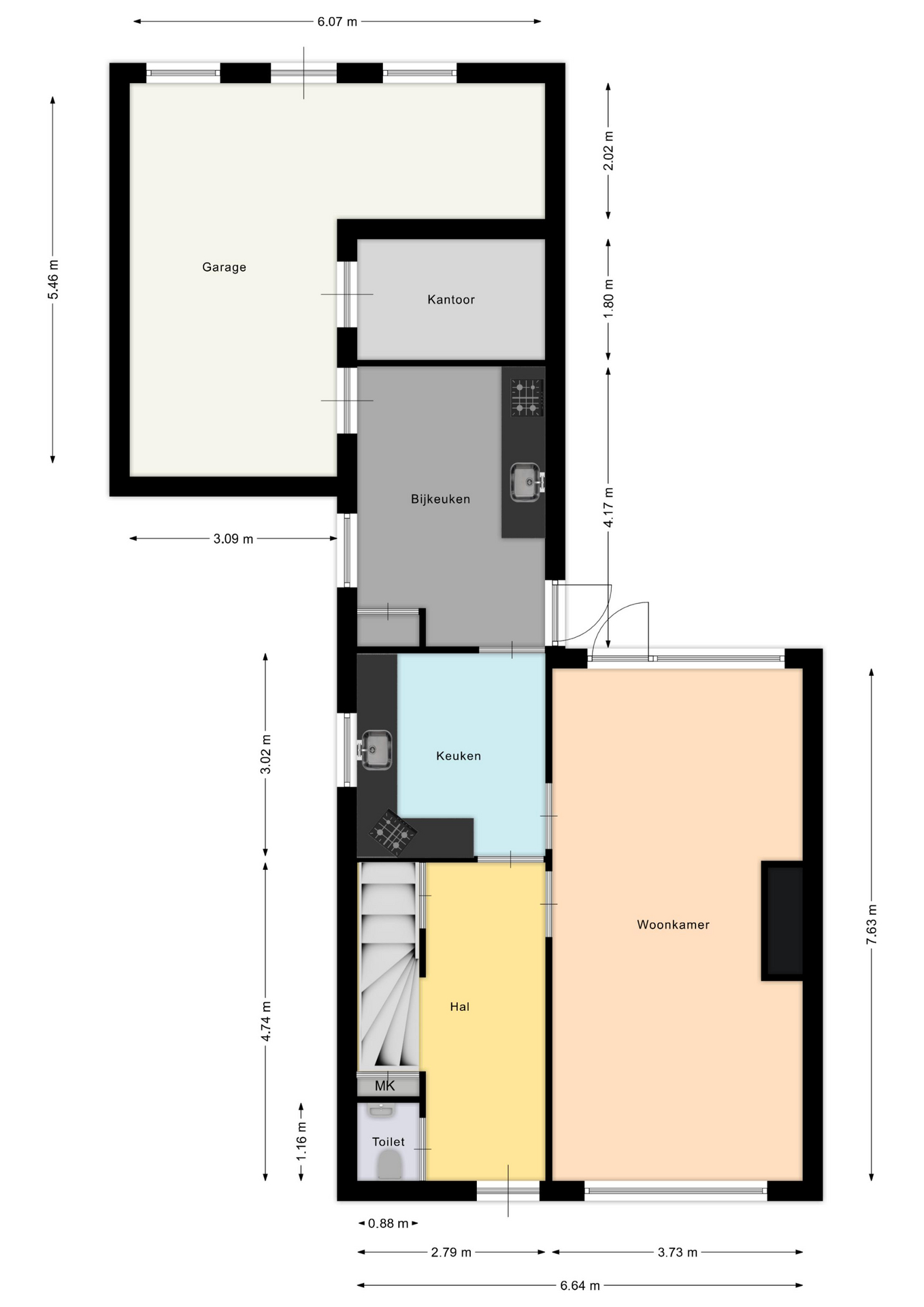 Via de entree komt u in de hal met toilet en de trap naar de eerste verdieping. Vanuit de hal is er toegang tot zowel de keuken als de woonkamer. De ruime en lichte woonkamer (ca. 27 m²) biedt directe toegang tot de achtertuin.