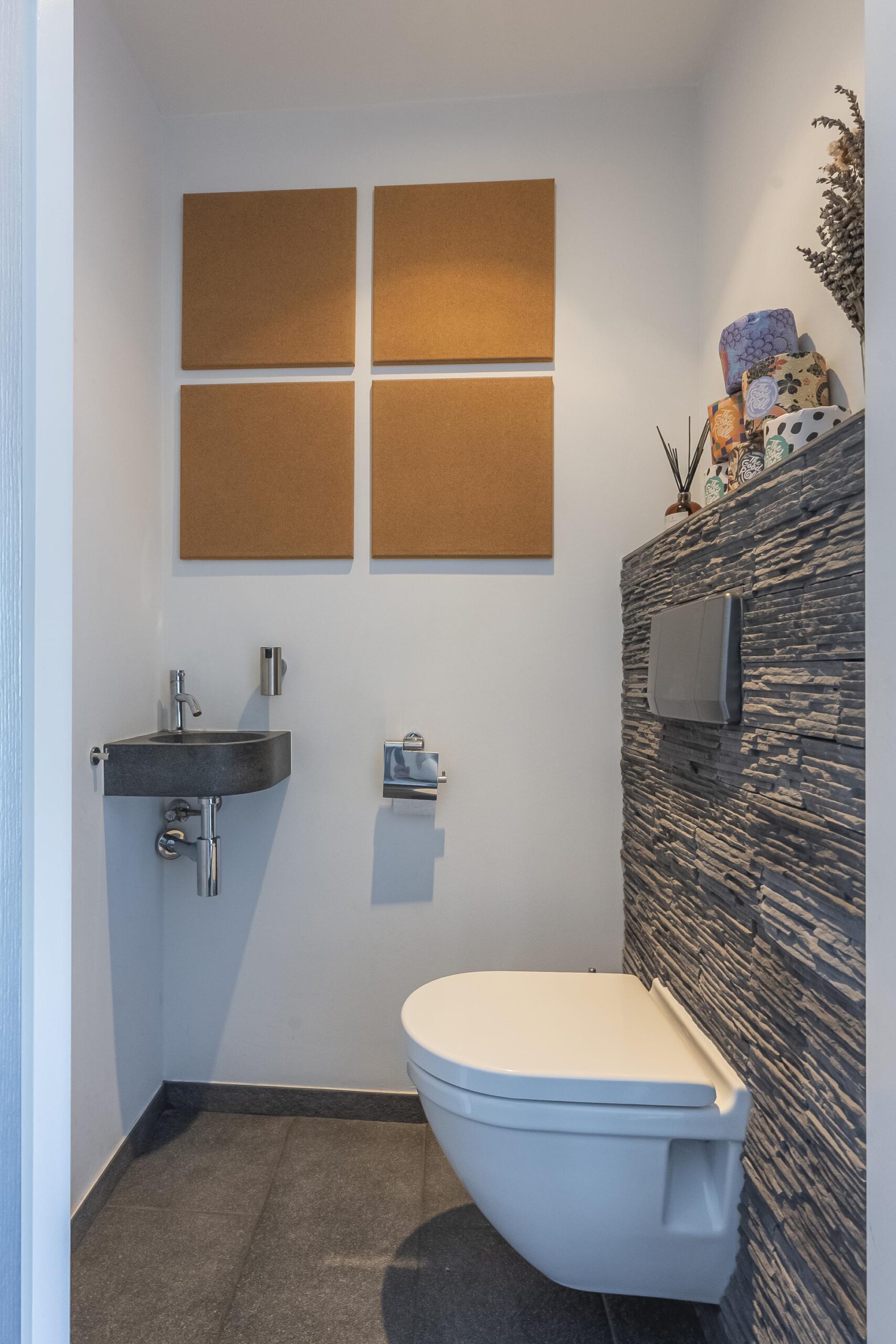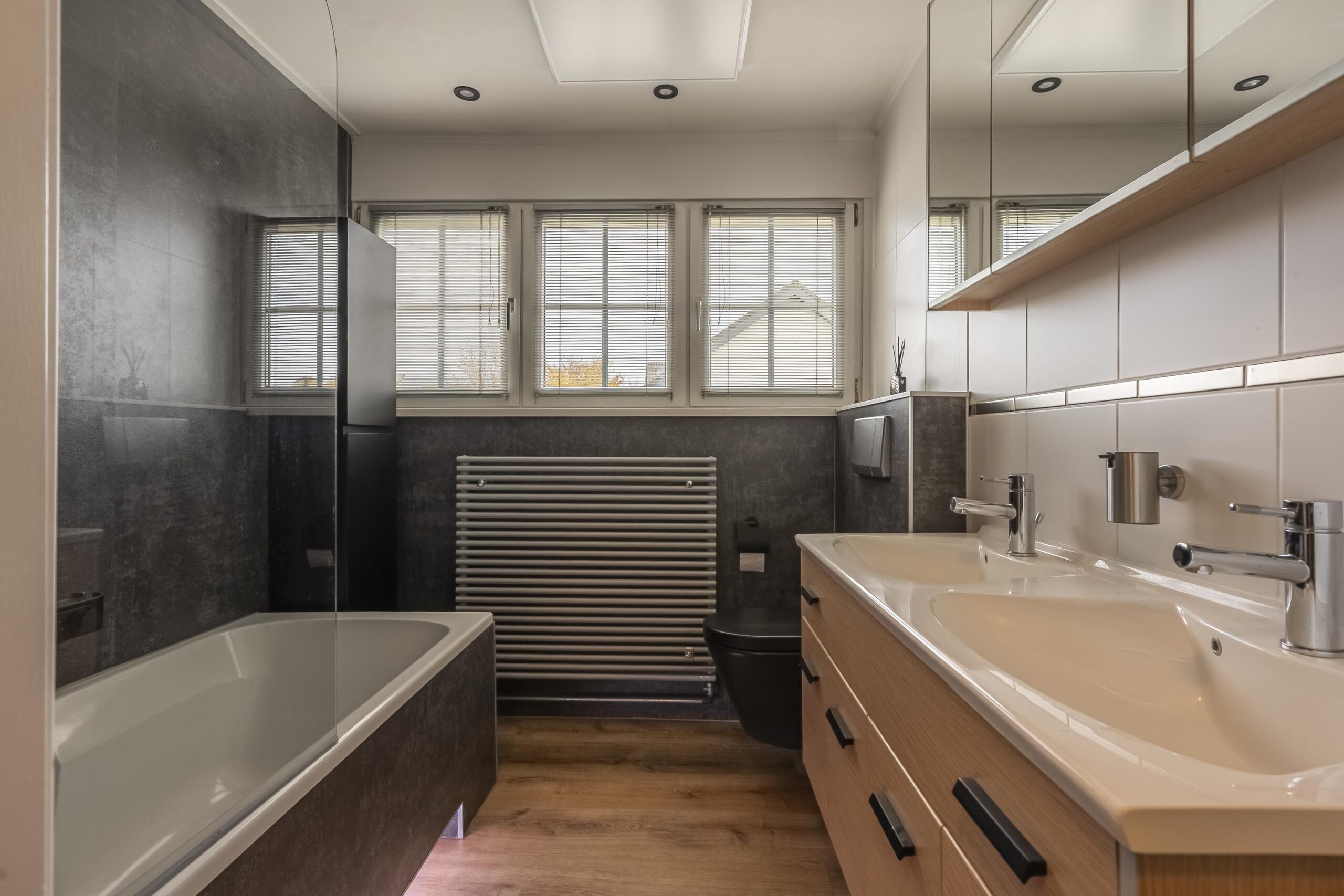 De moderne badkamer (vernieuwd in 2024, ca. 2,30 x 2,25 m) is uitgerust met een ligbad, dubbele wastafel met meubel, zwevende kast en zwevend toilet. Verwarming is mogelijk via een designradiator en/of een IR-warmtepaneel.