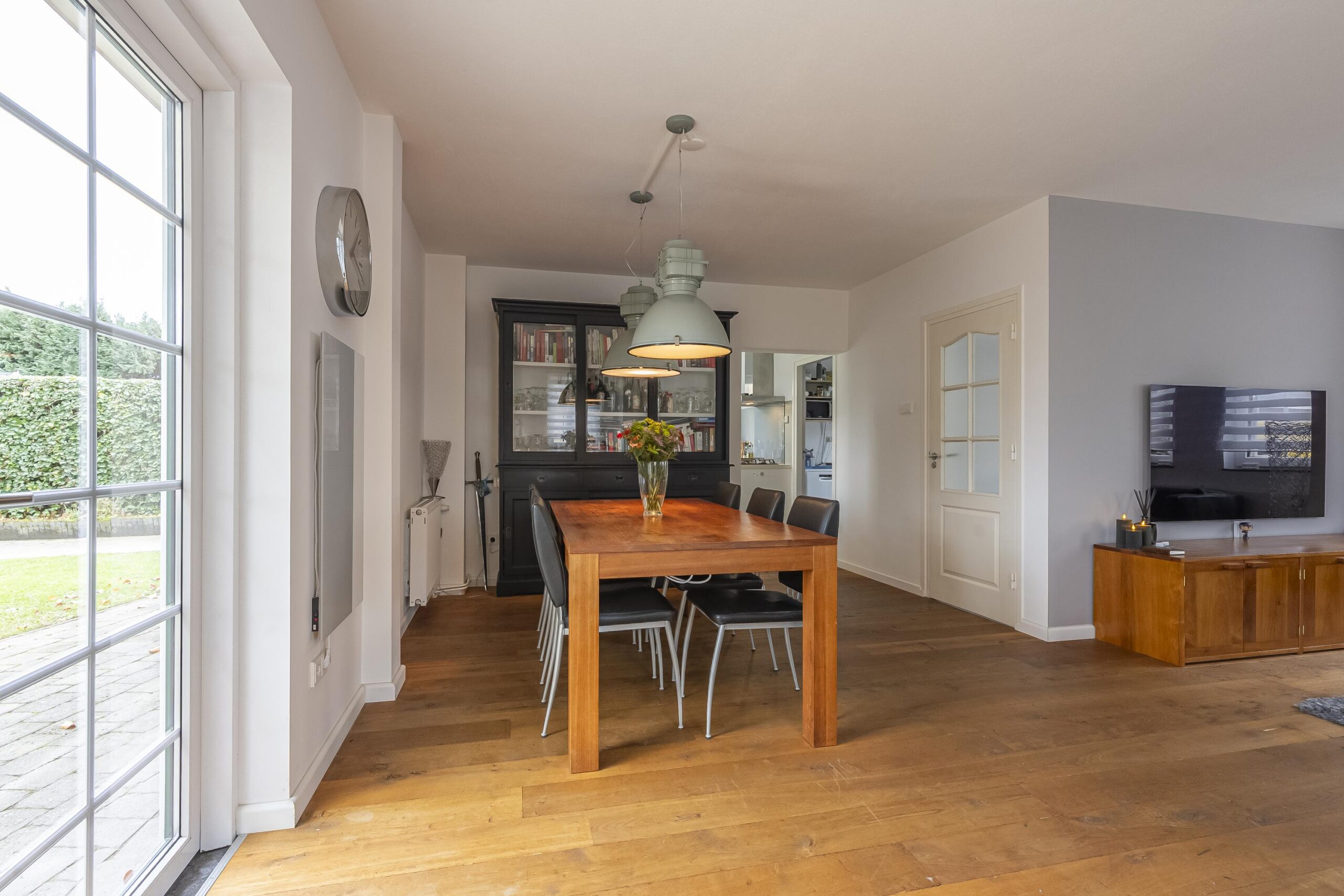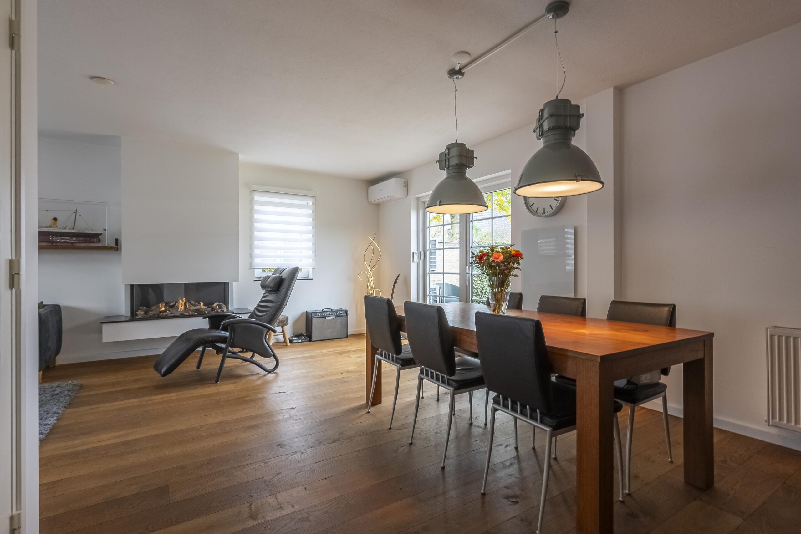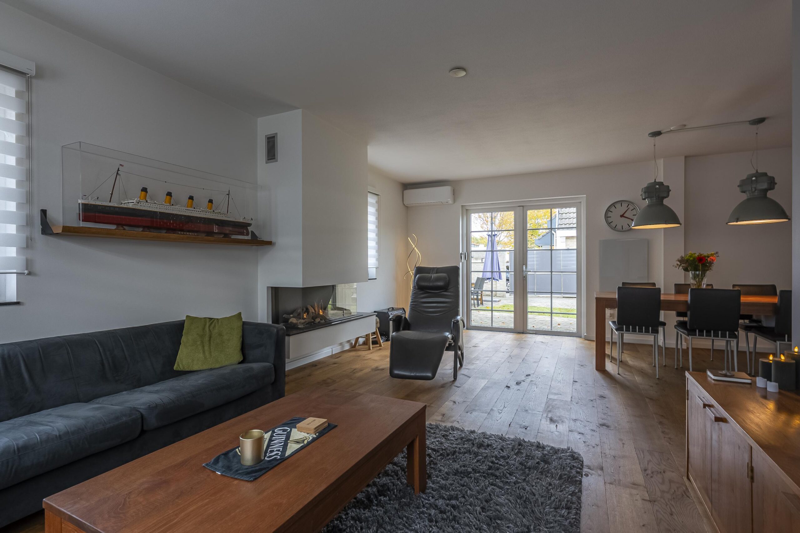 Ruime hal/entree met grindvloer, meterkast, trapopgang en modern toilet met fonteintje. Vanuit de hal bereikt u de sfeervolle L-vormige woonkamer (ca. 7,35 x 6,10 m) met eiken parketvloer, moderne gashaard en veel lichtinval door de grote raampartijen.