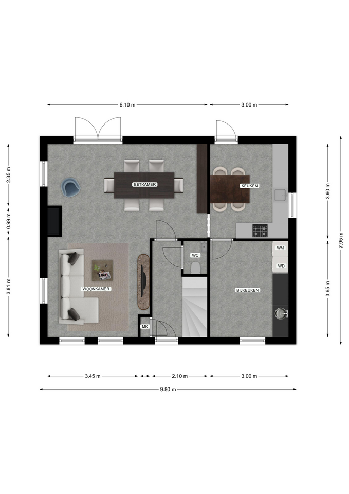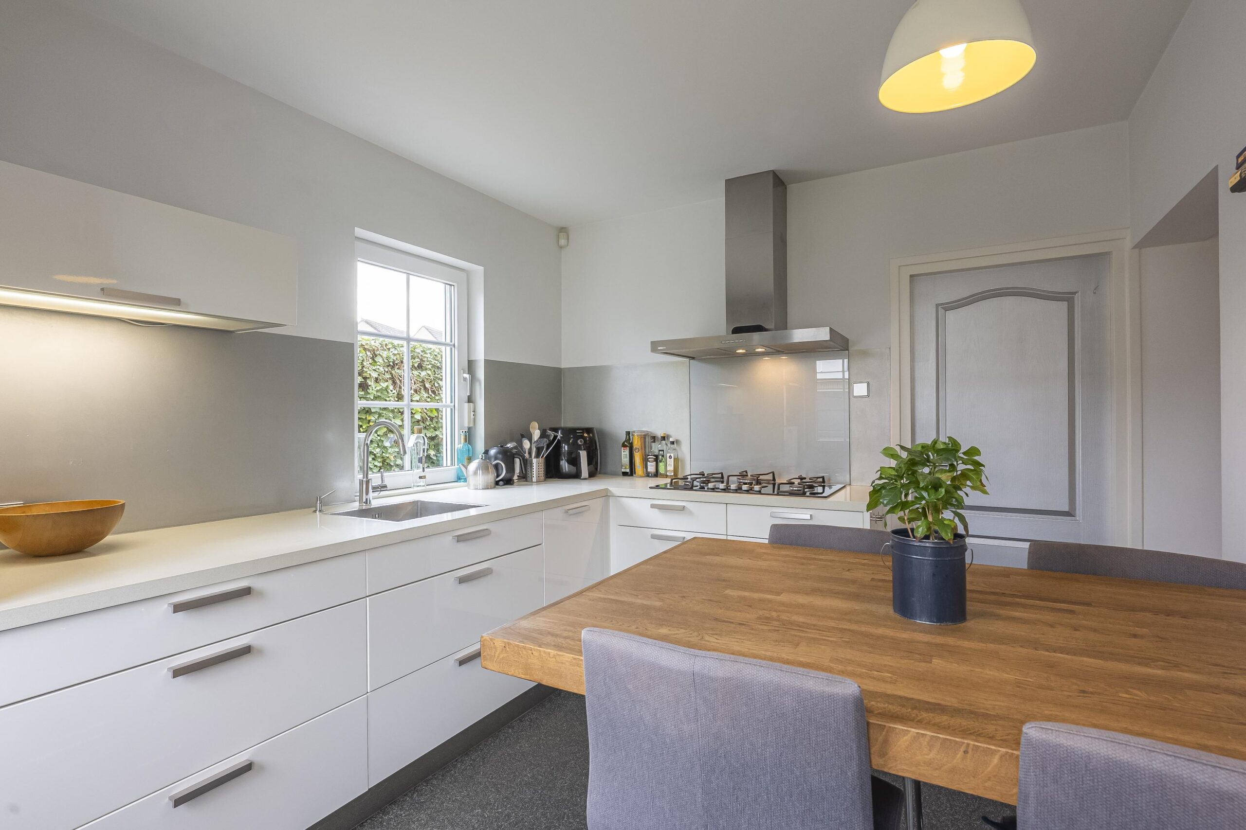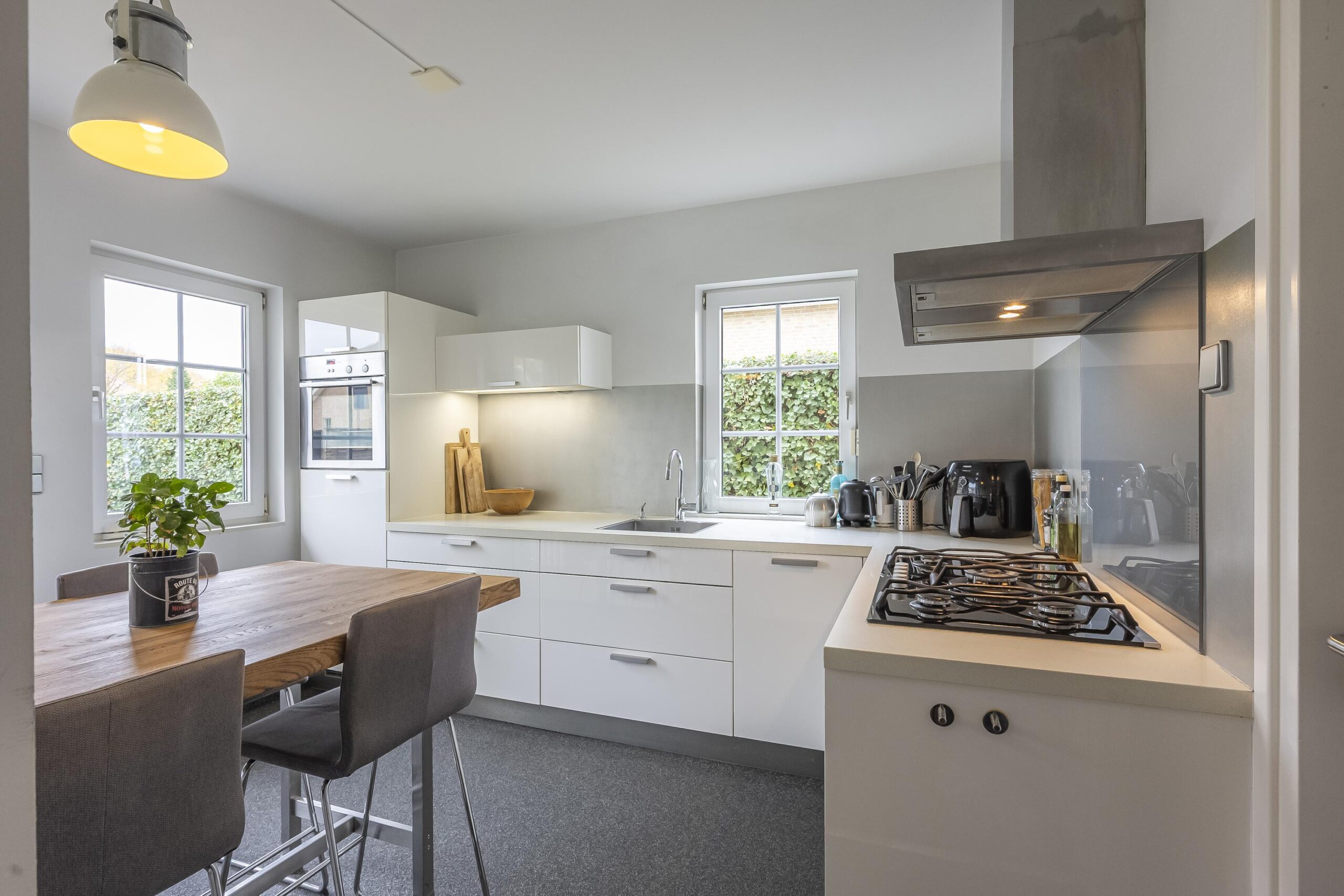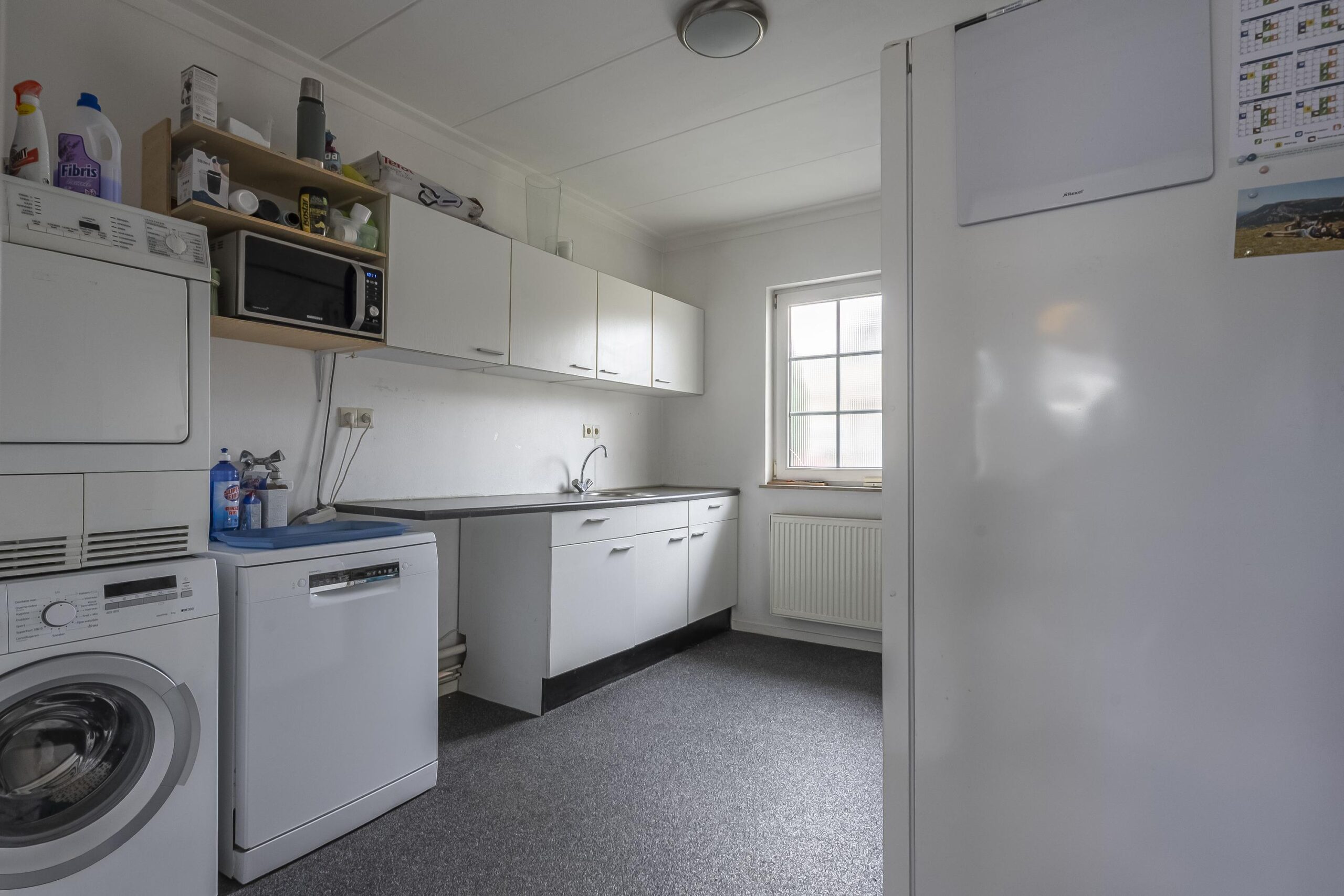 Aansluitend treft u de royale bijkeuken (ca. 3,65 x 3,00 m) met extra werkblad, keukenkastjes, vaatwasser en aansluitingen voor de wasmachine.