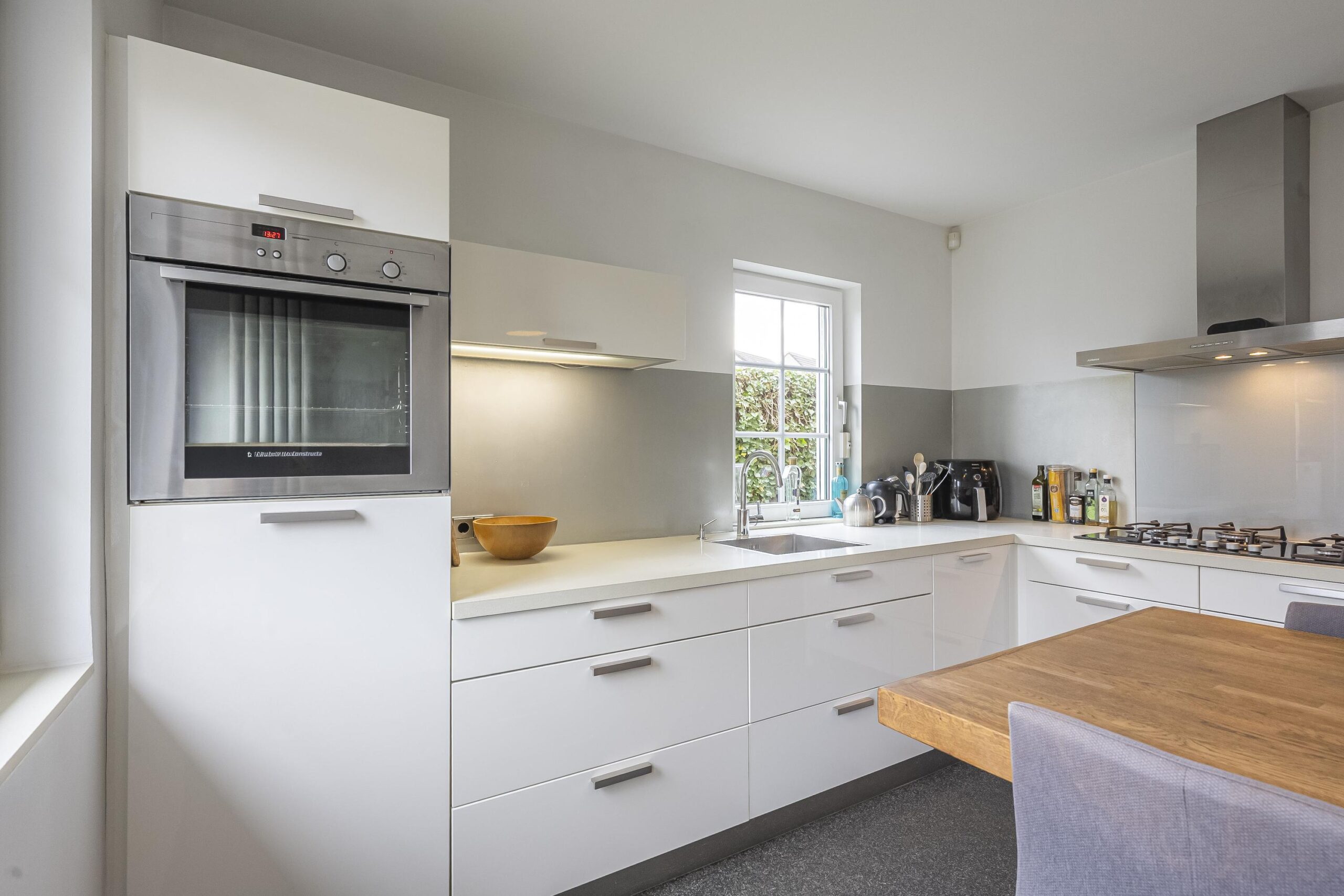 De semi-open keuken (ca. 3,60 x 3,00 m) is uitgevoerd in een praktische L-vorm, voorzien van een hardstenen werkblad, 5-pits gaskookplaat, afzuigkap, grote oven en koelkast.