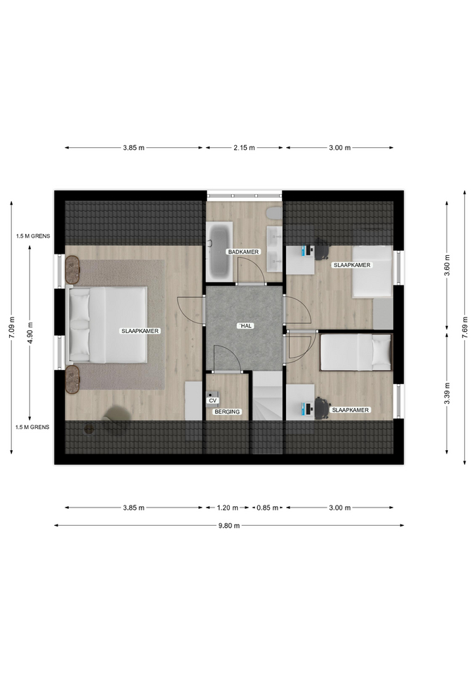 Overloop met toegang tot drie slaapkamers (ca. 4,90 x 3,85 m / 2,40 x 3,00 m / 2,35 x 3,00 m), allen voorzien van een laminaatvloer. De grootste slaapkamer beschikt over een royale kastenwand.