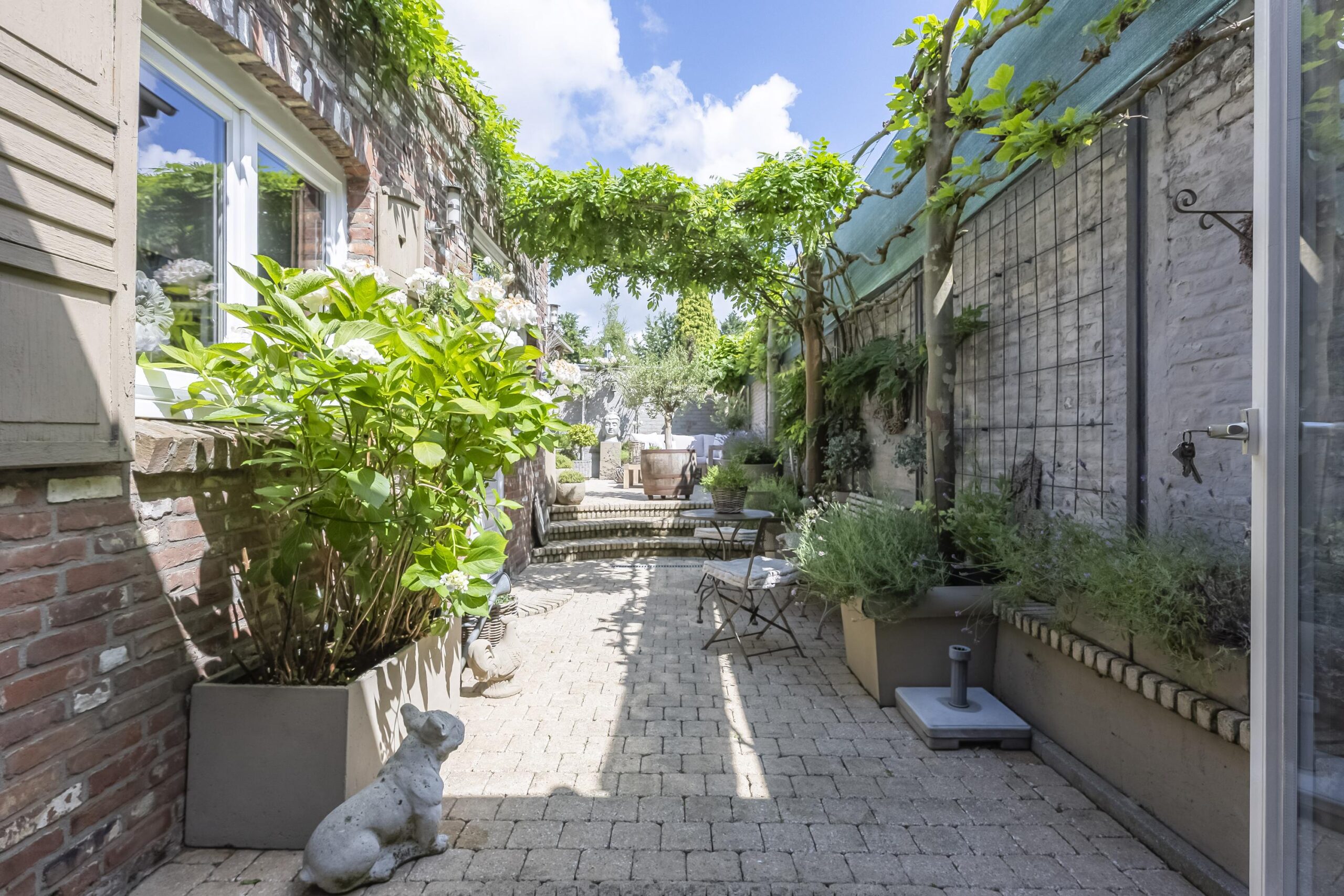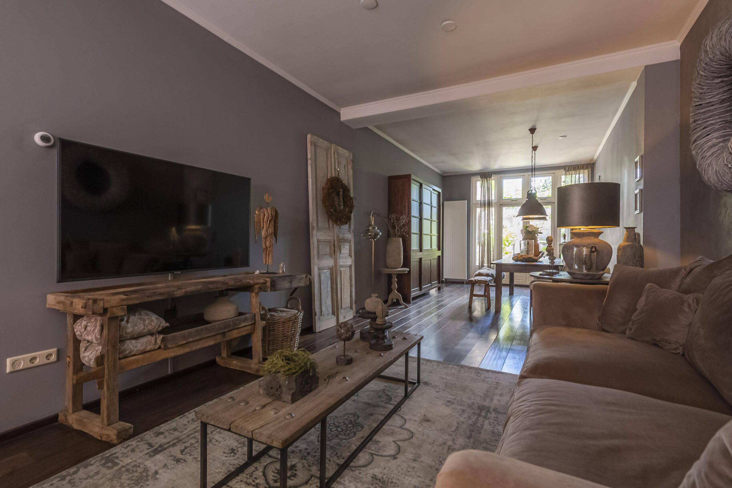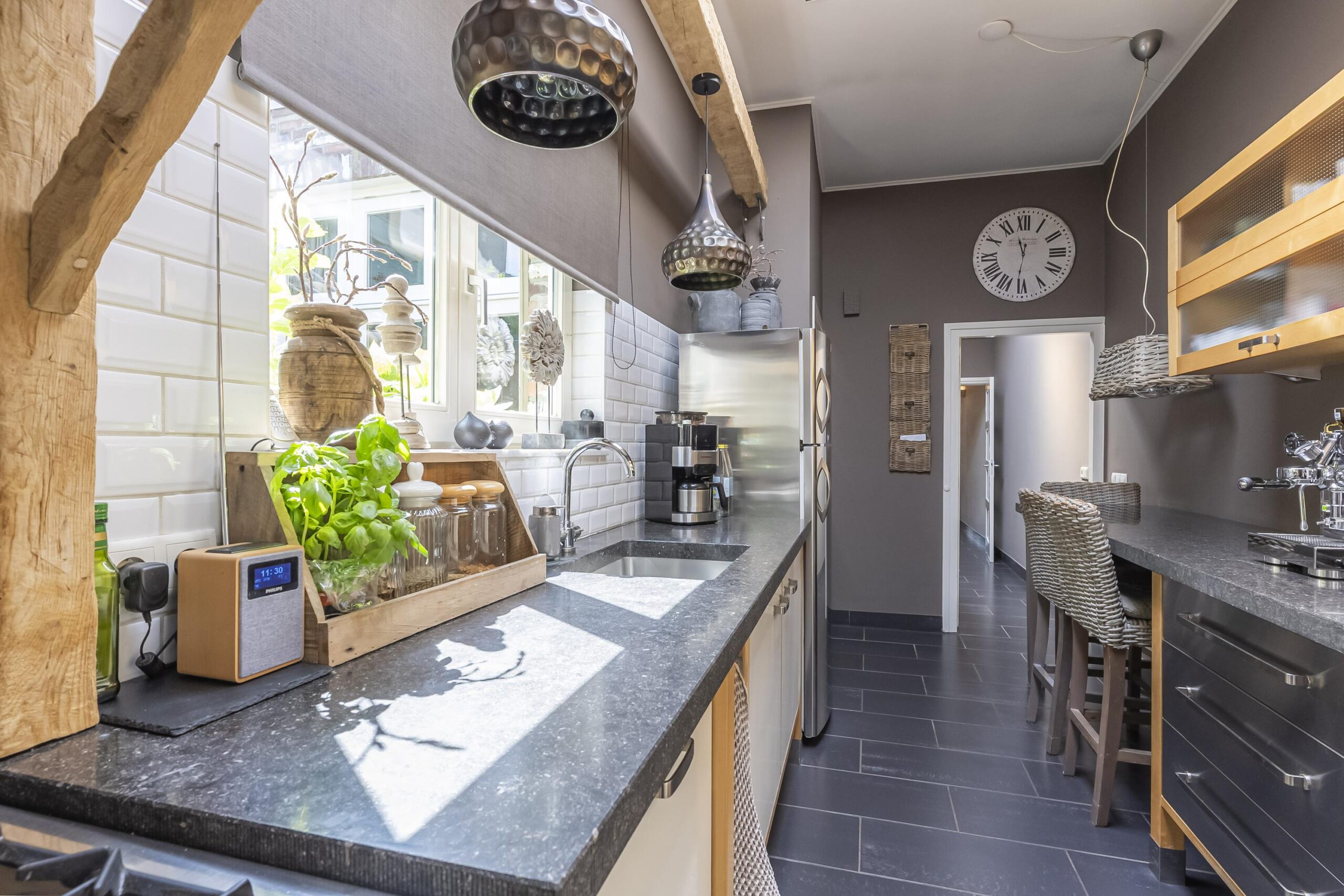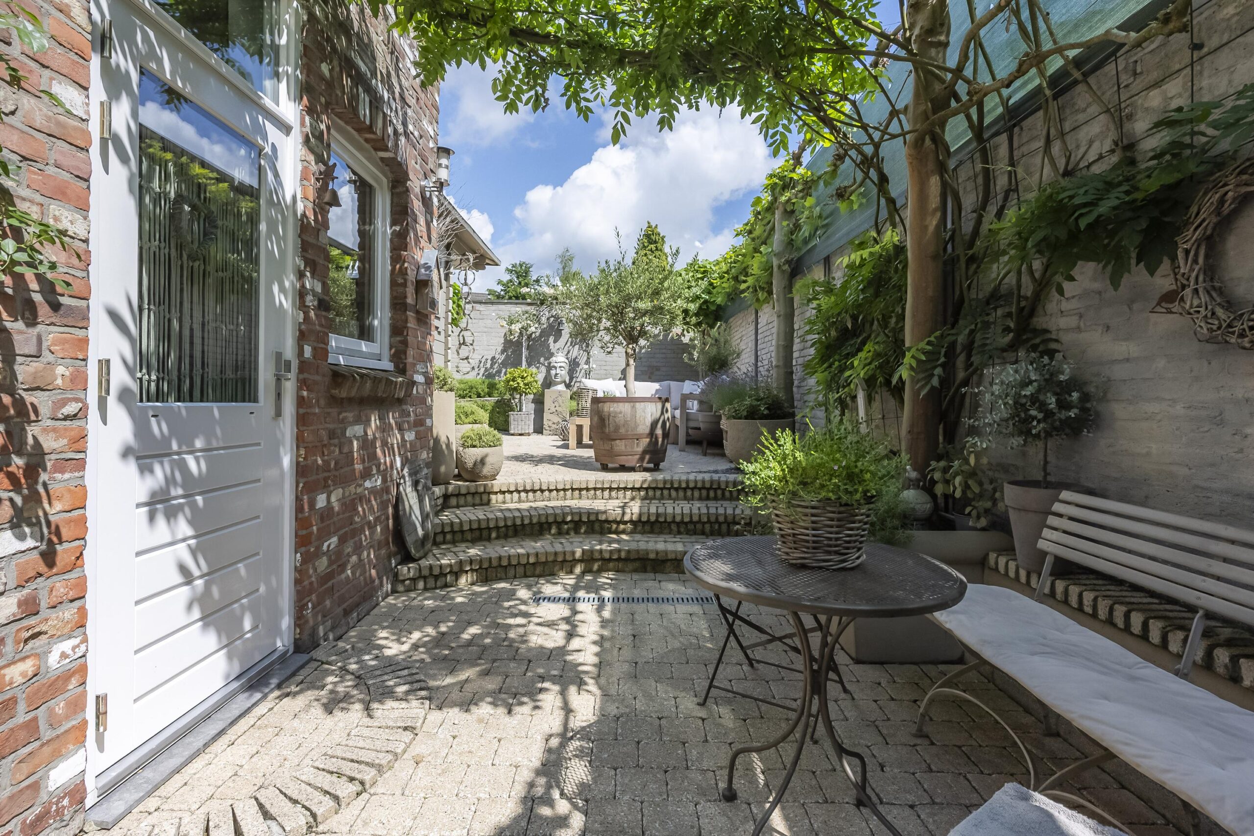 Begane grond: hal, meterkast, trappenhuis en het zwevende toilet met fonteintje. Tevens is hier een kantoor-. hobbyruimte die tevens dienst doet als garderobe. Ruime woonkamer met een prachtige Zuid-Amerikaanse hardhouten vloer en openslaande deuren naar tuin. De gesloten keuken heeft een tegelvloer en een moderne keuken-installatie met diverse apparatuur waaronder een 5-pits gasfornuis merk Sittal met een electrische hete lucht oven plus eetbarretje. Het aanrechtblad is van Belgisch hardsteen. Aansluitend is de bijkeuken gesitueerd waar ook de wasmachine-aansluiting zich bevindt. Vanuit hier is de ook de fraai aangelegde en sfeervolle tuin bereikbaar. Deze biedt alle privacy en beschikt tevens over een tuinhuis voor opslag.