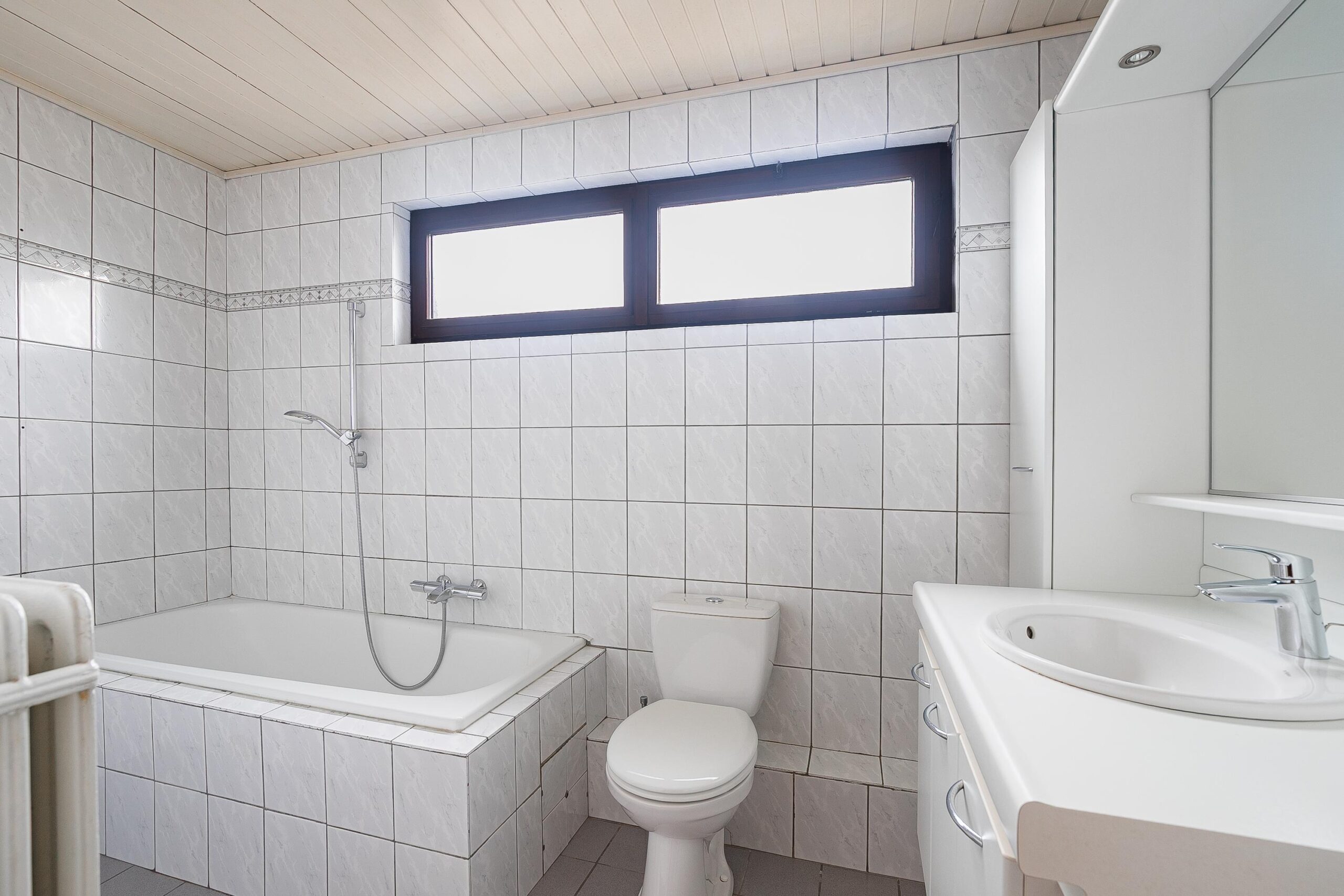 De volledig betegelde badkamer is praktisch ingedeeld en uitgerust met een ligbad, wastafelmeubel en toilet. Dankzij het raam is er zowel natuurlijke ventilatie als daglicht aanwezig.