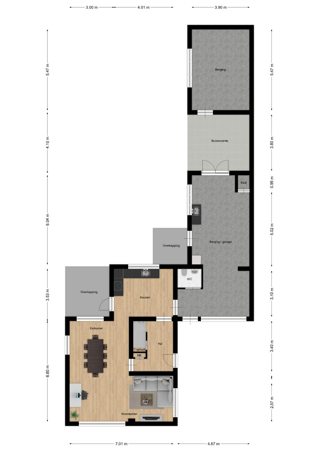 Via de entree bereikt u de hal, die toegang biedt tot de meterkast, een praktische trapkast met extra bergruimte en de woonkamer. De ruime woonkamer (circa 50 m² inclusief eetgedeelte) kenmerkt zich door een prettige lichtinval. Vanuit de woonkamer is de keuken bereikbaar, welke praktisch is ingericht in een hoekopstelling en is voorzien van diverse inbouwapparatuur, waaronder een afzuigkap, 4-pits keramische kookplaat, koelkast, oven en spoelbak. Via de keuken is de inpandige garage (circa 35 m²) toegankelijk, voorzien van een automatische garagepoort en een extra ruimte voor het toilet met fonteintje. Deze ruimte is geschikt voor het parkeren van een voertuig, het stallen van fietsen of als extra bergruimte. Vanuit de garage is er toegang tot de tuin. Aansluitend bevindt zich een overdekte buitenruimte en een extra berging (ca. 25 m²) .