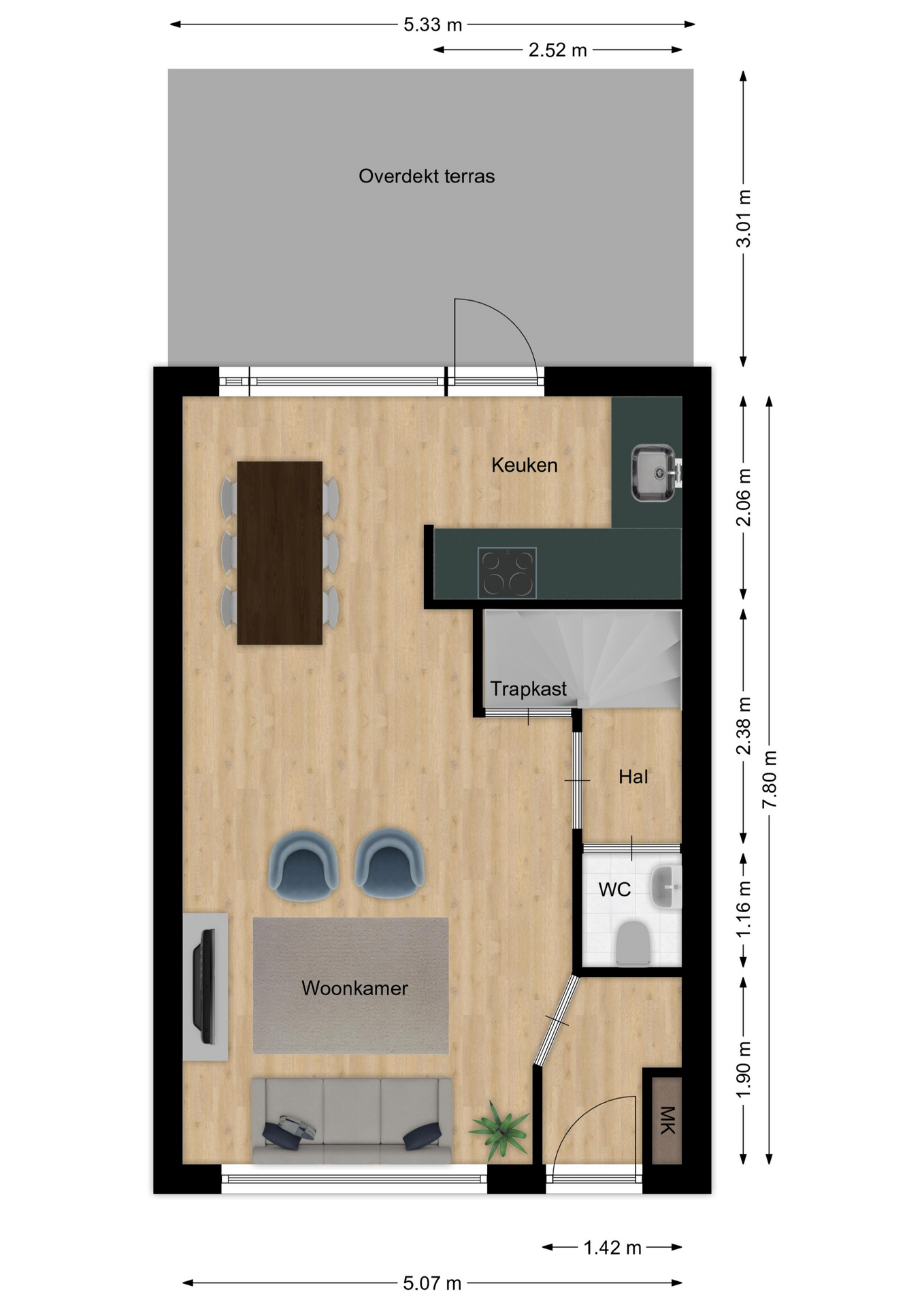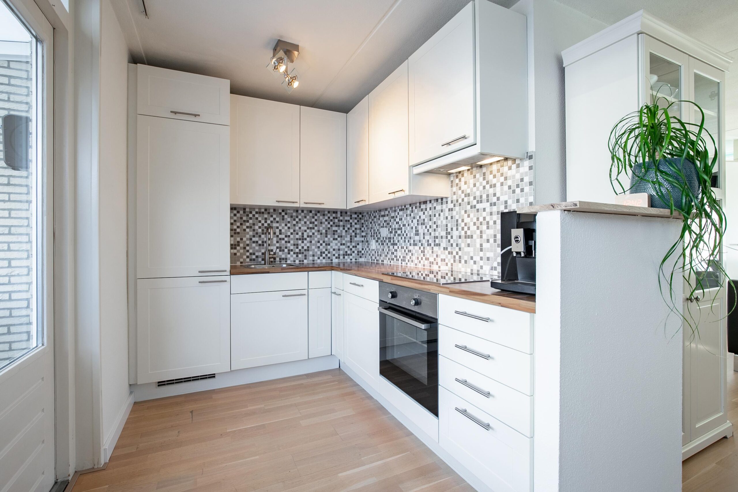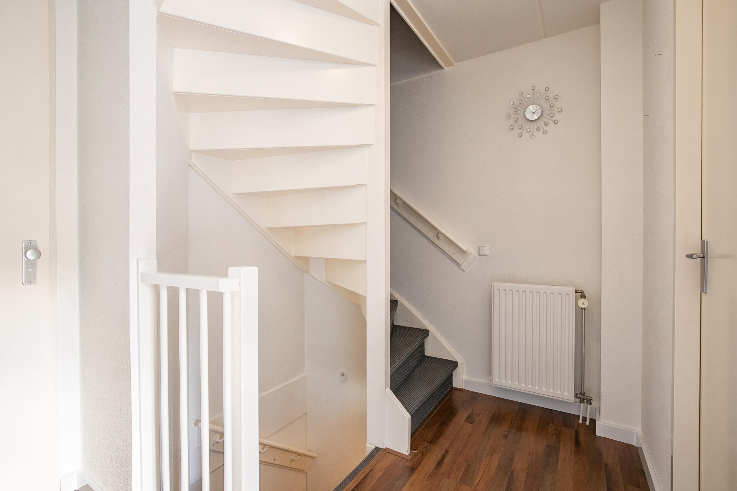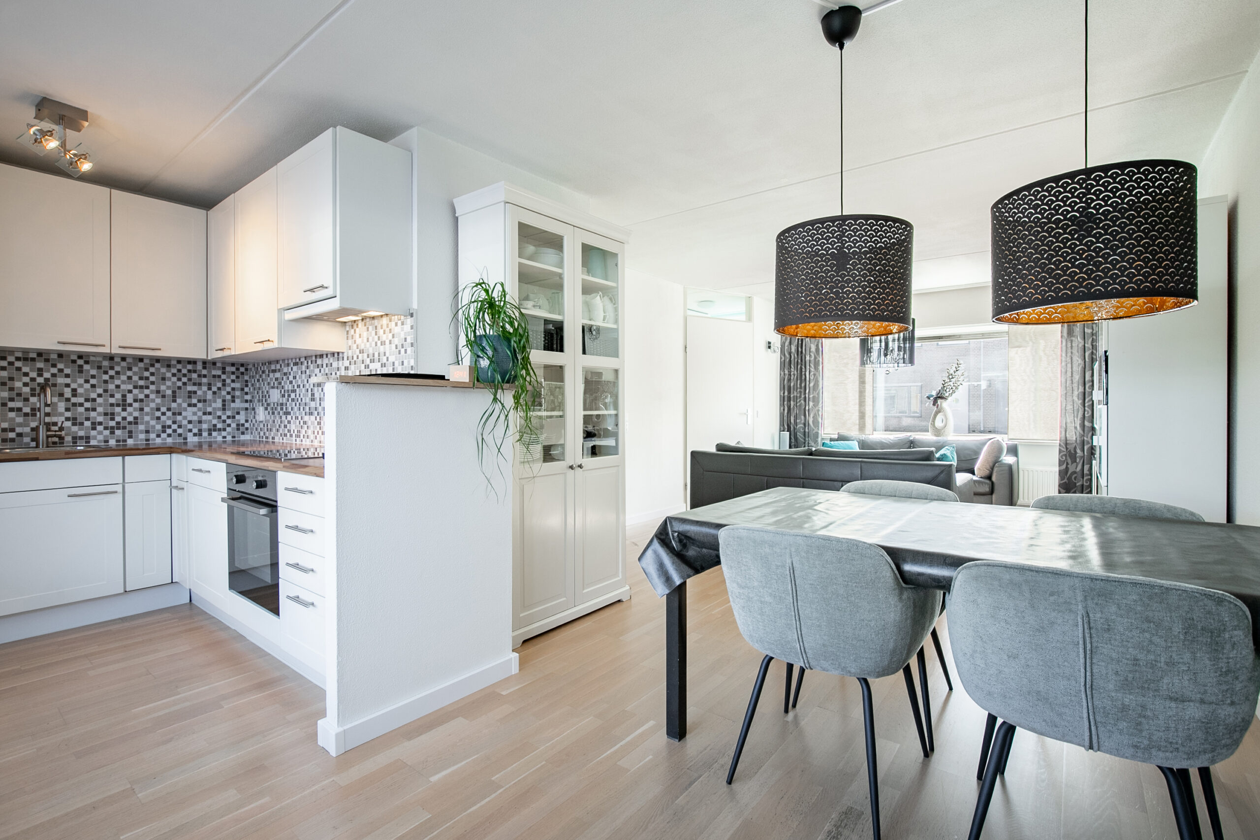 Via de entree met meterkast betreedt u de woonkamer. Vanuit hier is de hal bereikbaar met toegang tot het toilet en de trap naar de eerste verdieping. Onder de trap bevindt zich een handige opbergkast, ideaal voor extra bergruimte. De woonkamer is ruim en licht dankzij de grote raampartijen. Aan de achterzijde biedt de woonkamer direct toegang tot de tuin. De halfopen moderne keuken is ingericht in een hoekopstelling en voorzien van diverse inbouwapparatuur, waaronder een koel-vriescombinatie, oven, vierpitsinductiekookplaat, afzuigkap en vaatwasser.