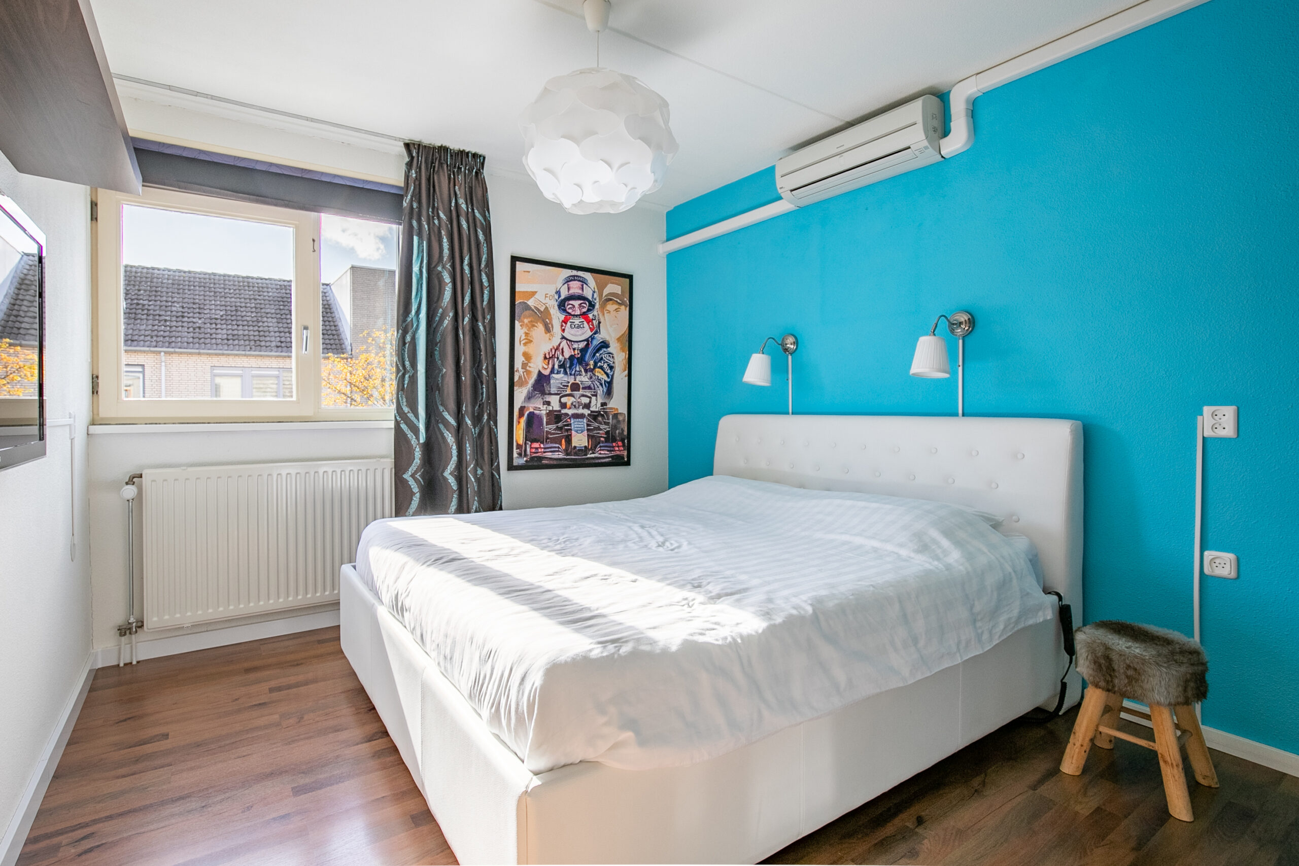 Via de overloop is er toegang tot drie slaapkamers en de badkamer. Aan de voorzijde liggen twee slaapkamers van circa 12 m² en circa 6 m², waarbij de grootste slaapkamer is voorzien van airconditioning. Aan de achterzijde bevindt zich een derde slaapkamer van circa 8 m², eveneens uitgerust met airconditioning. De badkamer is ingericht met een douche, wastafel en toilet. Vanaf de overloop is de tweede verdieping te bereiken.