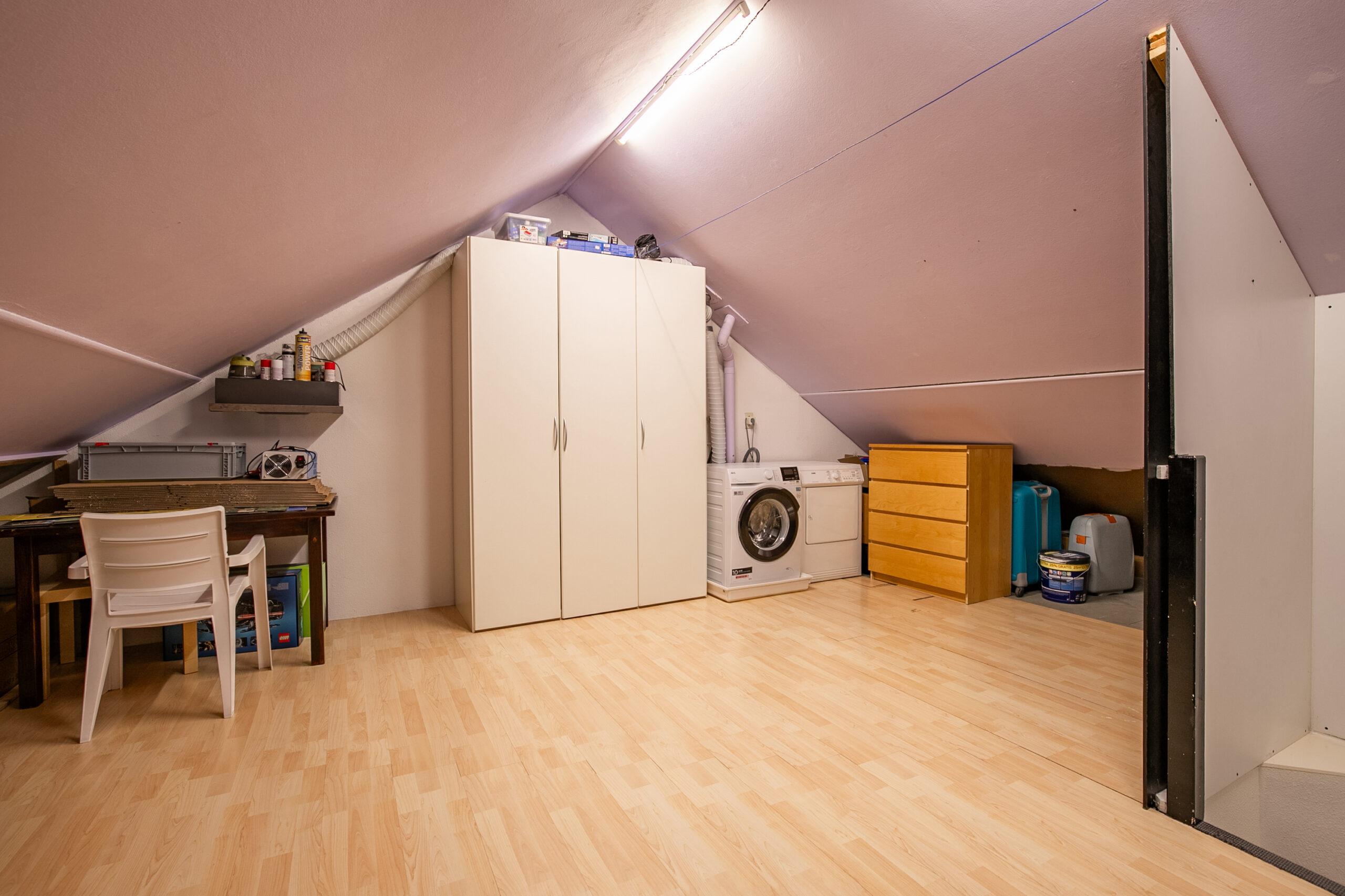 Via een vaste trap bereikt u de zolder, die extra bergruimte biedt en desgewenst als hobby-, slaap- of werkkamer kan worden ingericht. Daarnaast bevinden zich hier de aansluitingen voor het witgoed.