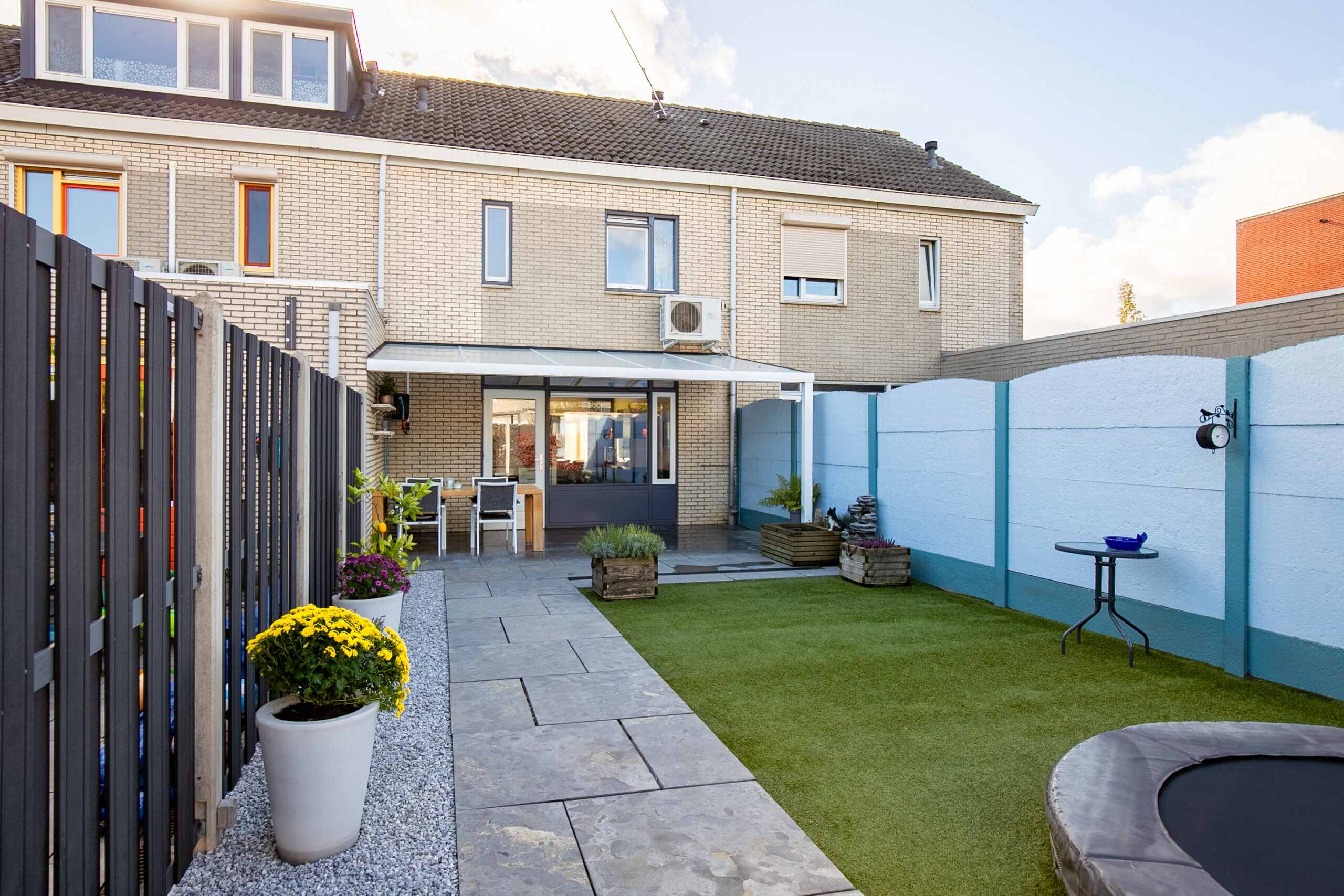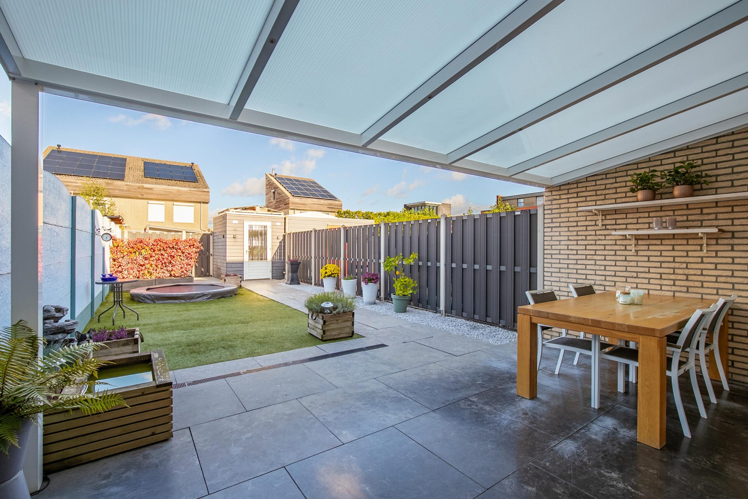 De tuin is verzorgd aangelegd met een overdekt terras dat fraai aansluit op het gazon. Het terras biedt volop ruimte voor een comfortabele lounge- of eethoek. Verder is er een praktische berging aanwezig en is de tuin ook achterom bereikbaar, wat het gebruiksgemak vergroot.