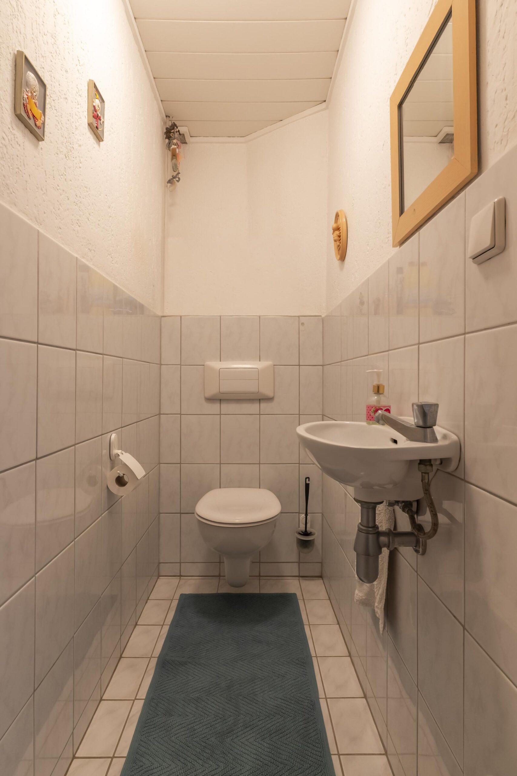 Hal met trapopgang, meterkast en betegelde toiletruimte met zwevend toilet en fontein.