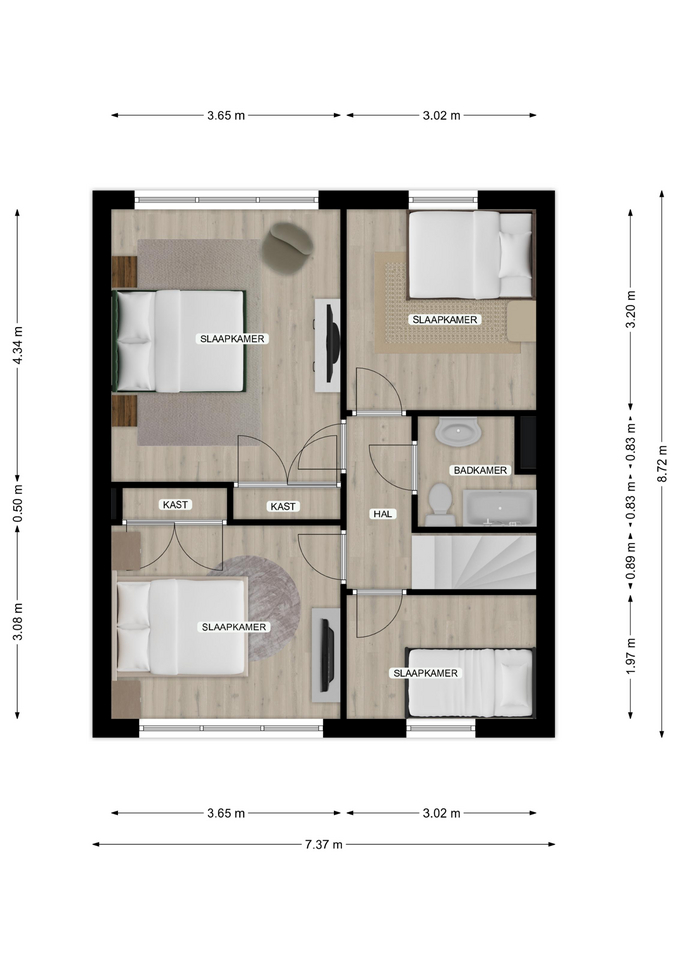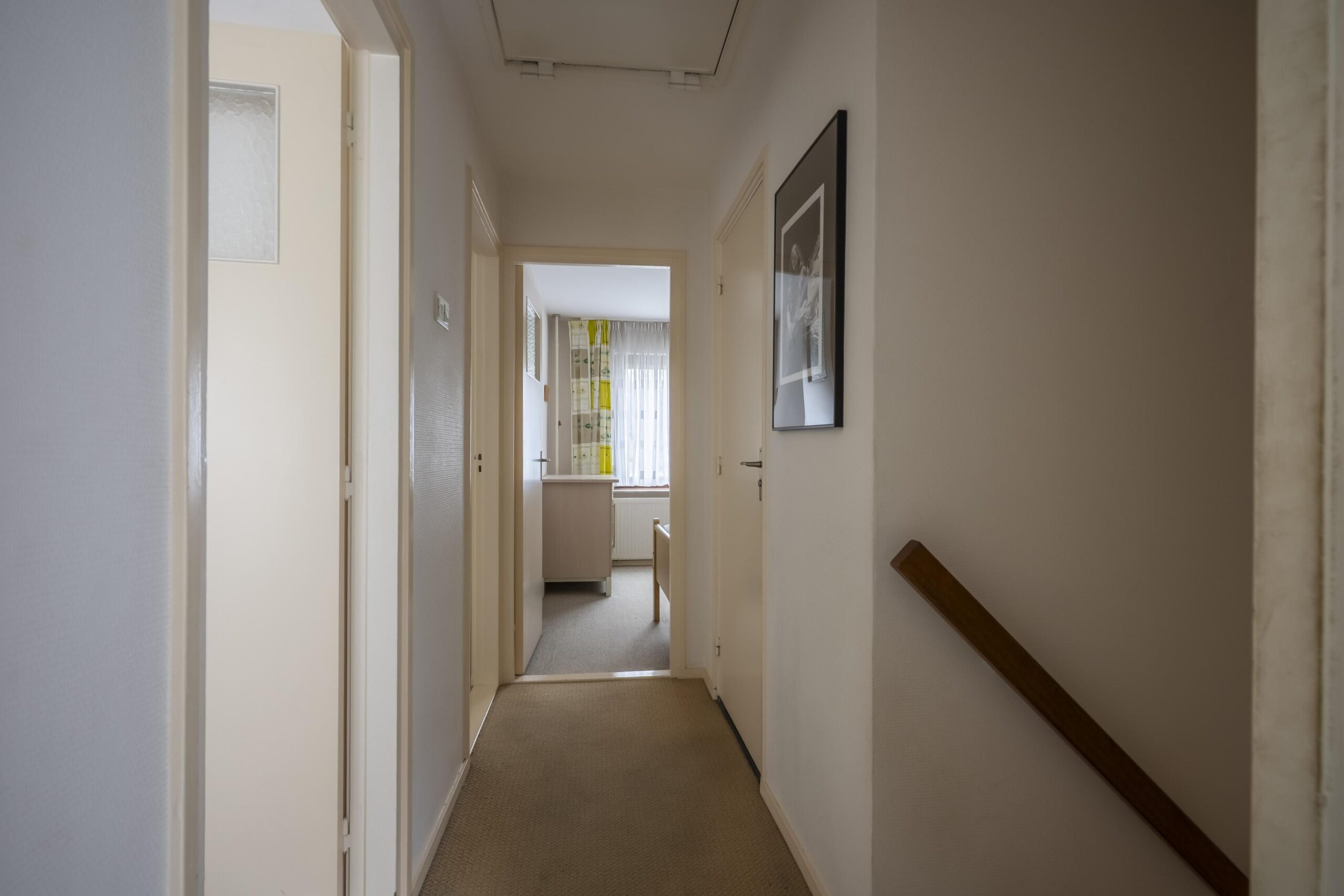 overloop met toegang naar vier slaapkamers respectievelijk 16 m2, 11 m², 10 m² en 6 m² groot, waarvan twee slaapkamers met inbouwkasten.