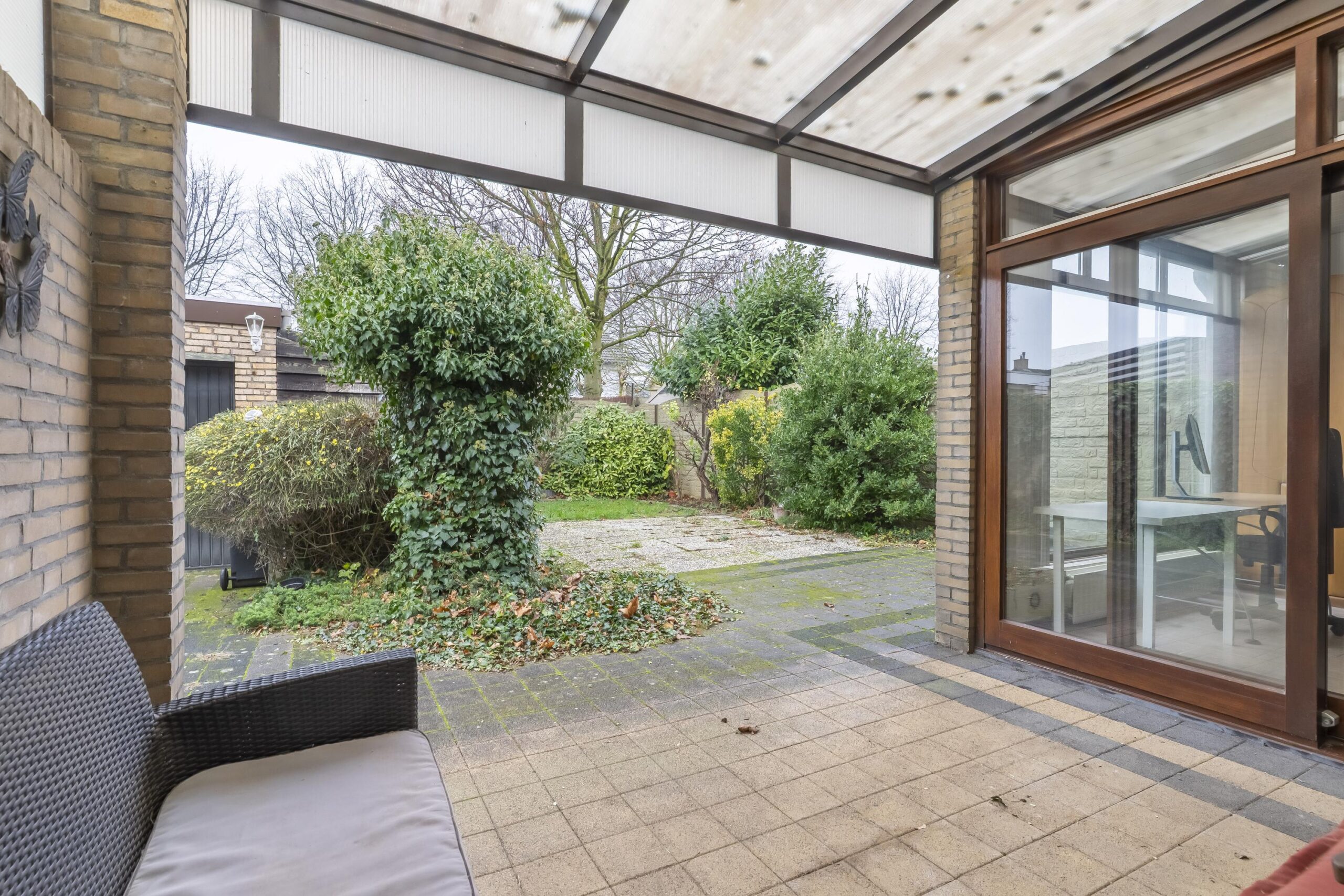 Het terras is deels overdekt middels een aluminium overkapping met polycarbonaatplaten. De tuin is ruim van opzet en biedt genoeg privacy. De tuin is geheel omsloten middels betonschuttingen. De vrijstaande garage is ca. 17m2 groot en voorzien van een kantelpoort.