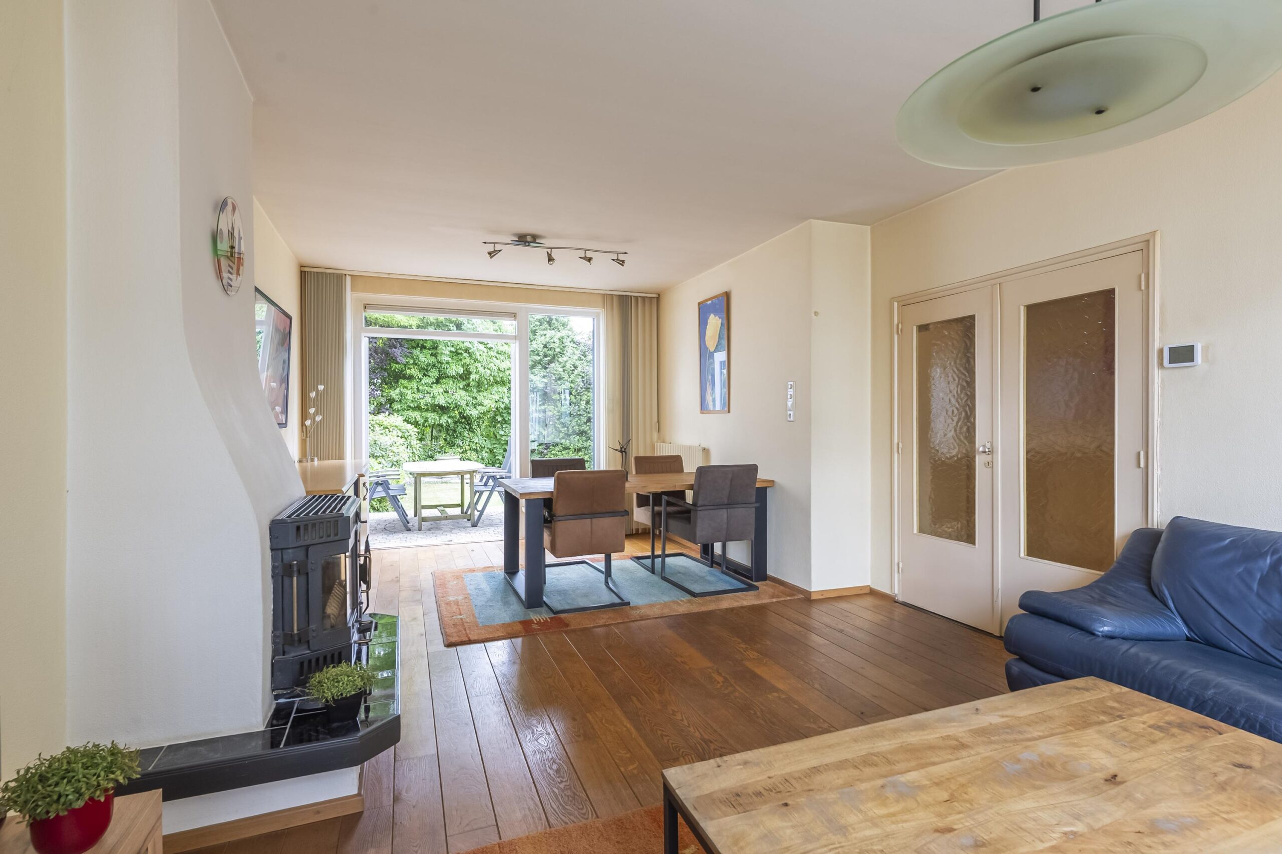 Via een trappenpartij aan de zijgevel toegang tot de entree. De ontvangsthal is voorzien van een plavuizen vloerafwerking. Geheel betegelde toiletruimte met zwevend toilet en fonteintje. openslaande deuren naar de woonkamer. De gezellige woonkamer is voorzien van een eiken plankenvloer, schouwpartij met een hout inbouwkachel. De openslaande deuren aan de tuinzijde bieden toegang tot het terras en fraaie tuin. Gesloten keuken met plavuizen vloerafwerking en toegang tot de tuin is voorzien van een kunststof keukeninstallatie in wandopstelling inclusief de navolgende inbouwapparatuur: oven, gaskookplaat, afzuigkap, vaatwasser en koelkast. De royaal en zonnig gelegen tuin is volledig omsloten en voorzien van een zij-ingang en een houten berging voor het opslaan van tuinspullen.