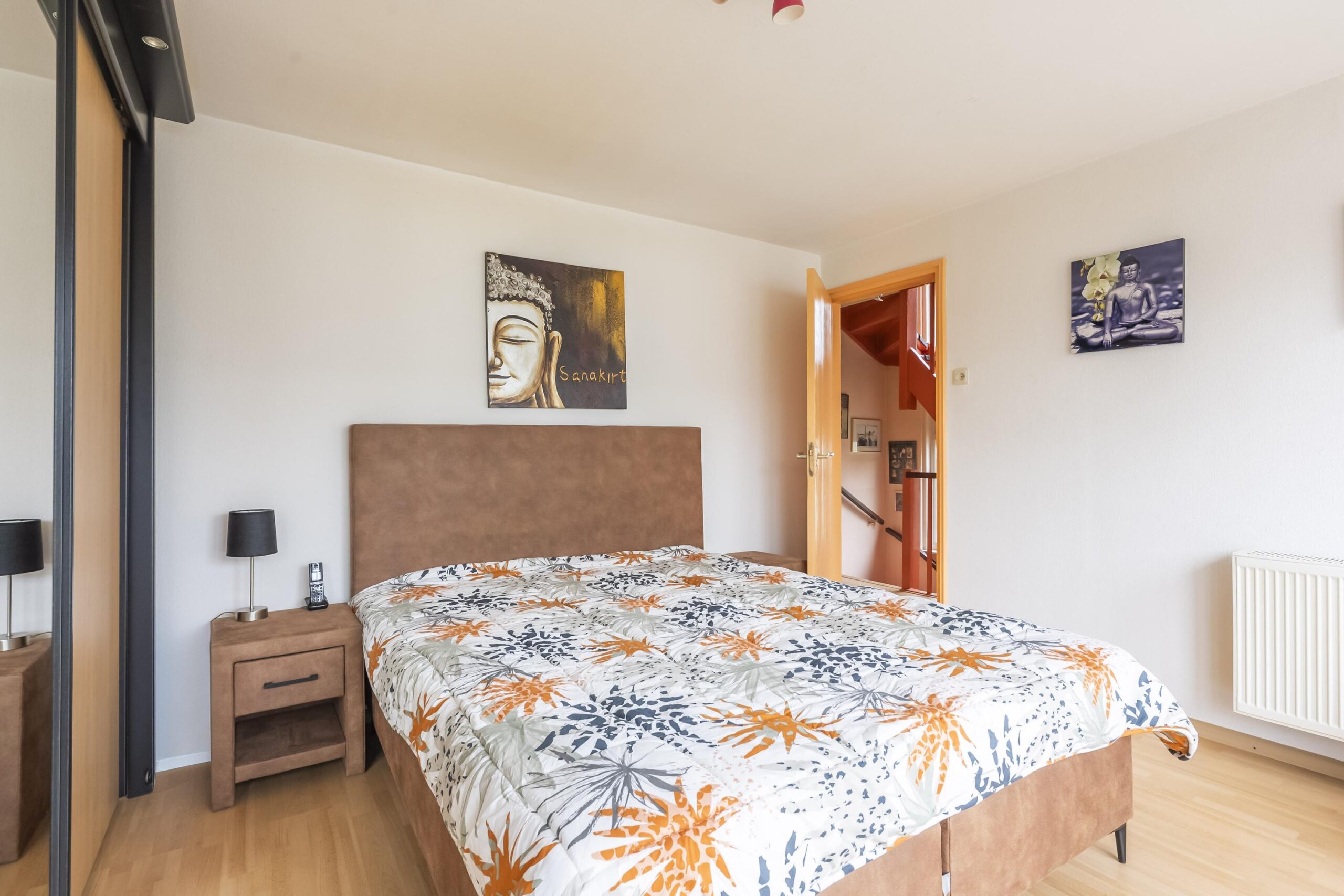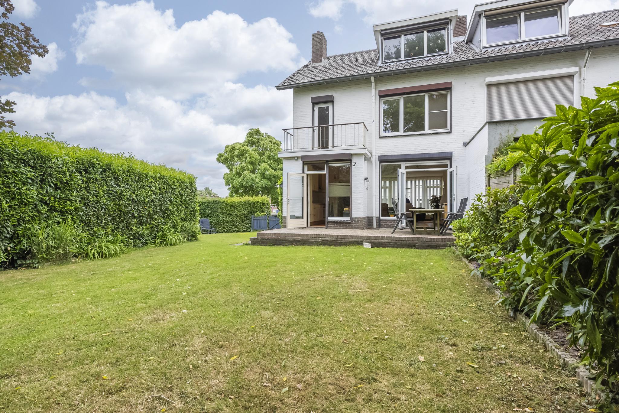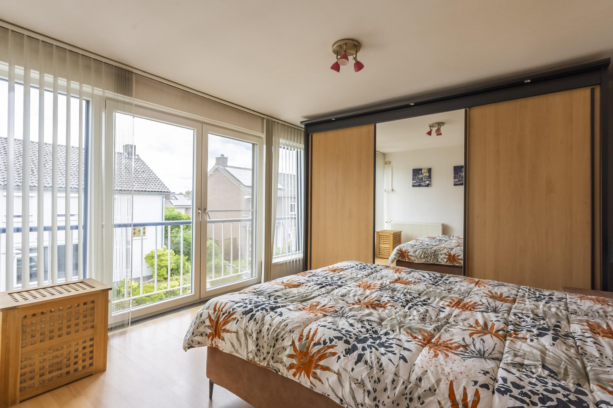 Overloop met toegang tot drie slaapkamers. De hoofdslaapkamer aan de voorzijde is voorzien van een frans balkon met dubbele openslaande deuren. Slaapkamer 2 en 3 zijn aan de tuinkant gelegen waarvan een slaapkamer toegang heeft tot het balkon. Geheel betegelde badkamer met ligbad, badkamermeubel en zwevend toilet.
