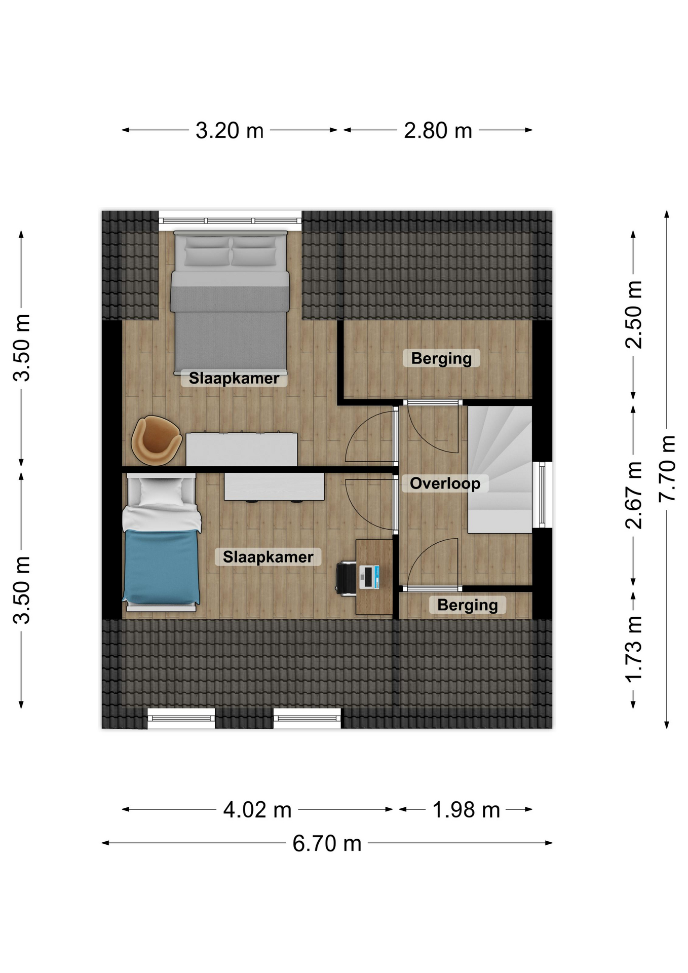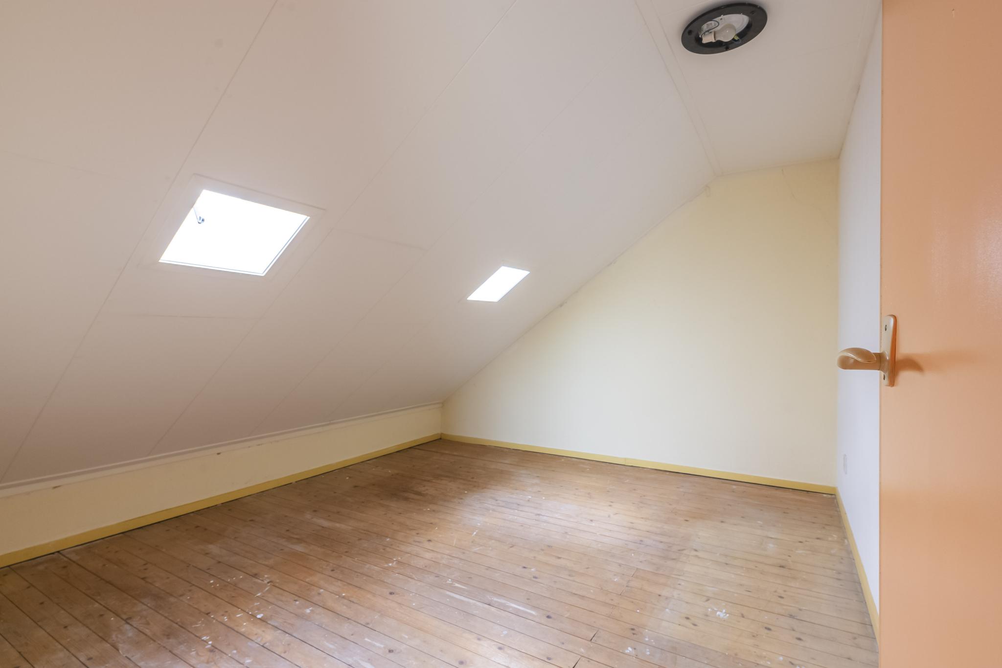 Vaste trap naar overloop met toegang tot twee zolderkamers. De slaapkamer aan de voorzijde is voorzien van dakramen en de kamer aan de achterzijde van een royale dakkapel. Twee zolderbergingen in de schuinte van het dak.