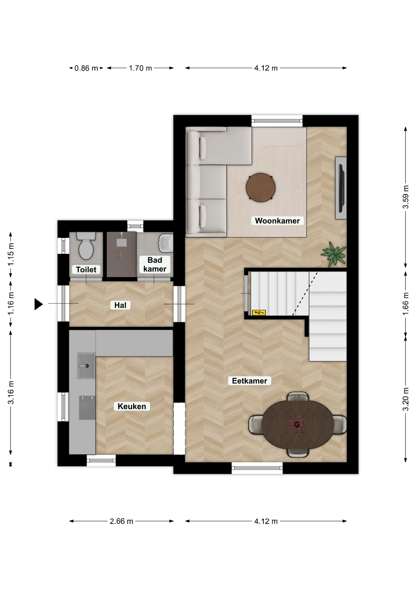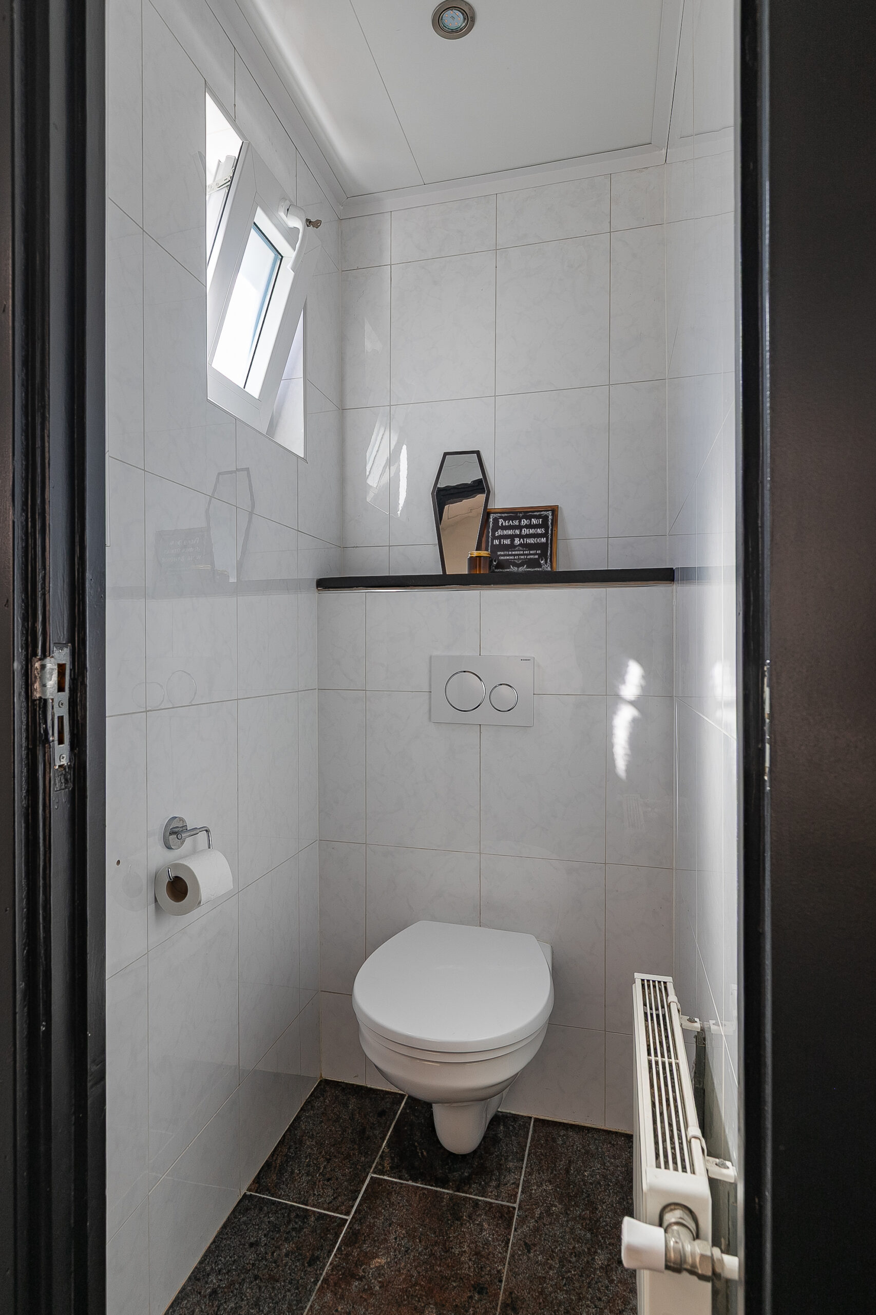 Via de onderhoudsvrije voortuin en een afsluitbaar hekje bereikt u de entree van de woning. De ontvangsthal is voorzien van een garderobe en geeft toegang tot een geheel betegeld, vrijhangend toilet met radiator en raampje. Ook bevindt zich op de begane grond een moderne, volledig betegelde badkamer, uitgerust met een inloopdouche, wastafel, raampje en mechanische afzuiging.