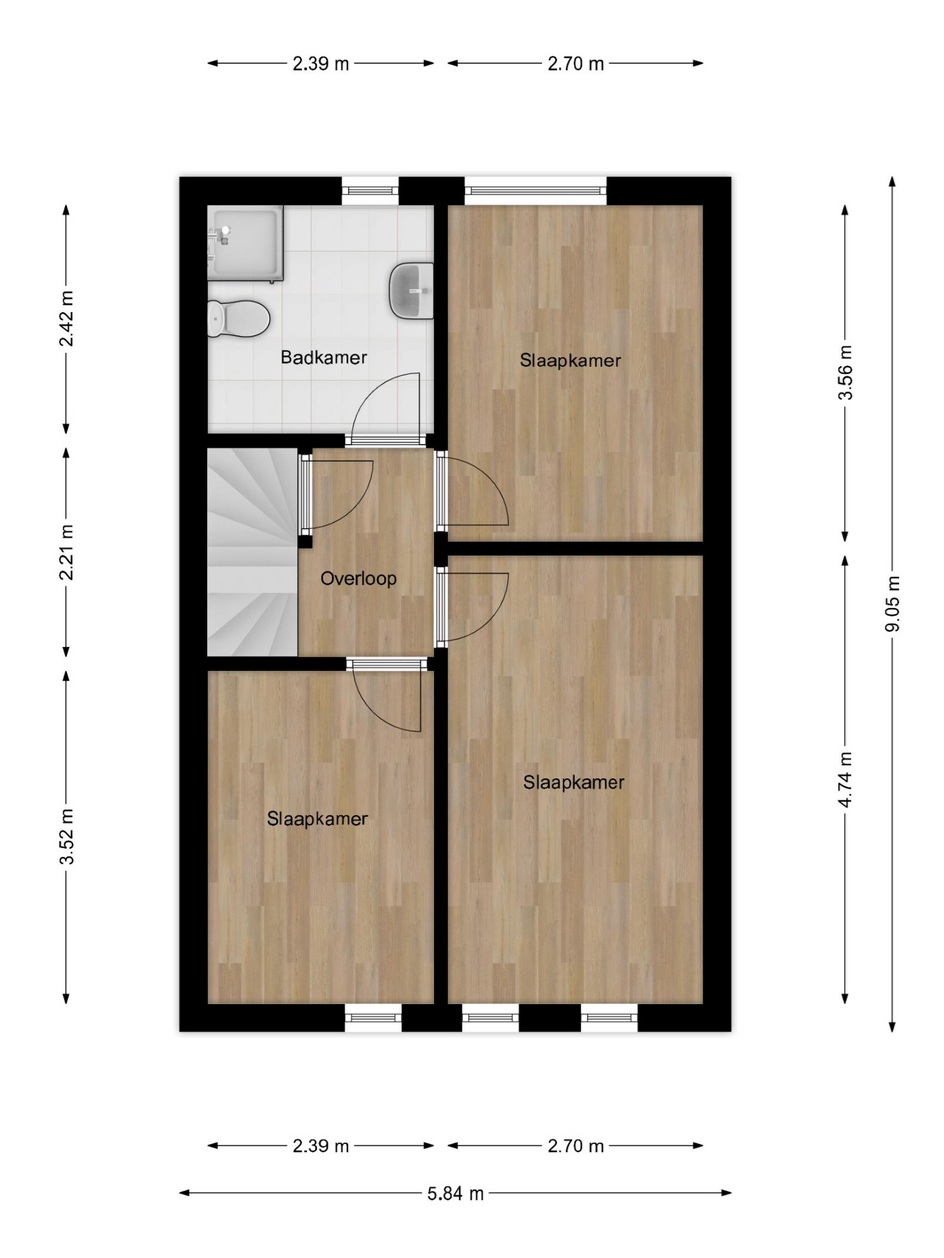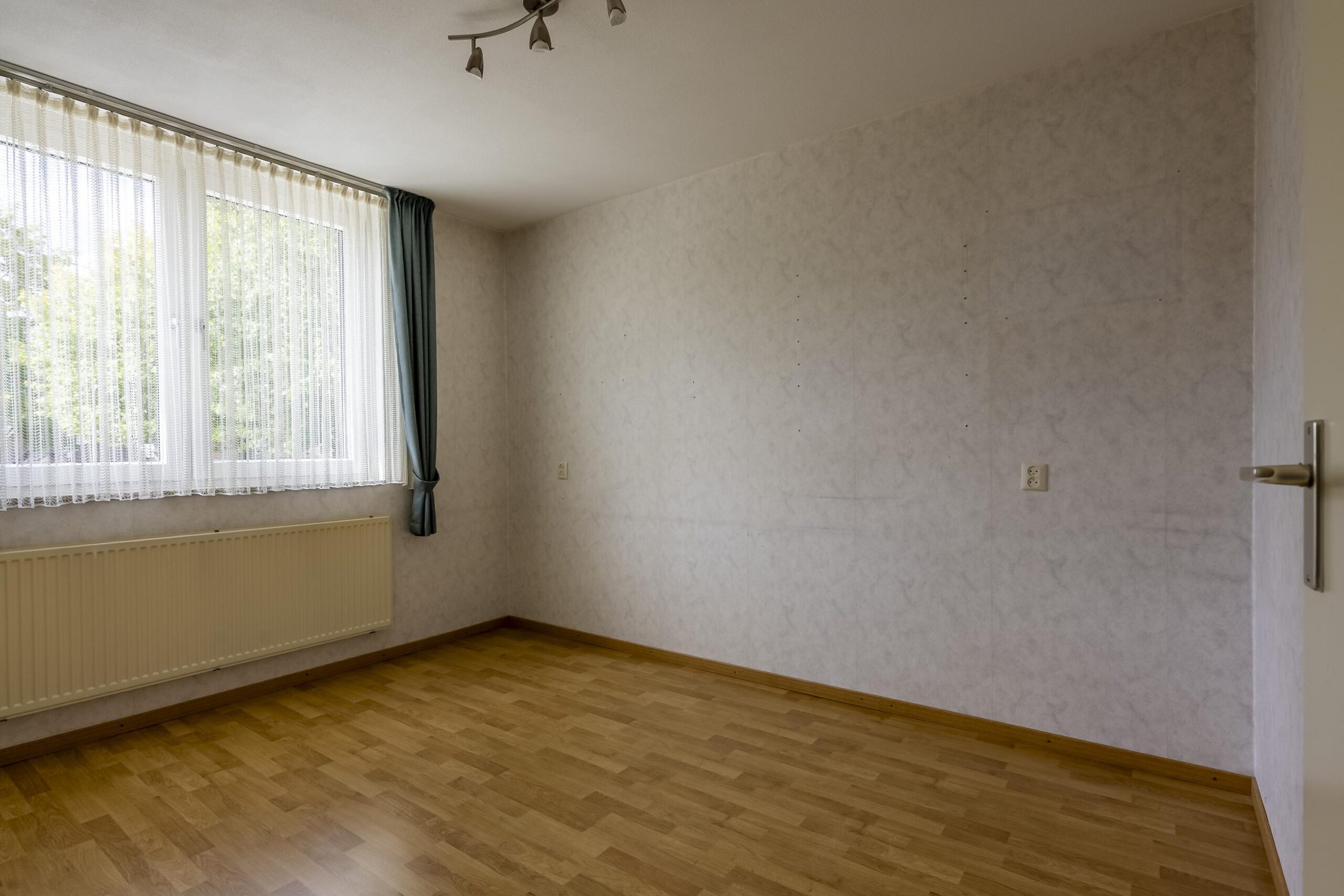 Overloop, drie slaapkamers, allen voorzien van een laminaatvloer, en de betegelde badkamer. De badkamer heeft een douche, badmeubel, 2e toilet en een wasmachine-aansluiting.